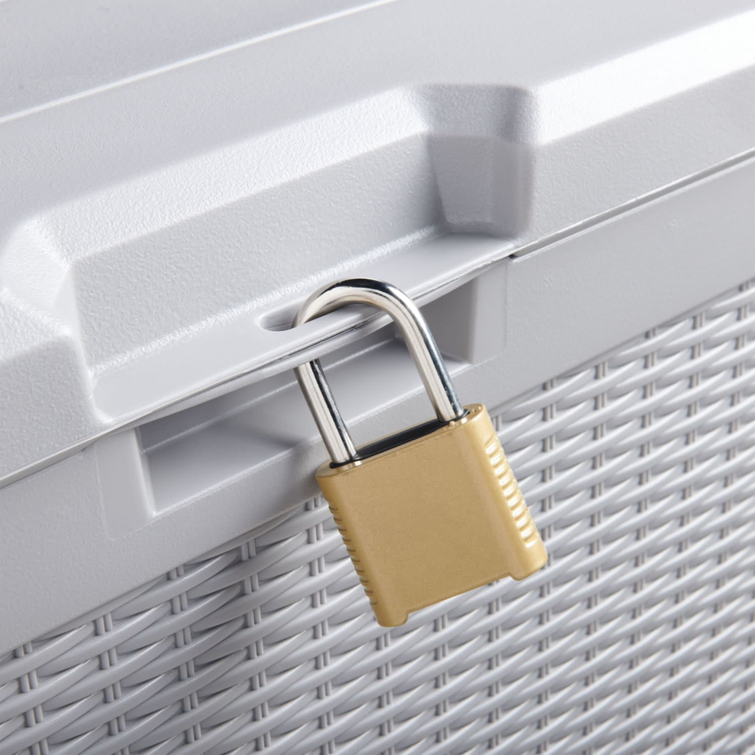 The deck box has 67% fewer parts for a faster and easier assembly compared to other extra large deck box Rubbermaid® models Basket weave pattern coordinates with outdoor furniture and décor. Product weight: 48 lbs Product dimensions: 58 x 11 x 31.5 Durable double wall construction and metal lid support prevents warping caused by weather or weight. Flat, textured lid doubles as an end table for holding drinks and snacks. Provides a location to store large outdoor items such as a patio umbrella, large patio cushions, firewood, and more. Heavy duty, durable resin will not rot or rust, providing protection during all seasons.