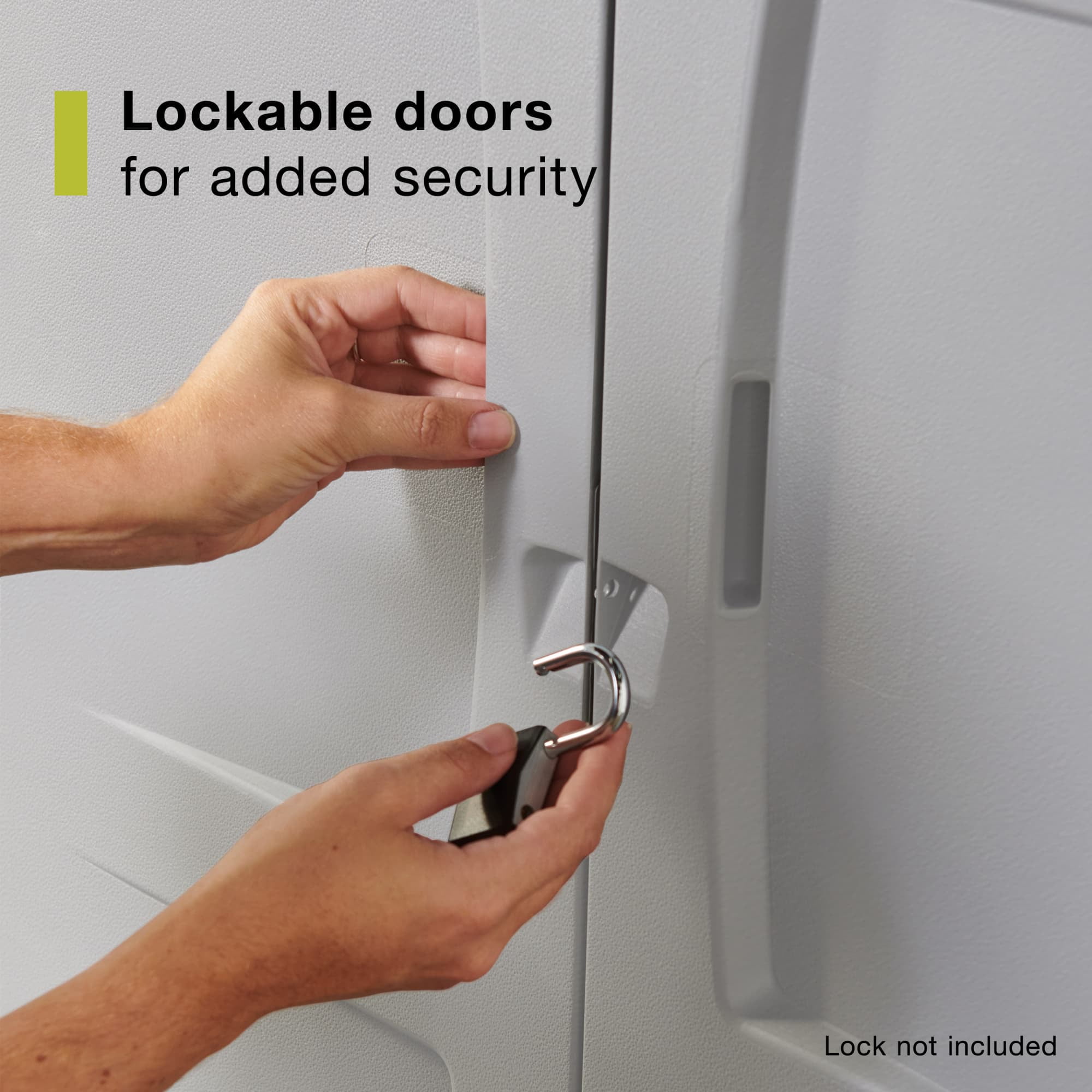 **Rubbermaid Full Double Door Garage Cabinet** Storage Capacity: 27 cubic feet Dimensions: 36″(W) x 18″(D) x 72″(H) Durable: leak-resistant, dent-resistant, weather-resistant Unique, snap together cabinet design combines quick and easy assembly with strength and durability. No tools required Holds a maximum of 690 lbs Four shelves included Shelving cannot be adjusted or removed Lockable doors keep valuables out of sight and hazardous chemicals safely away from children. (Lock not included) Use in your garage, basement or workshop Maintenance Free: no rot, no rust, no problems Double door entry . Part #: FG708300MICHR Warranty: 1-year Rubbermaid Warranty