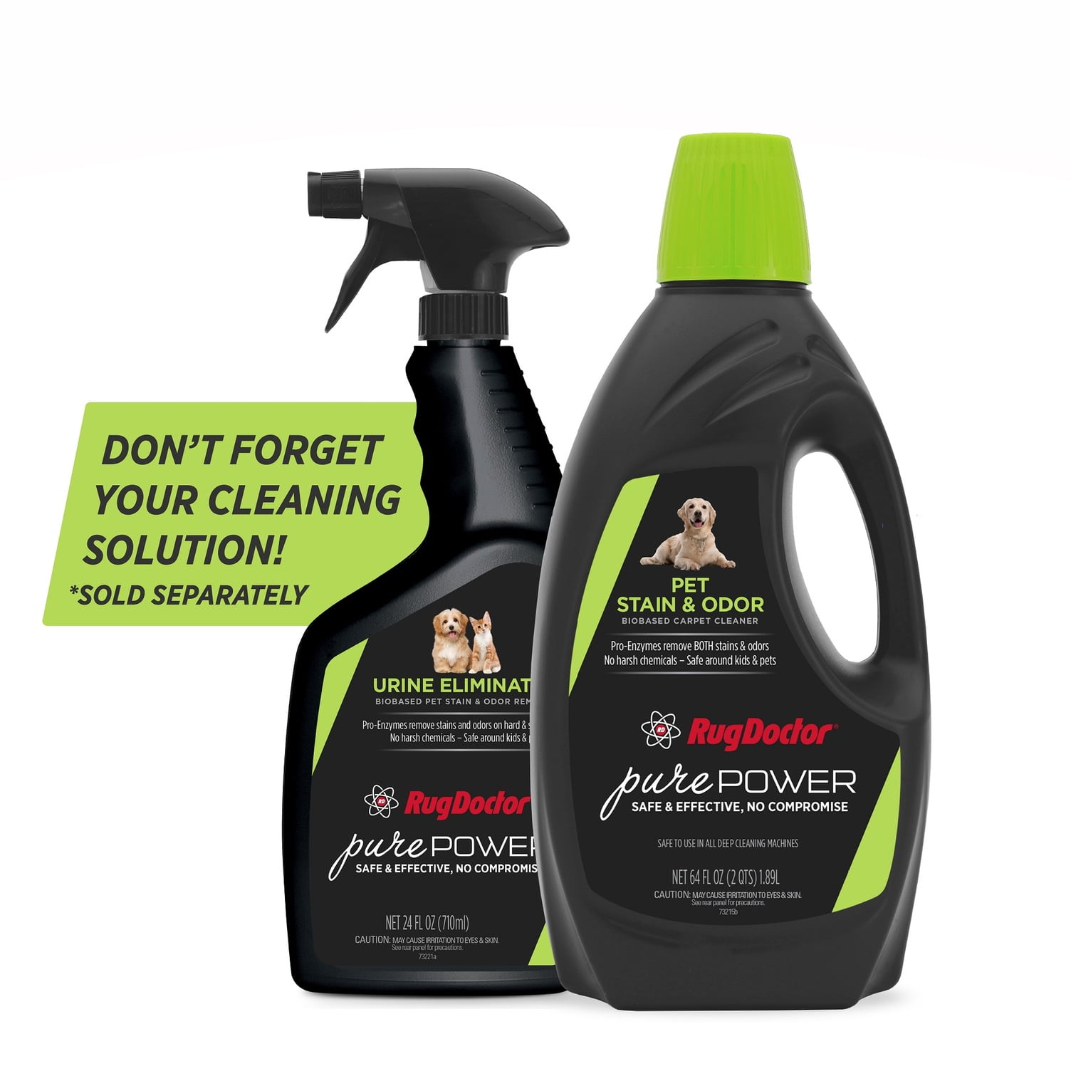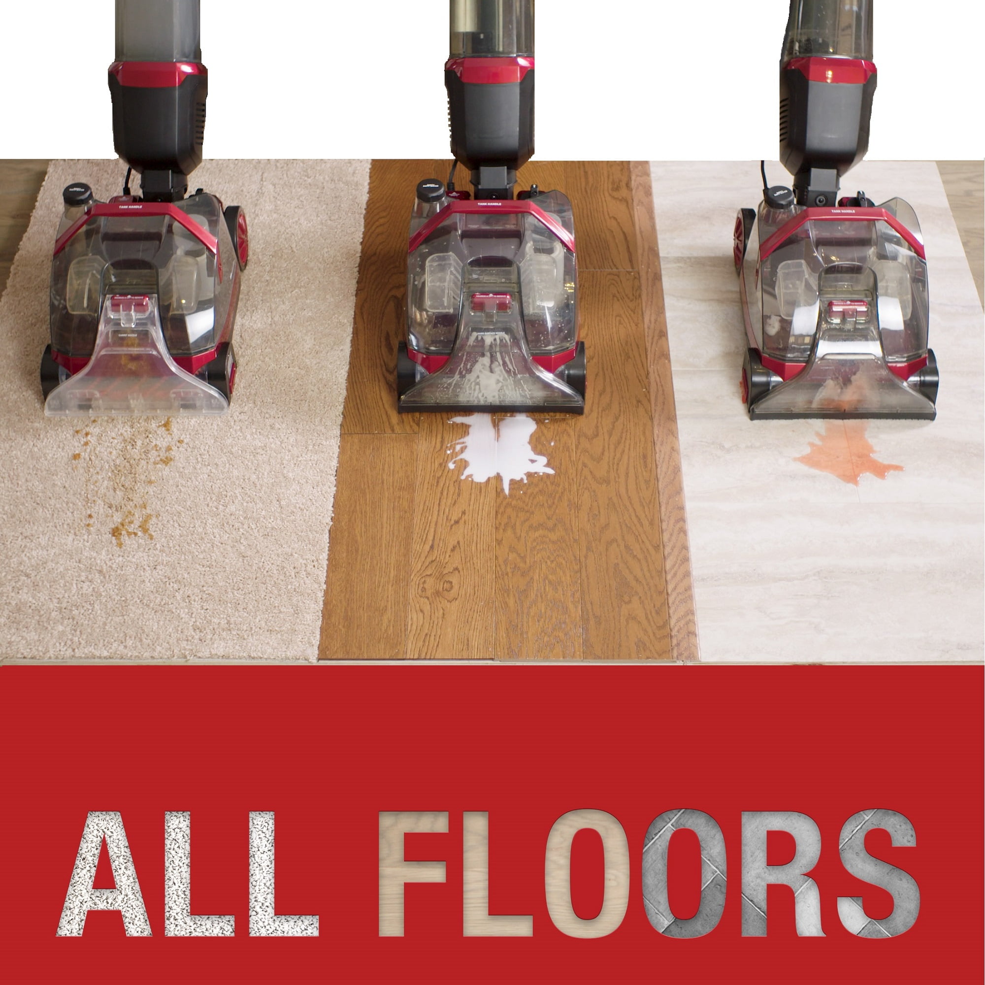 Rug Doctor FlexClean All-In-One Floor Cleaner; Includes Machine, 9-oz. All-In-One Solution and Tool Storage Bag; Versatile Machine with Powerful Suction Deep Cleans Both Carpet and Sealed Hard Floors Replaces single-function machines like deep carpet cleaners, vacuum cleaners, mops and steam mops Beyond carpet, beyond clean. First ever true all-in-one floor cleaner easily deep cleans both carpet and sealed hard floors. Seamlessly clean all floors with one machine and one cleaning solution. Includes: FlexClean Machine, one 9-oz. trial sized Rug Doctor All-In-One Concentrated Floor Cleaner solution formulated to clean both carpet and hard surfaces, and a Tool Storage Bag. The easy to use machine cleans back and forth like a vacuum. The 21-lb. lightweight design and pivoting handle allow the 12-inch cleaning path to clean large areas and reach small spaces with ease. Features two different cleaning nozzles: one penetrating rotating brush for deep cleaning carpets and rugs, and one rubber squeegee for cleaning hard floor surfaces. Optimized spray rates deliver the right amount of solution for each floor type and cleaning need. Quickly adjust the three spray settings for deep carpet cleaning, quick dry carpet cleaning and hard floor cleaning. Deep Carpet Clean setting sprays solution below the surface deep into the carpet, allow several hours to dry; Carpet Quick Dry setting, ideal for routine cleaning, reduces dry time to about 1 hour. Hard floor setting sprays less water and uses powerful suction to extract dirty water. No dimensional stability changes, no surface scratching, no warping and safe to use on a daily basis. Powerful suction safely removes and dislodges tough ground-in dirt, stains, spills, odors, grime, oil, muddy spots, urine, feces, food, drinks spills, mold, mildew and other soils. Innovative, transparent, two-tank system design keeps clean and dirty water separate, making filling and disposing of water easy. Just click the button and lift tanks away with ease and convenience. Use the FlexClean as needed to refresh, deodorize and deep clean hard floors and carpets. Includes two key digital indicator lights that quickly alert user if brush roll jams or solution runs out. Backed by a 2-year limited consumer warranty and certified by the Carpet and Rug Institute (CRI) for superior cleaning performance; guaranteed to not void carpet warranty.