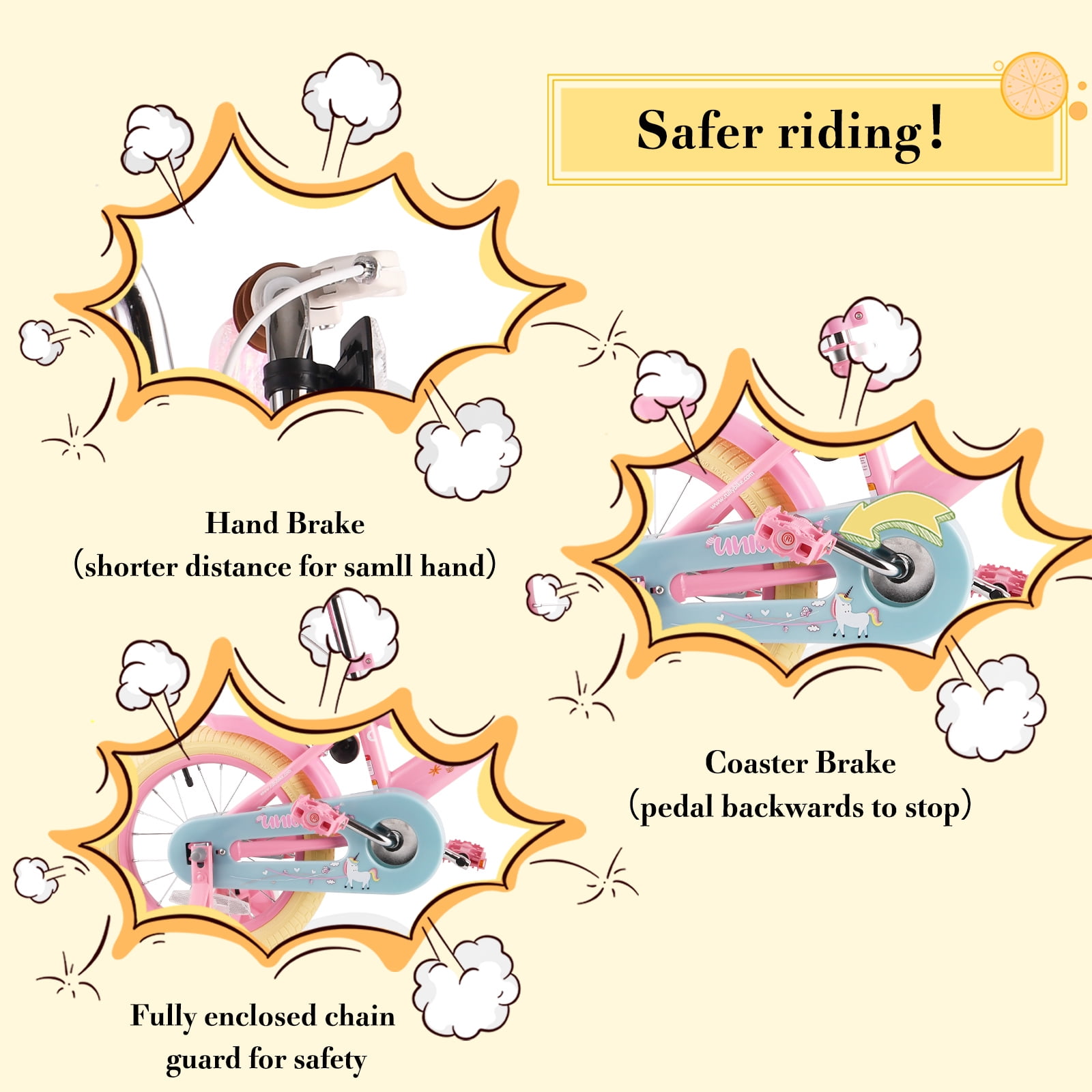 【DESIGNED FOR CHILDREN】 Rully kids bike with soft handlebar grips, cute doll bike seat, color-matched reflectors and bright streamers, adding more fun to their riding! Equipped with a bell make it safe for your girl who first plant seeds of riding. 【SAFE & DURABLE】 Equipped with both rear coaster brake and front caliper brake provide ample braking power. The enclosed chain guard prevents your child from touching the chain. Removable training wheels allow the child to ride more smoothly and safely. 【COMFY DESIGN 】 The sturdy carbon steel frame provides long-term use and makes the kids bike easy to ride, non-slip resin pedals, front and rear reflectors, offering a safe and steady riding experience. Tool free adjustable saddle allows the bicycle to grow with your kid. 【EASY TO INSTALL】 The bike is 85% assembled, only a few parts need to be added to the bike. Assembly tools and simple instructions are given. If you have any questions about bicycles, please feel free to contact us at any time 【CHECK YOUR SIZE】 12 inch wheels ideal for riders 2-4 years old or 32-41 inches tall; 14 inch wheels ideal for riders 3-5 years old or 36 – 47 inches tall; 16 inch wheels ideal for riders 4-7 years or 41-53 inch tall.
