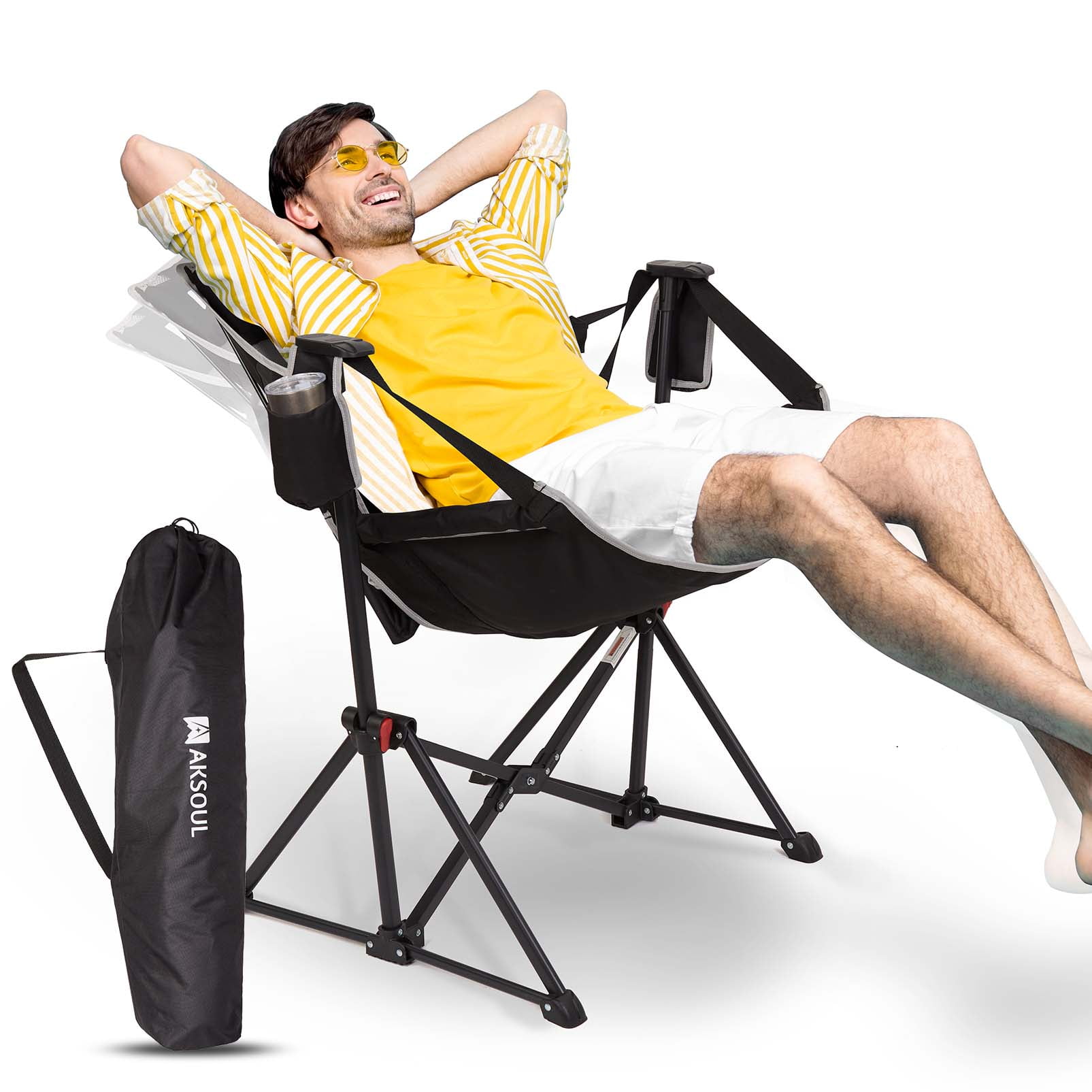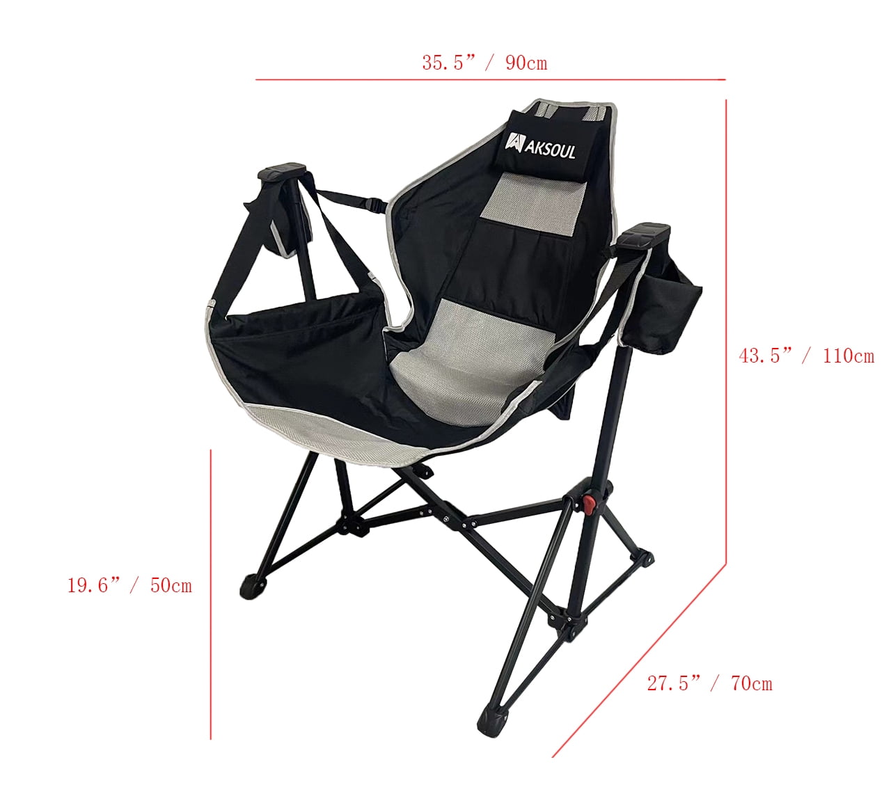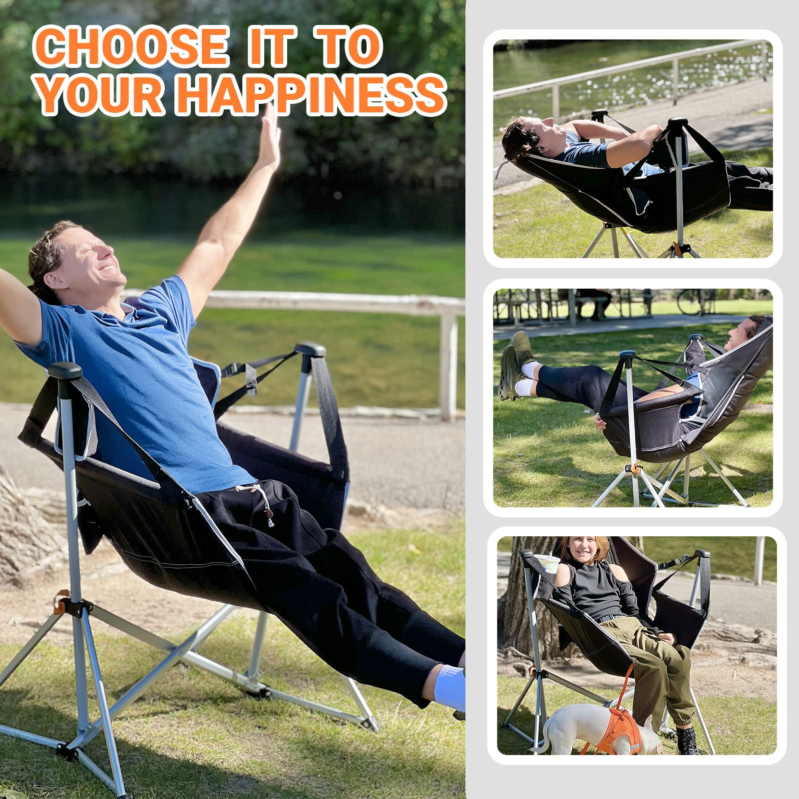 Unique Hammock chair: with the new hammock camping chair style, you can sit or recline freely. You can freely adjust the angle of the backrest by just leaning back. Swing camping chairs allow you to enjoy the feeling of swinging outdoors even without long ropes and trees Robust frame: unlike ordinary steel frames, rocking camping chairs are made from a combination of high-strength 6063 aluminum alloy and thick steel, which is stronger but lighter. Triangular cross bracing adds stability for easy rocking Better comfort: the hammock lawn chair is made of durable mesh padded fabric that is not only soft and comfortable, but also breathable. Padded pillow supports your head for better comfort