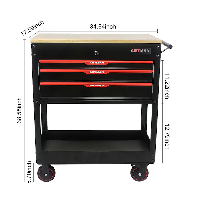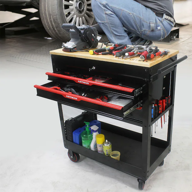 - Be equipped with 3 drawers and a top box to hold varieties of tools