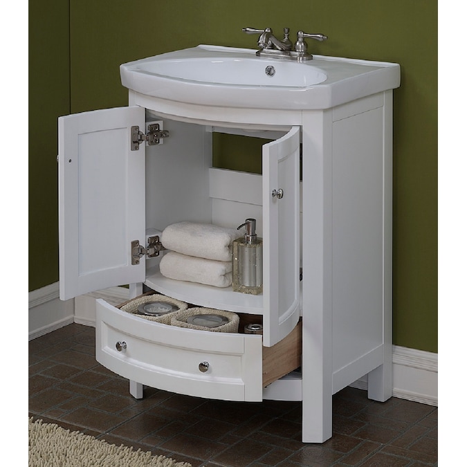 Beautiful and functional is the all wood constructed Bellina bathroom vanity by Runfine with elegant white finish and comes complete and fully assembled. The vanity includes 2 recessed slow-closing doors and 1 slow-closing drawer along with Chrome hardware. The white vitreous top and basin have a gloss finish and is easy to maintain and clean. The bow front curved transitional look will add beauty and sophistication to any bathroom and is an excellent small space solution for additional storage.