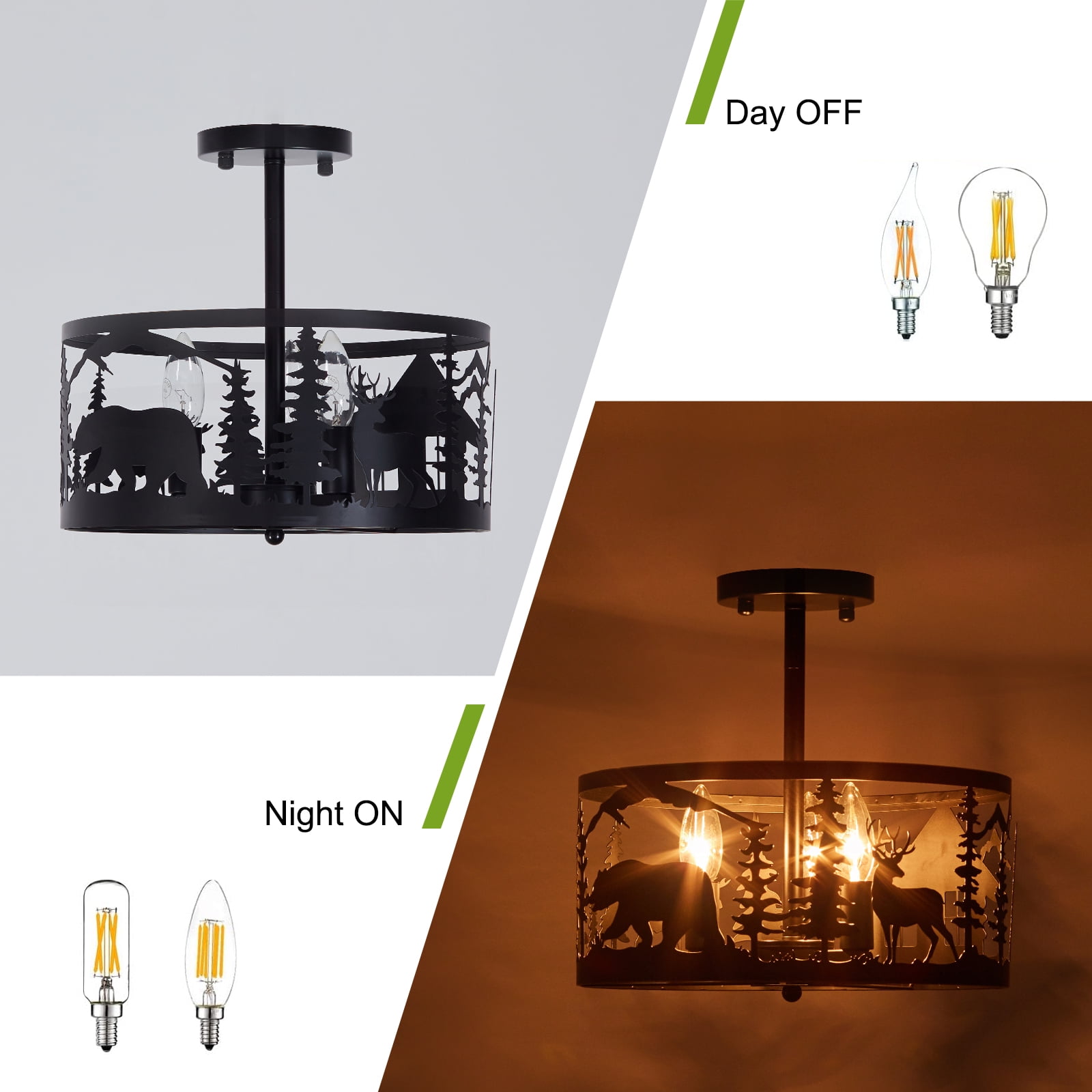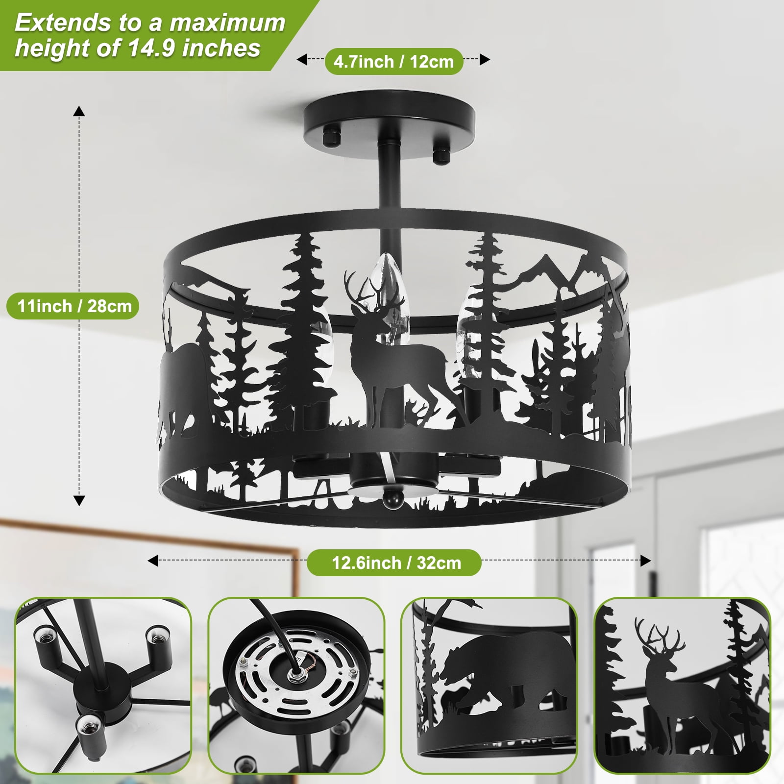 【 Elegance Appearance】Crafted from metal with a sleek black corrosion-resistant finish, this chandelier showcases a unique deer bear tree design, adding a touch of sophistication to any space 【 E12 bases&Dimensions】This flush mount close to ceiling light size is 12.6” in diameter and 11” in Height. The longest height can be adjusted to 14.9”, the weight is approx.3.2 lb, and Compatible with three E12 base bulbs (Max 60w) 【Easy to Install】All hardware required for the installation of this modern light fixture is included in the package. For safety, consult a professional electrician and carefully read the instruction manual before installation 【 Wide Applications】Perfectly blending rustic and industrial elements, this light fixture effortlessly enhances the aesthetic appeal of your interior. black metal finish with a round shape, making it ideal for log cabins, kitchen islands, entryways, bedrooms, and living rooms