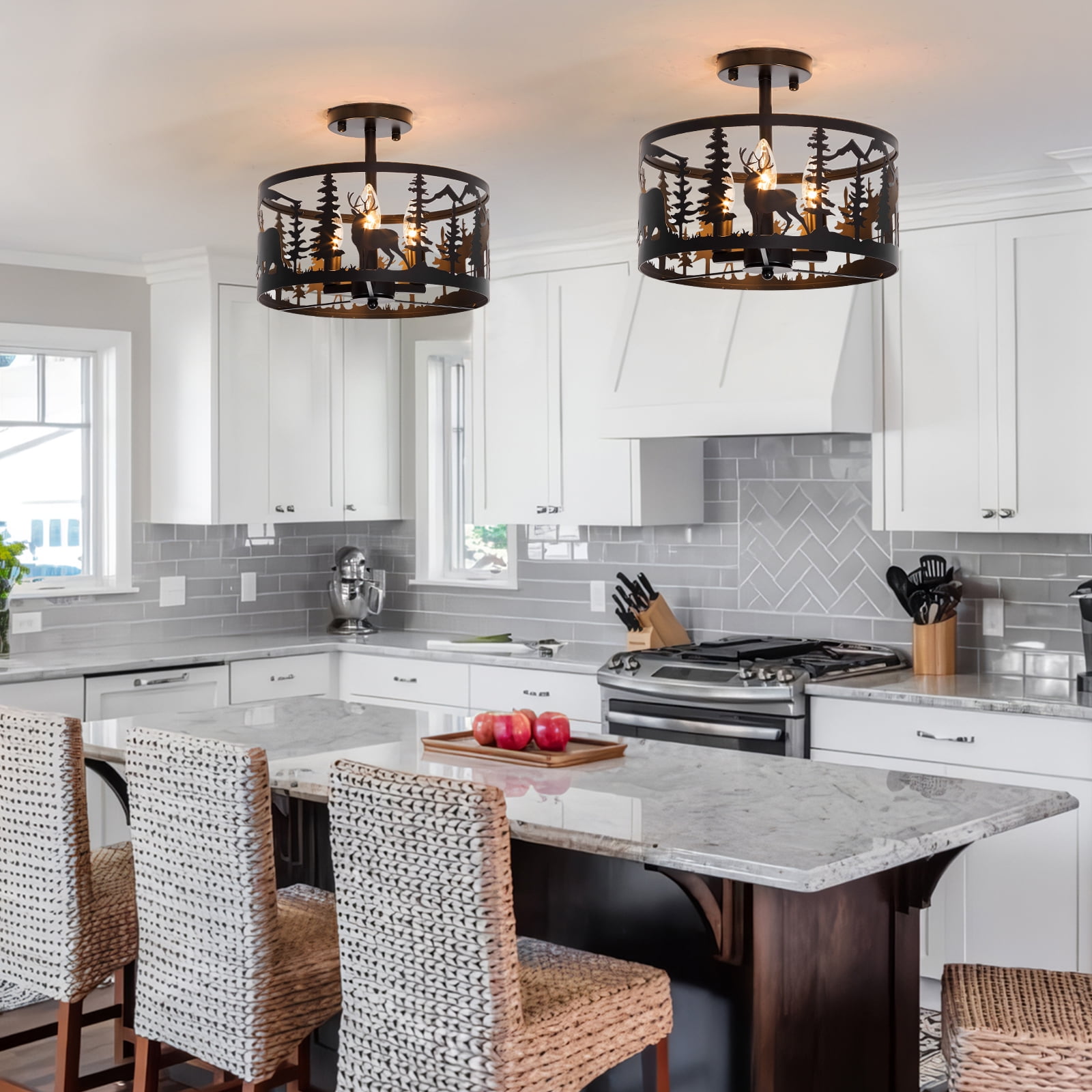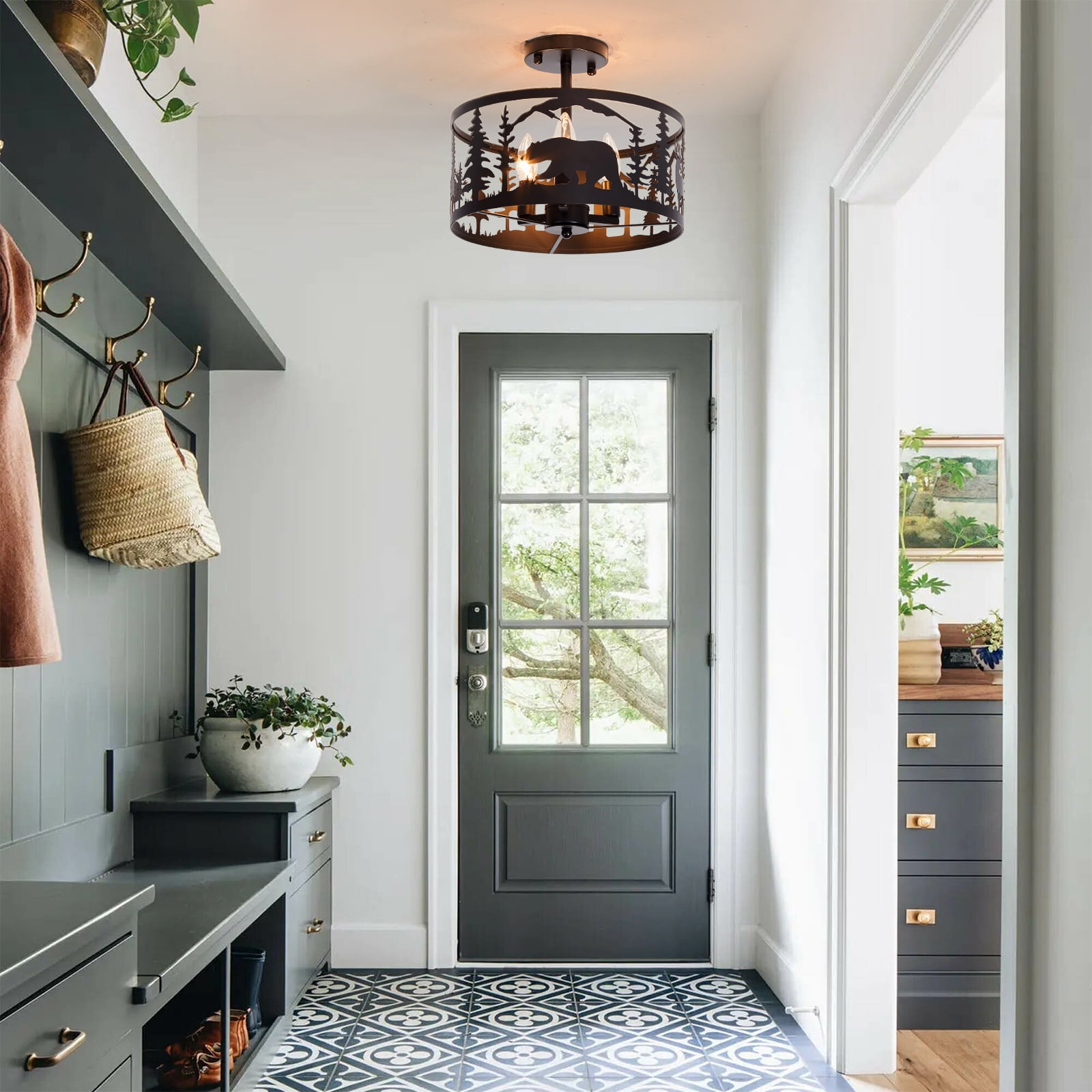 Rustic Farmhouse Semi-Flush Mount Ceiling Light Fixture,3-Light E12 Base Black Round Metal Light Fixtures for Kitchen, Hallway, Living Room, Industrial Style with Deer, Bear, and Tree Design