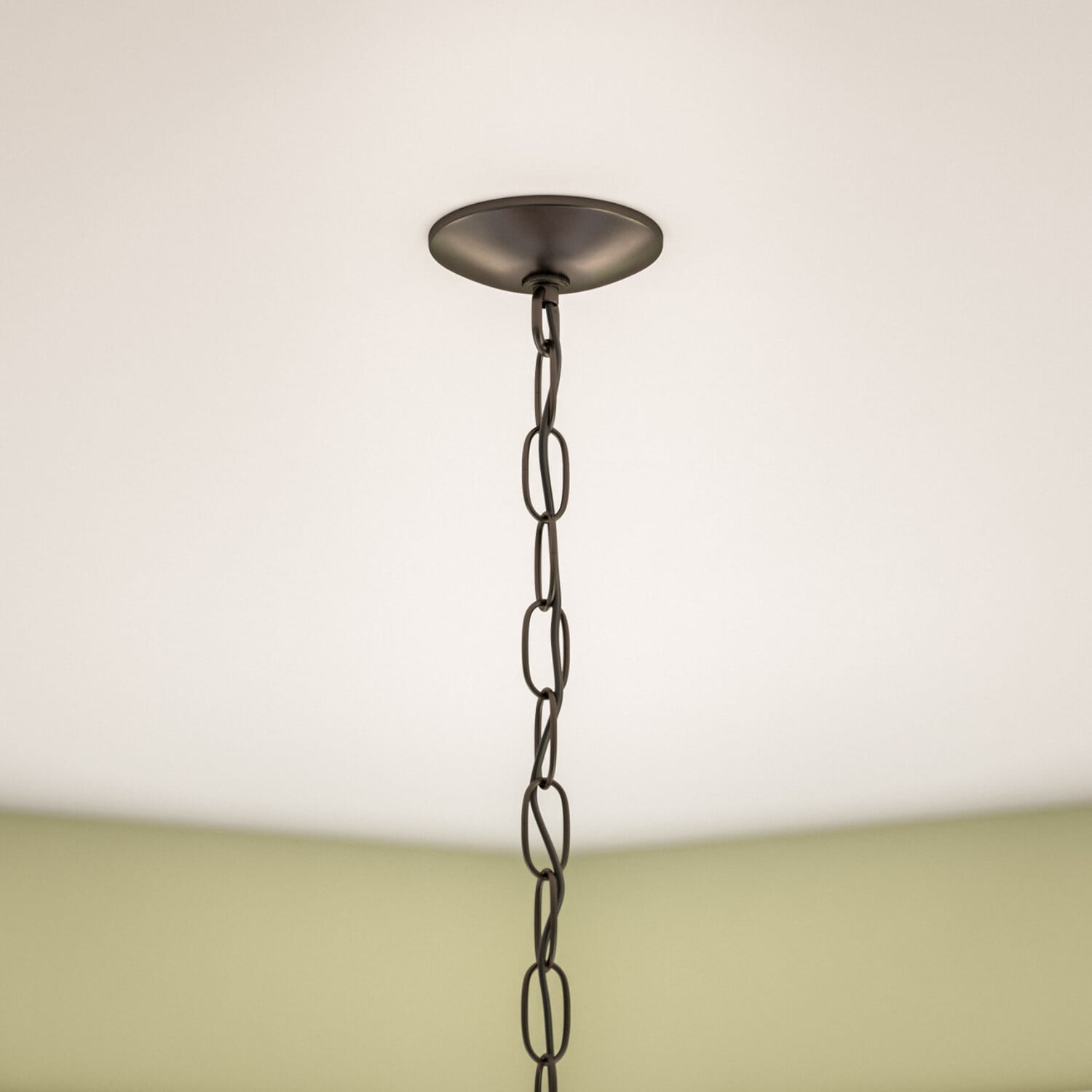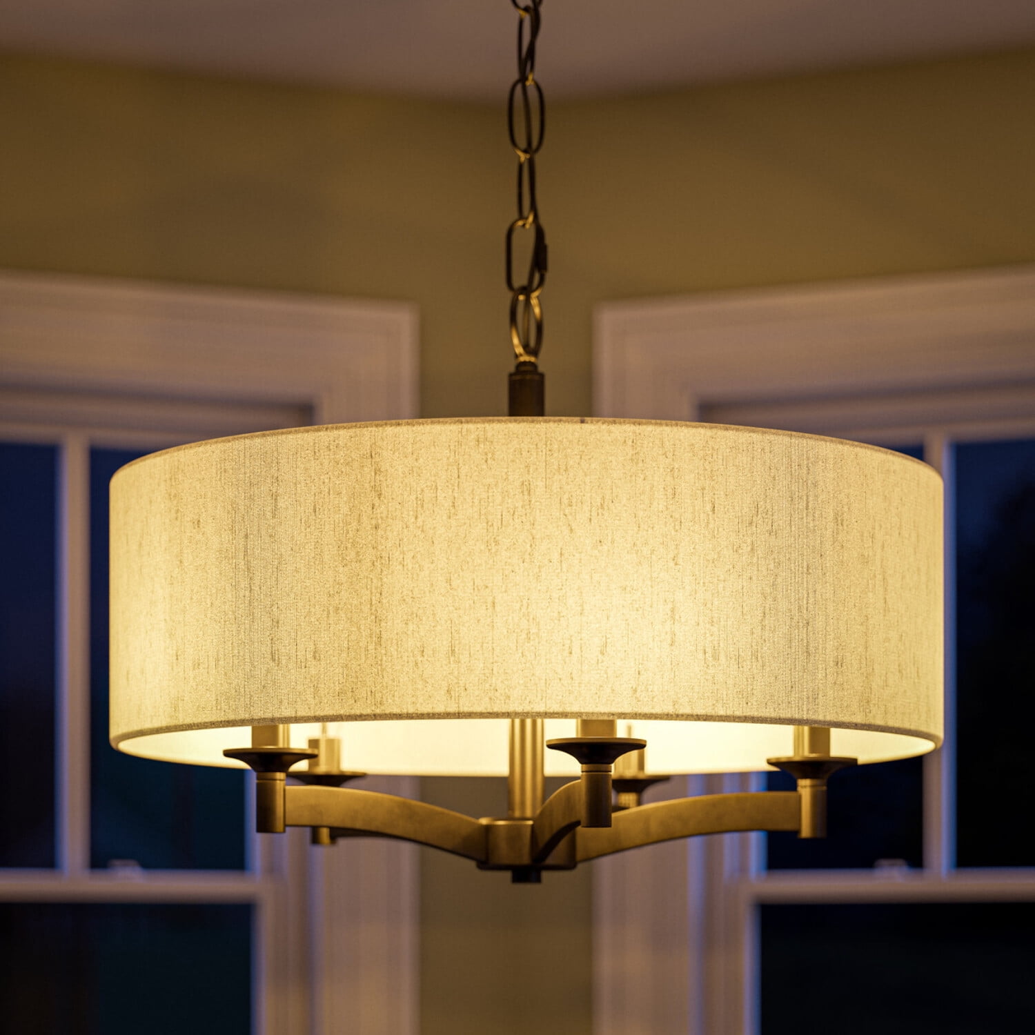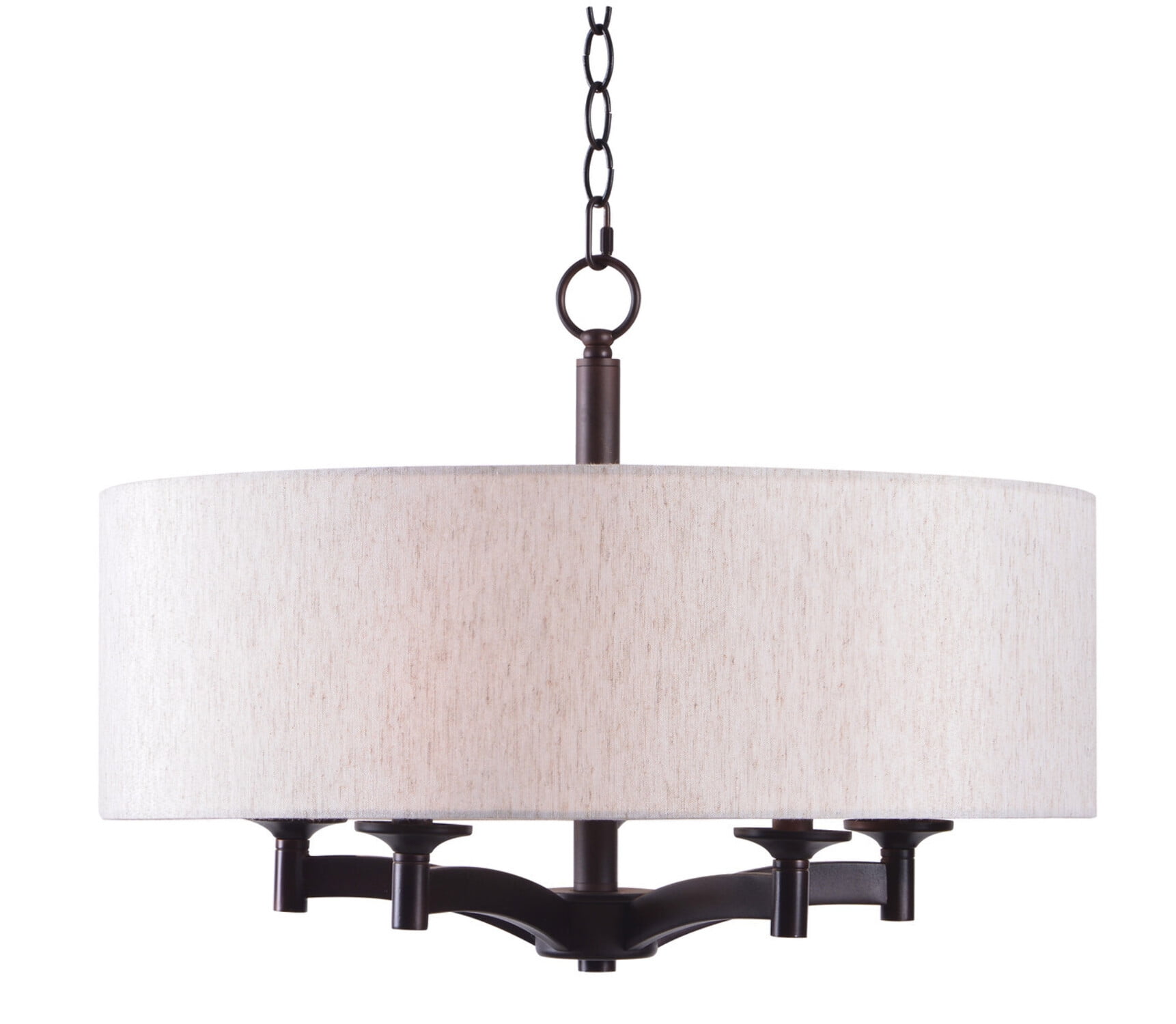 Modern farmhouse transitional 5 light drum pendant Oil rubbed bronze finish lends a traditional touch Light taupe drum shade gently diffuses light from the 5 candelabra bulbs Vaulted and sloped ceiling compatible with quick link chain Indoor location only