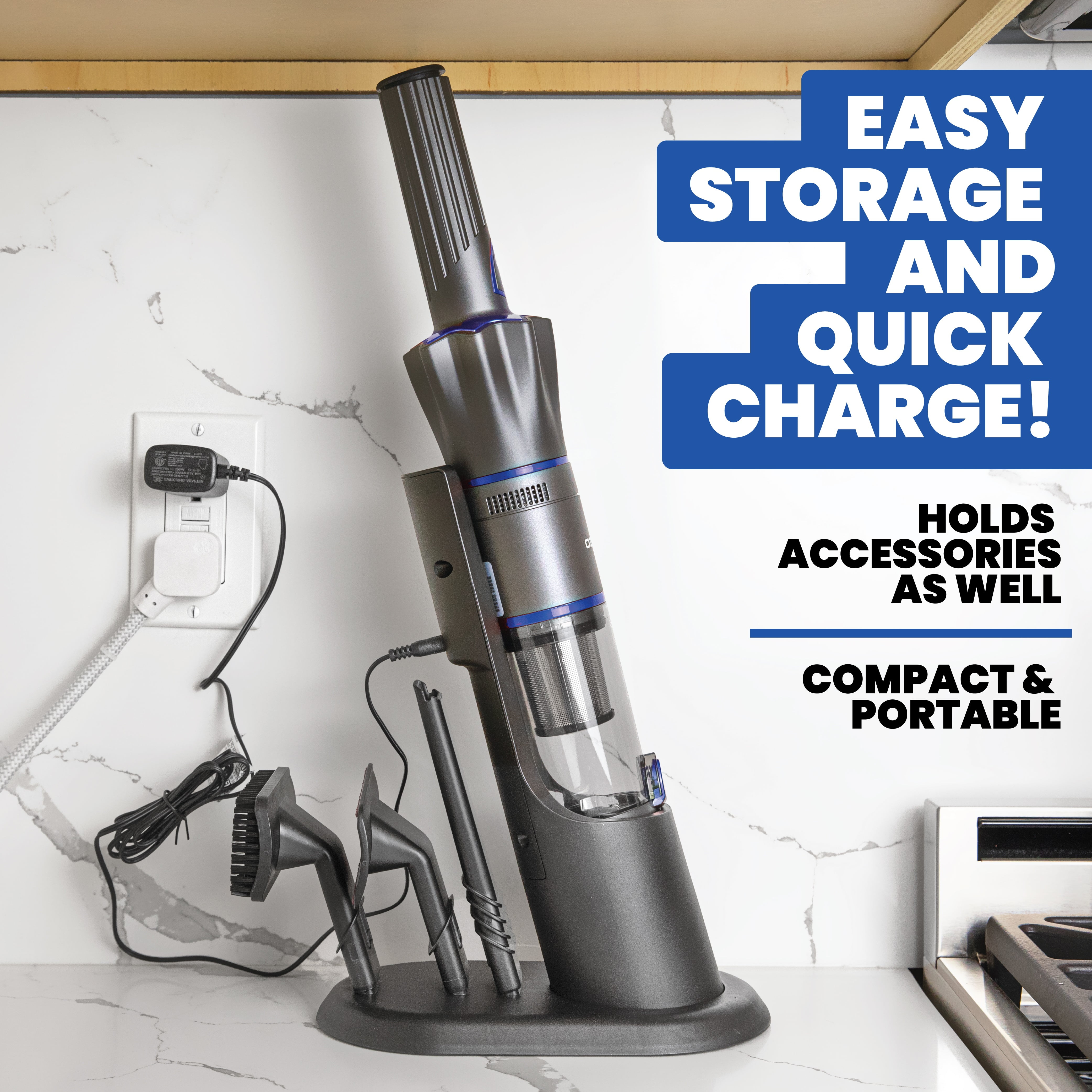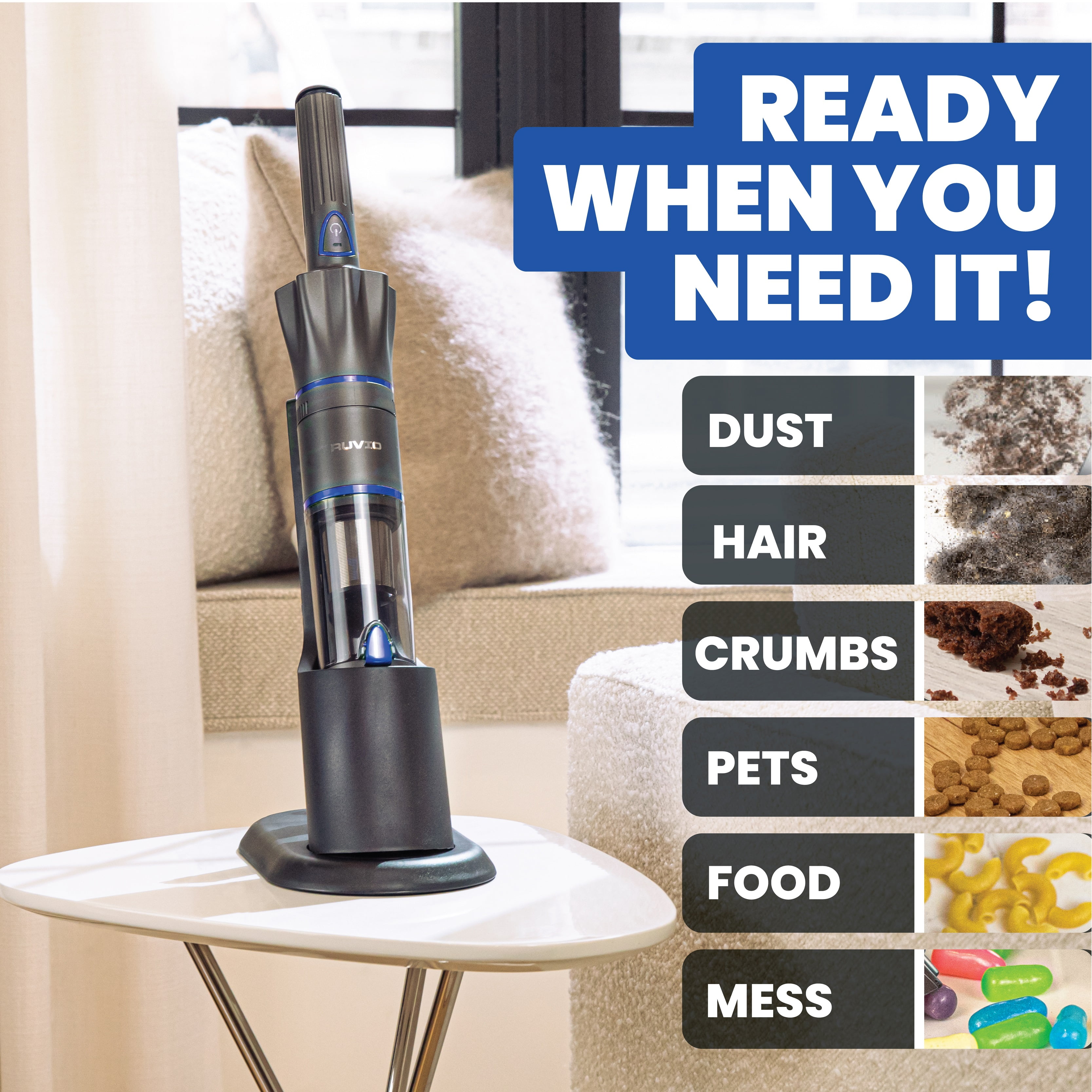 Ruvio Pro Cordless Handheld Vacuum Cleaner Set: Includes: 1x Ruvio PRO portable vacuum unit 1x 4.5W charging dock station 1x 6-inch crevice nozzle attachment 1x extra replacement HEPA filter 1x user manual for easy setup and maintenance Ultra-Strong Suction Power: Features a powerful brushless motor capable of cleaning dust, dirt, and debris from various surfaces, including carpets, hardwood floors, and tight spaces. Lightweight & Ergonomic Design: Weighs only 1.2 lbs, making it easy to maneuver for all ages. The ergonomic handle ensures a comfortable grip during extended cleaning sessions. 2-Stage HEPA Filtration System: Captures fine dust and particles, making it ideal for maintaining a cleaner indoor air quality. The filter can be easily replaced every 6 months. Rechargeable Battery with Quick Charging: Powered by a 2,500 mAh Li-ion battery that fully charges in 2.5 hours, providing up to 15 minutes of uninterrupted cleaning time. Convenient Crevice Nozzle for Hard-to-Reach Areas: Easily clean narrow spaces such as between couch cushions, car seats, and other tight spots with the detachable crevice nozzle. Quick & Easy Dust Disposal: Features a one-click quick-release dust container for effortless emptying and maintenance. The bagless design keeps cleanup simple and hassle-free. Charging Dock with Accessory Storage: The dual-purpose charging dock also serves as a storage base, keeping the vacuum and attachments organized while charging.