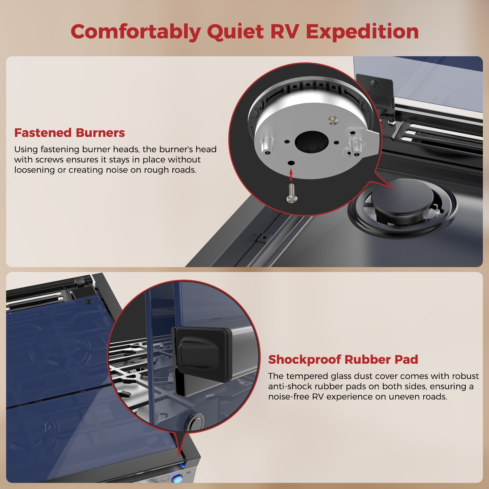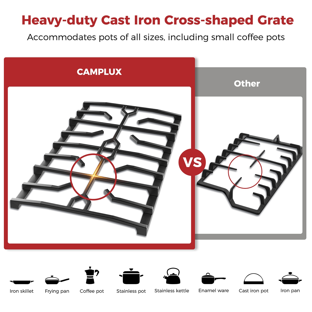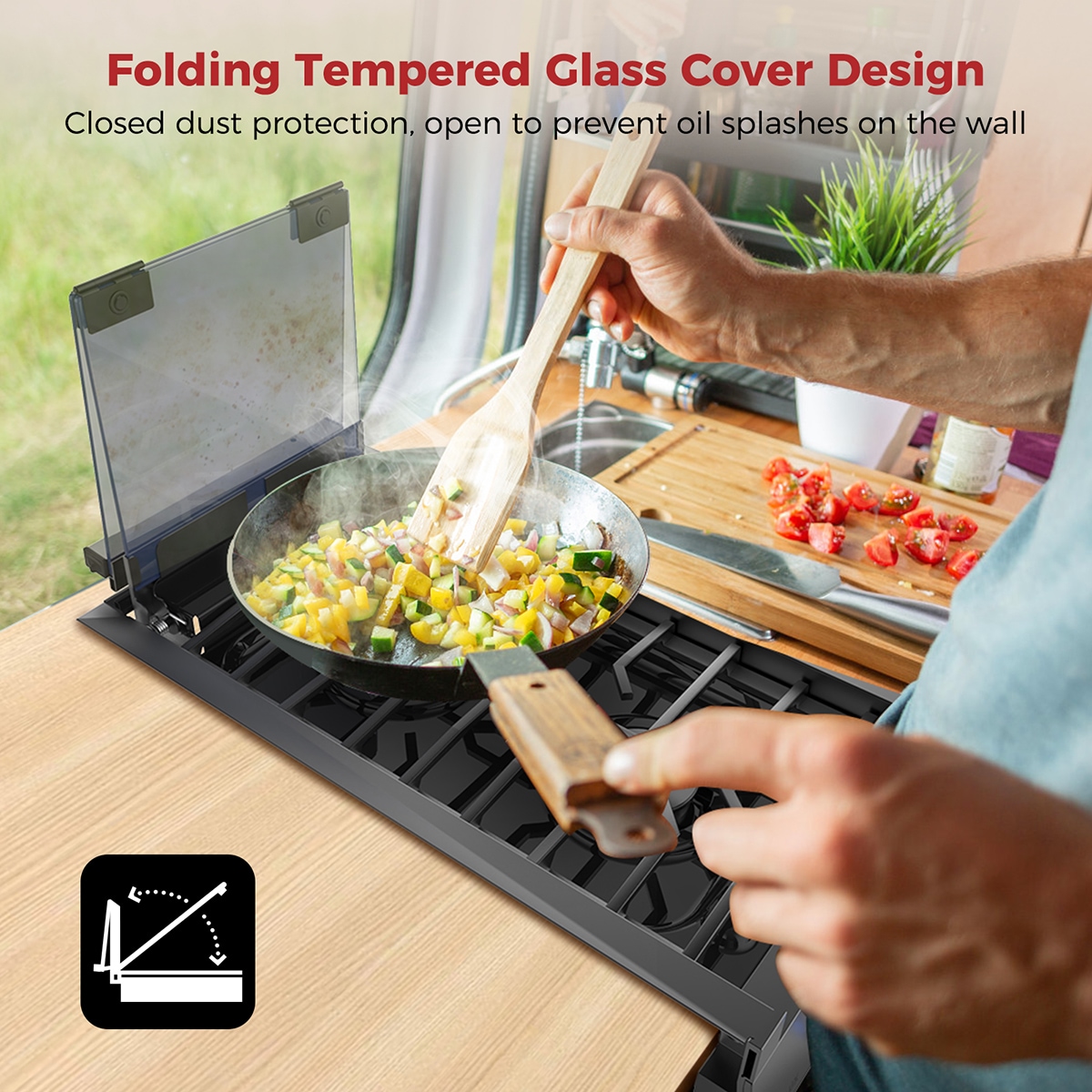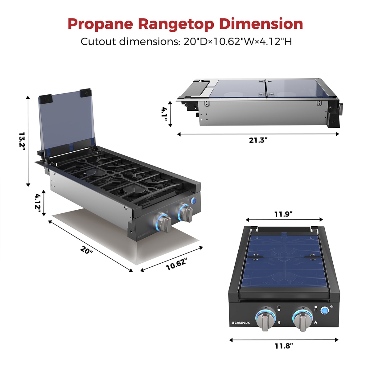 Camplux RV gas cooktops are standalone units, designed specifically for cooking on the cooktop surface without an integrated oven. Compact and efficient solution for preparing meals in recreational vehicles or RVs. This 2 burners cooktop can be installed over a wall oven or on its own for added flexibility.