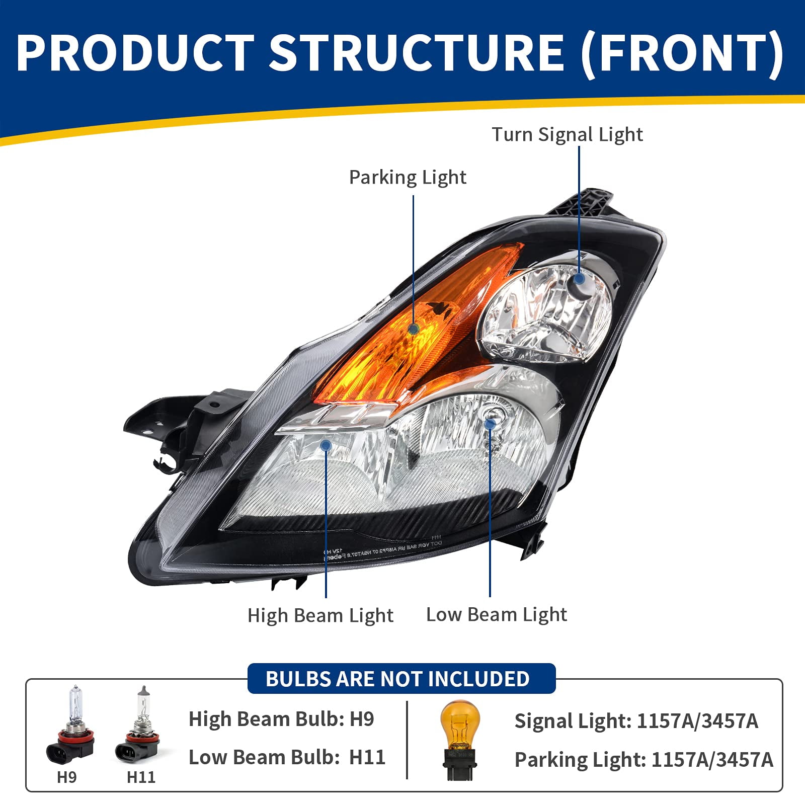 Ledkingdomus Headlight Assembly Compatible with 07 08 09 Altima Sedan 4-door 2007 2008 2009 Altima Black Housing with Amber Reflector Clear Lens