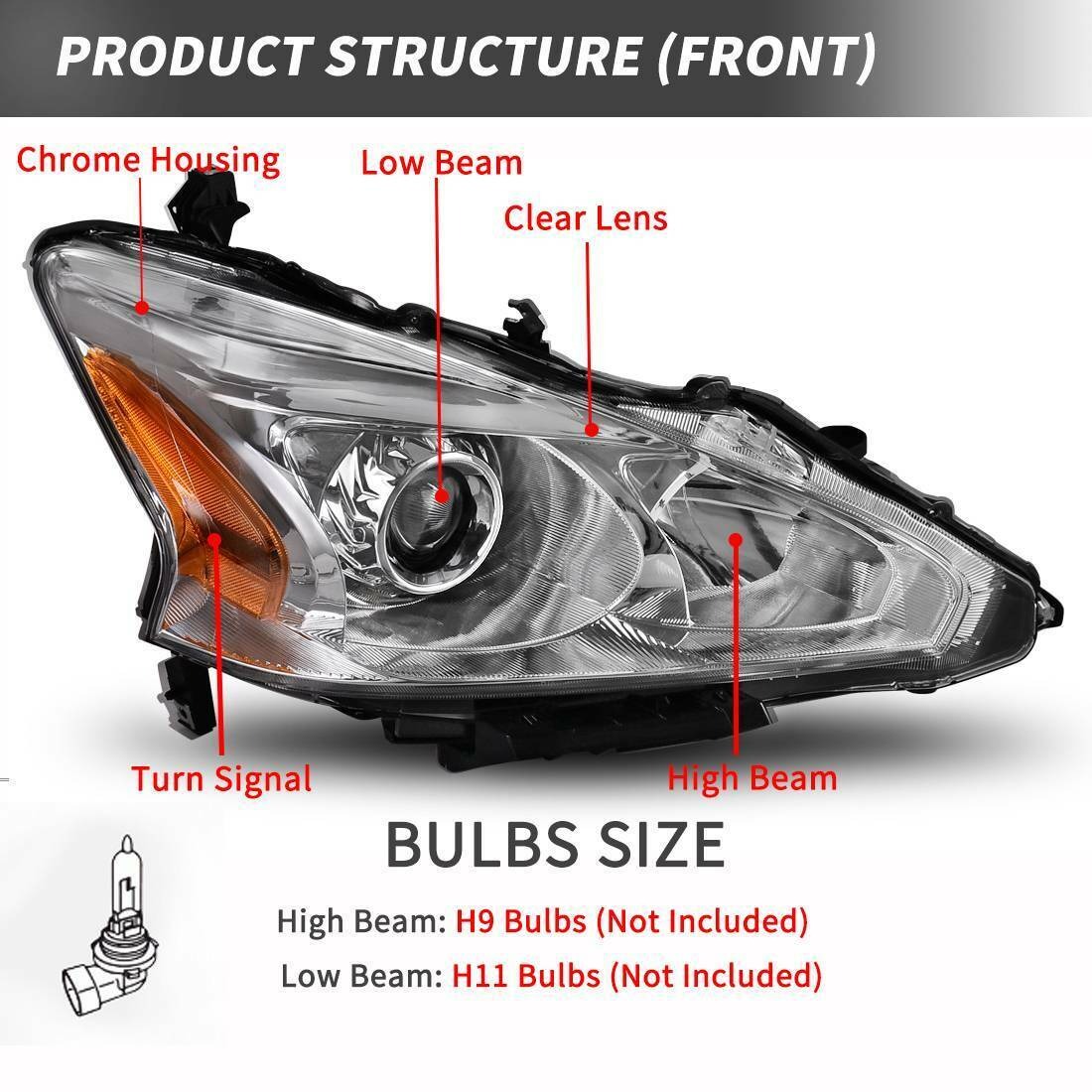 Vehicle Fitment 2013 Altima 4-Door Sedan 2014 Altima 4-Door Sedan 2015 Altima 4-Door Sedan Bulb Type High Beam: H9 (NOT Included) Low Beam: H11(NOT Included) OEM Part Number 260603TA0A, 260103TA0A, NI2502208, NI2503208 [Not Compatible on 2-door Coupe Models] [Not Compatible on Models w/ Factory HID Xenon Headlights] Note: Professional installation would be highly recommended. SPECIFICATION: Color: Chrome Housing Specific Uses For Product: Headlight Assembly Light Source Type: High:H9/Low:H11(Halogen bulbs not included) Vehicle Service Type:Not Compatible on Models w/ Factory HID Headlights, 2013-2015 Altima 4-Door Sedan Position:Front Outside Lens Color:Clear Lens Lens