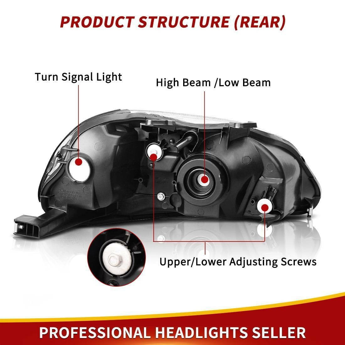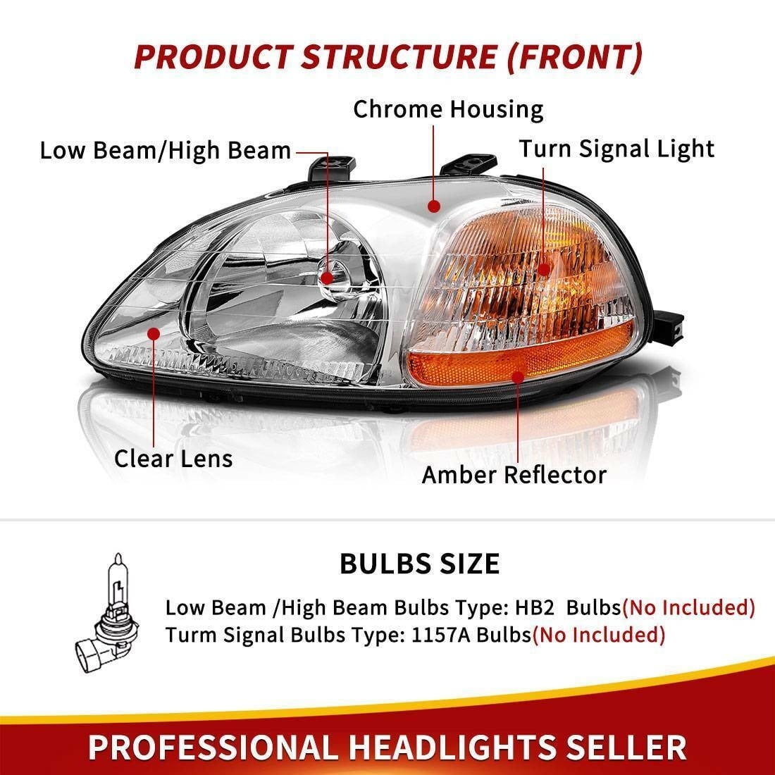 Fitment: for 1996 1997 1998 Honda Civic PART NUMBER: 7221-0018L, 7221-0018R HOLLANDER: 114-58456L, 114-58456R OEM: 33151-S01-305, 33101-S01-305 PARTSLINK: HO2502110, HO2503110 Detail: Condition: 100% Brand New and High Quality Material: ABS Plastic Housing / Polycarbonate Lens Color: Chrome Housing + Clear Lens + Amber Reflector Turn Signal Bulbs Type: 1157A (No included) Low Beam / High Beam Bulbs Type: HB2 (No included) Packing List : 1 Pair of Headlights (Driver & Passenger Side)