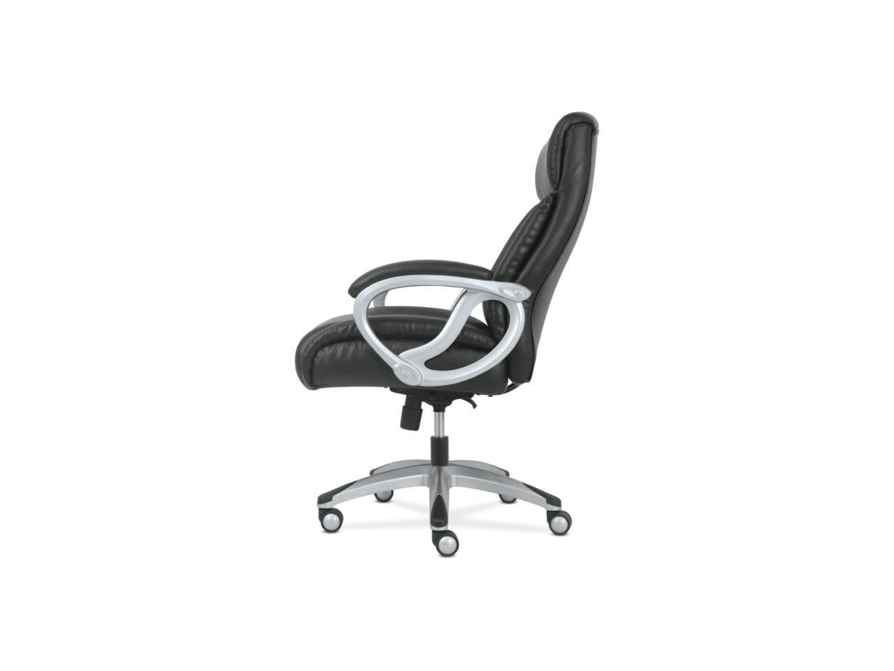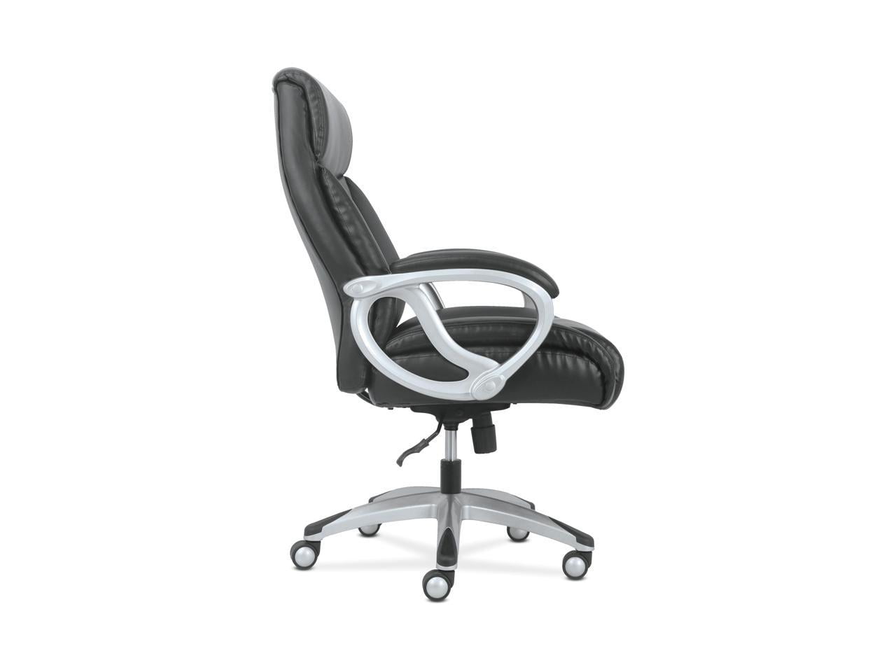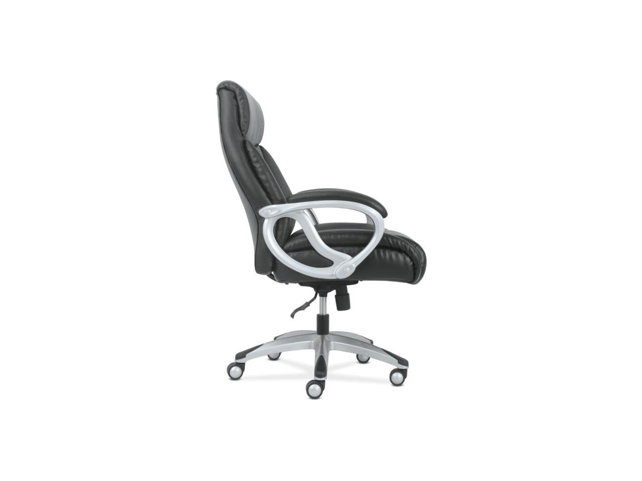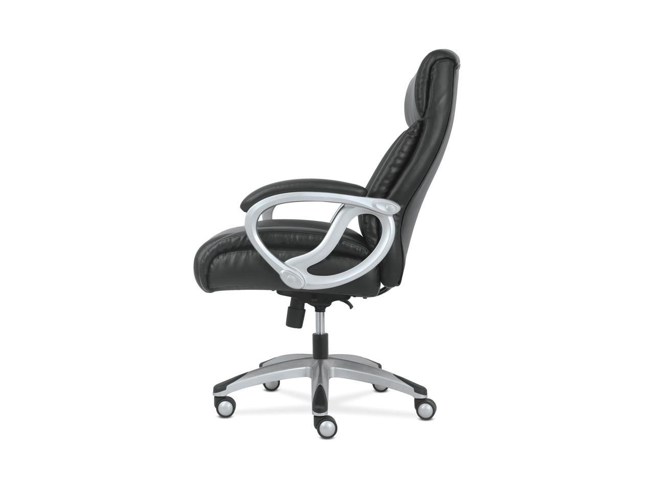 SofThread leather upholstery is Black Padded arms provide upper body support 360-degree swivel provides freedom of movement in any direction