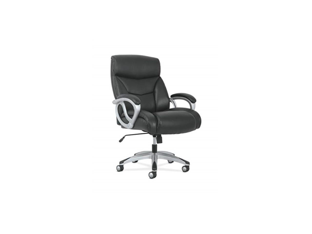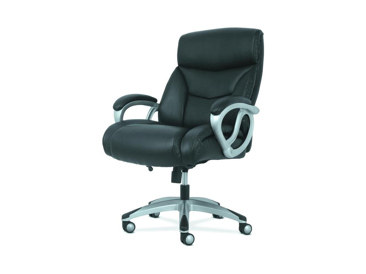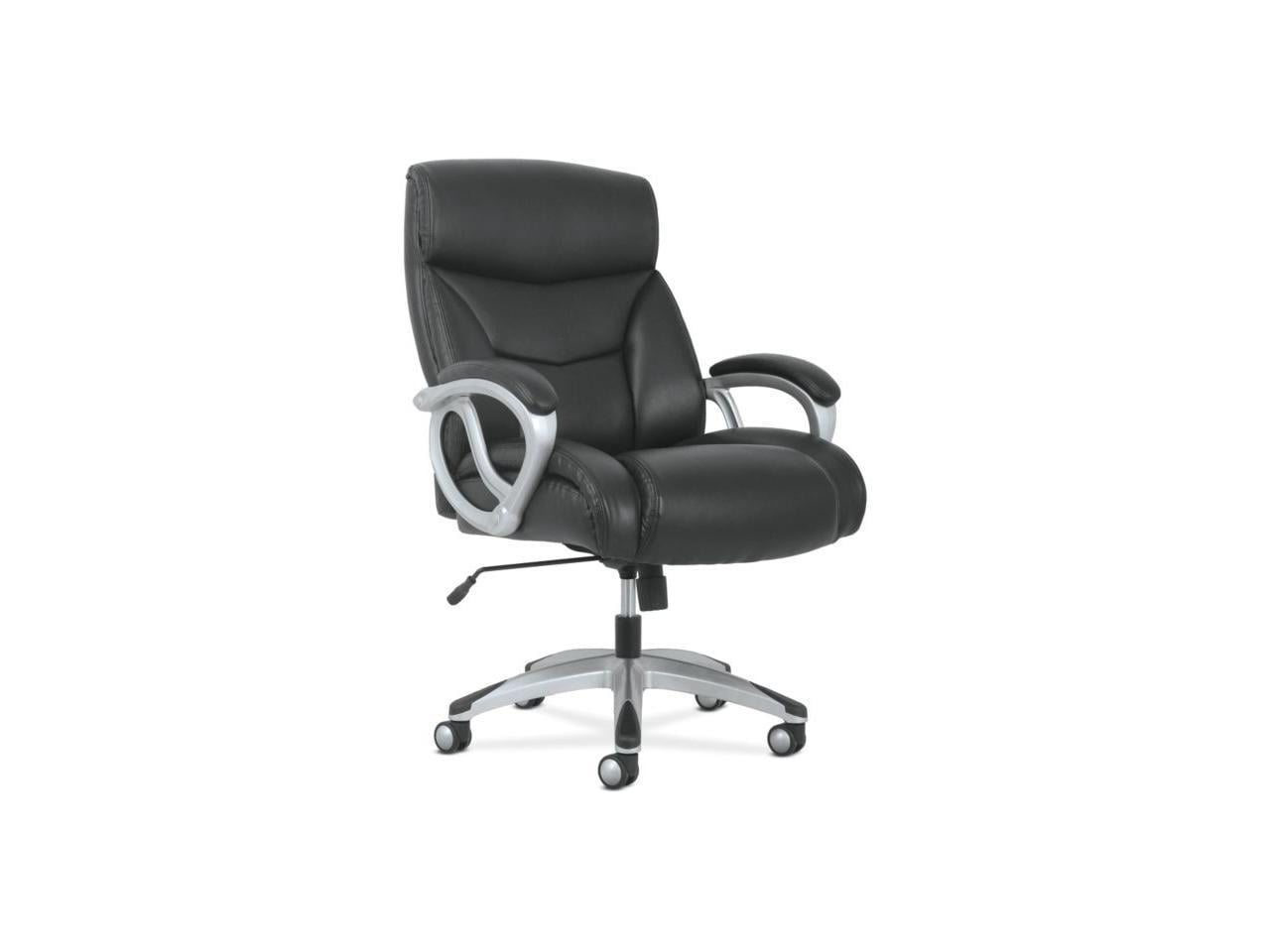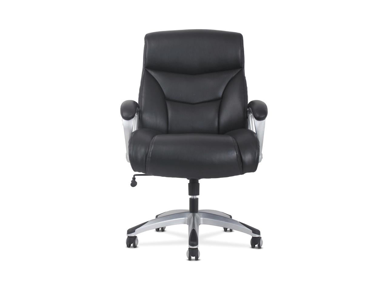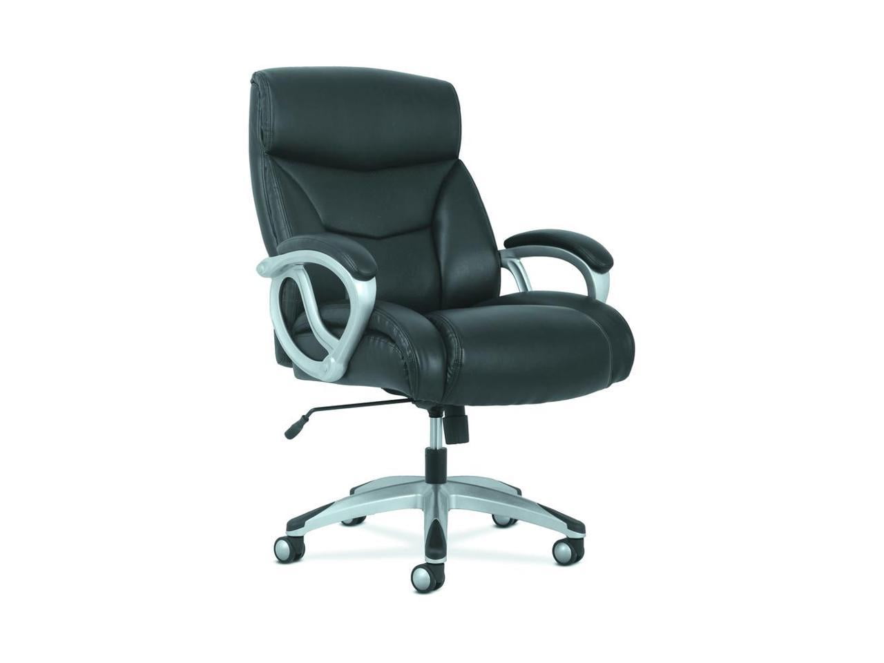 SofThread leather upholstery is Black Padded arms provide upper body support 360-degree swivel provides freedom of movement in any direction