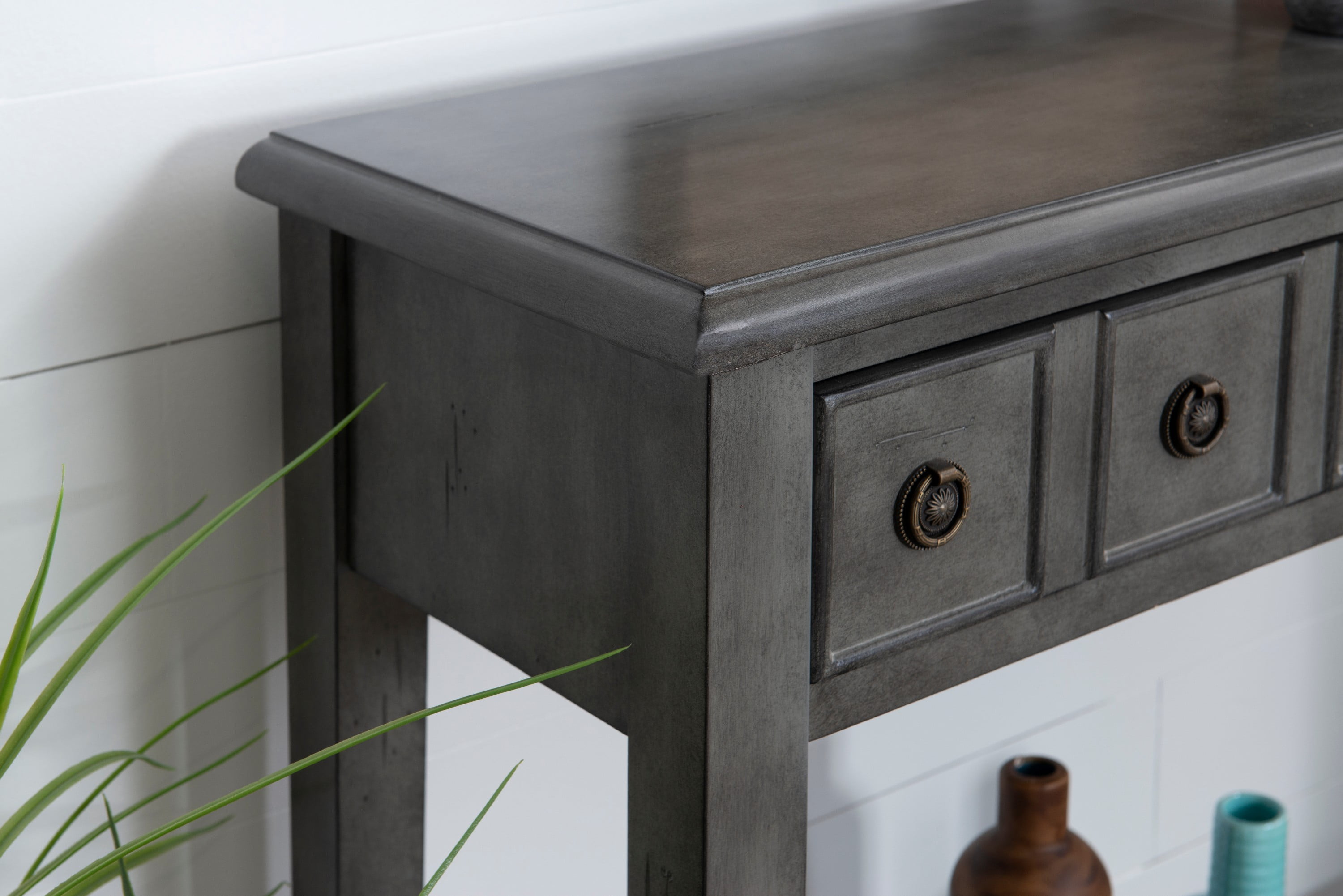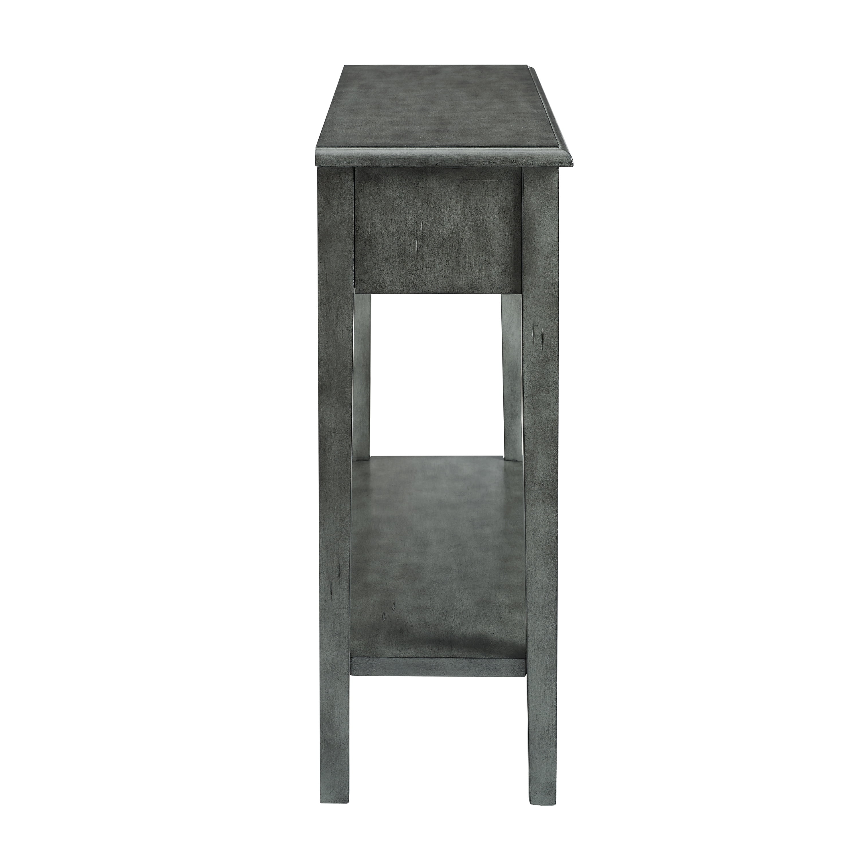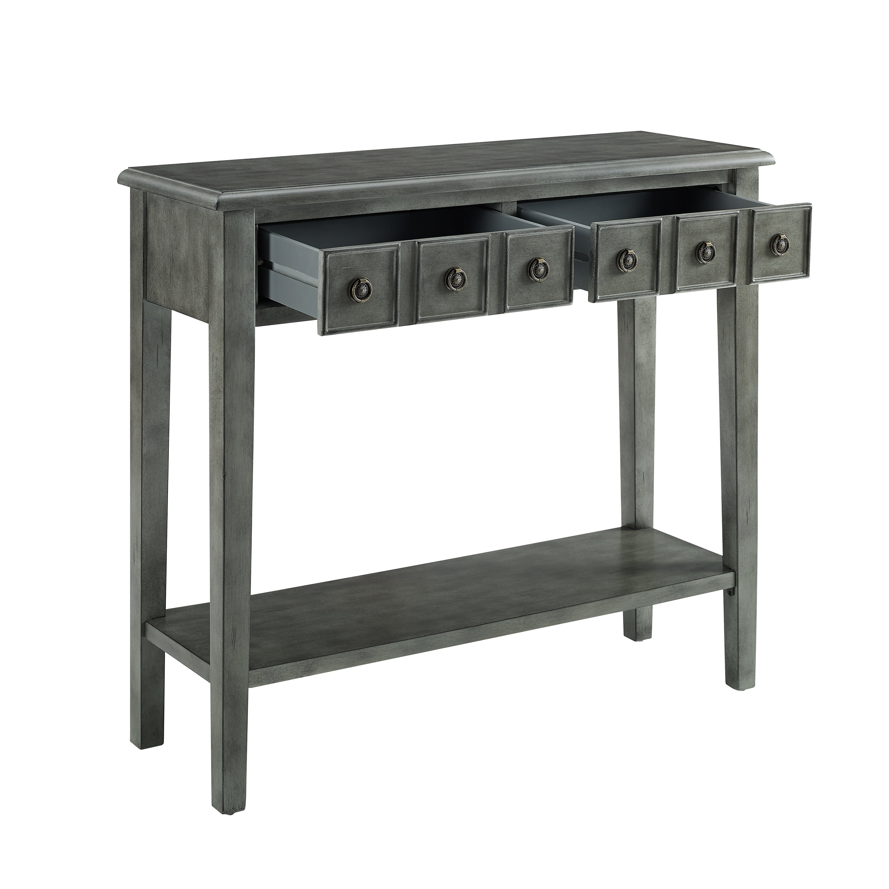 FEATURES ROUND ANTIQUE BRONZE PULLS Two Storage Drawers Features a lower shelf for storage Glazed wood finish Distressed Gray finish For use in entry way, living room or below wall mounted TV Assembled Size: 38″w x 13″d x 34.75″h Weight capacity: Top 100 lbs; Shelf 50 lbs Ships in one box