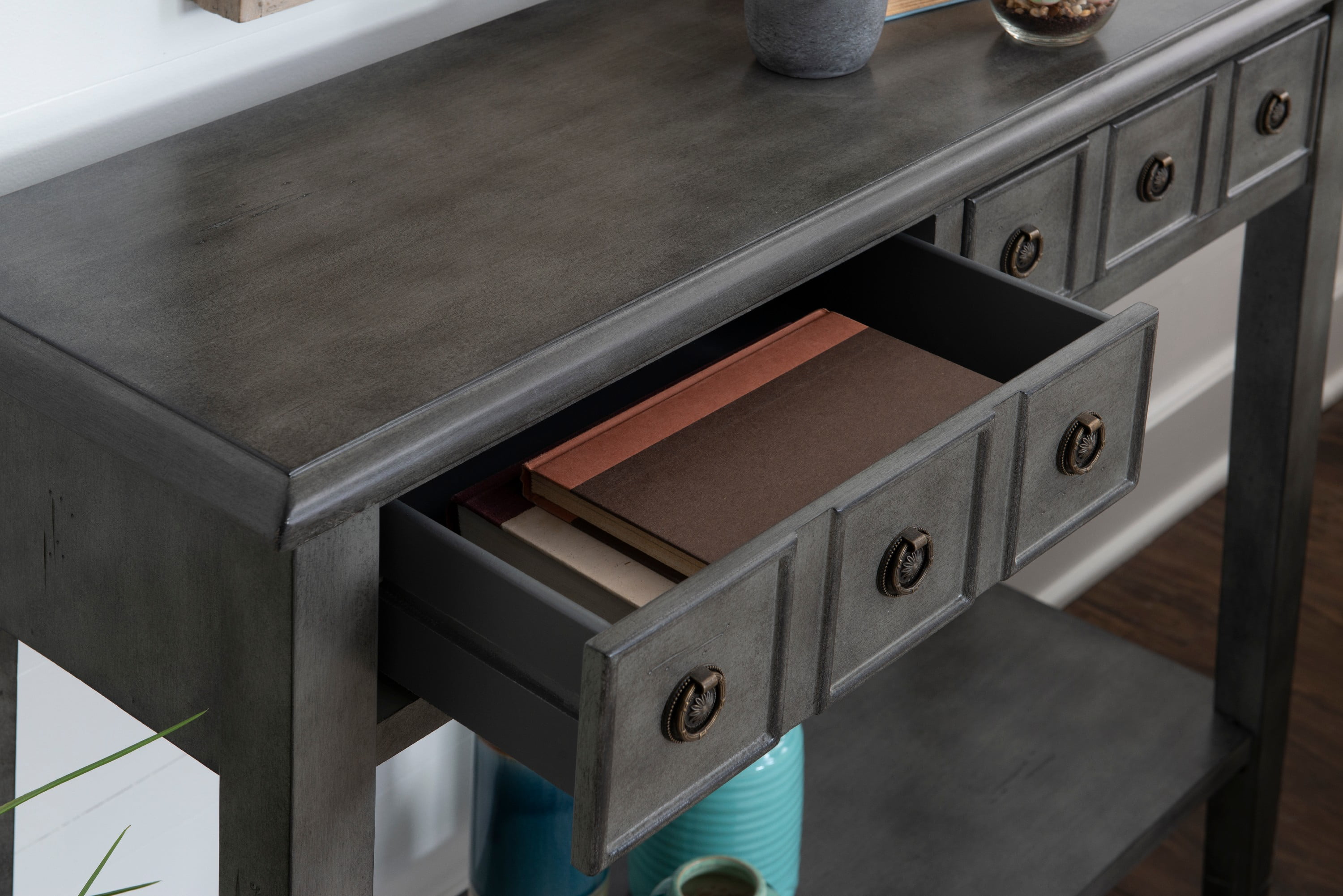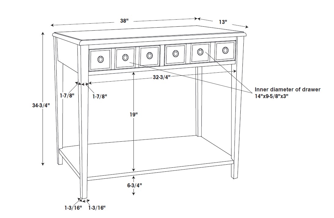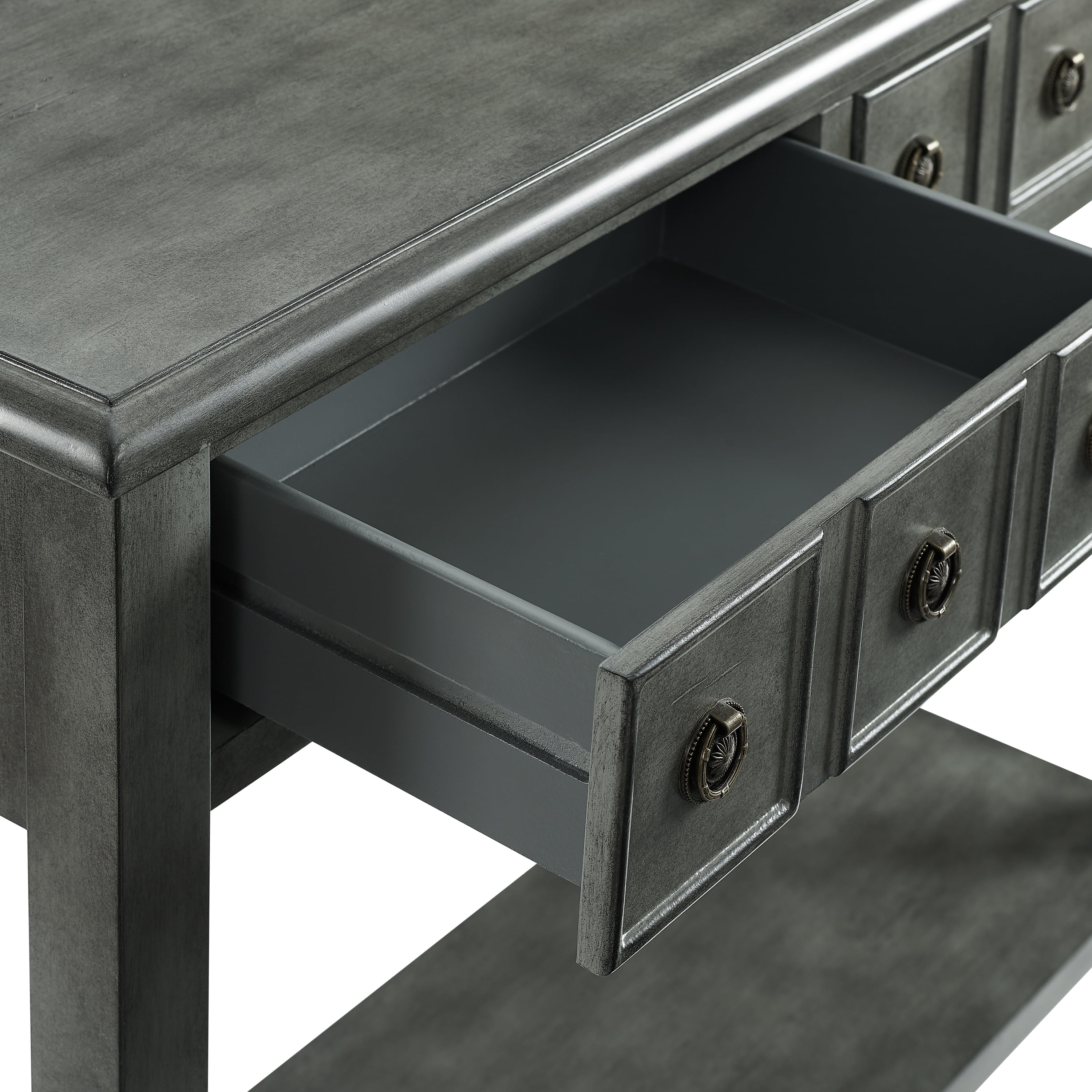 FEATURES ROUND ANTIQUE BRONZE PULLS Two Storage Drawers Features a lower shelf for storage Glazed wood finish Distressed Gray finish For use in entry way, living room or below wall mounted TV Assembled Size: 38″w x 13″d x 34.75″h Weight capacity: Top 100 lbs; Shelf 50 lbs Ships in one box