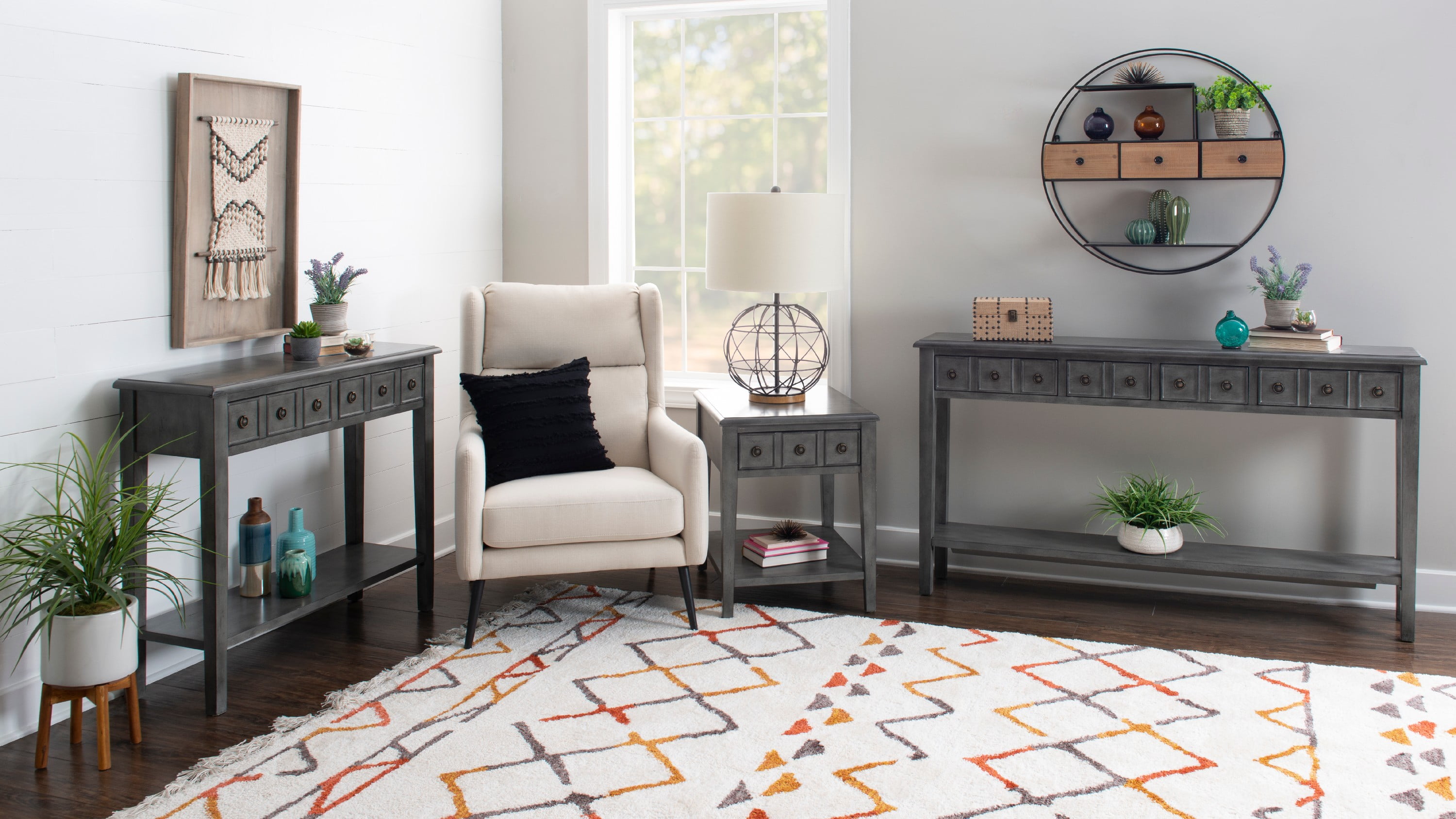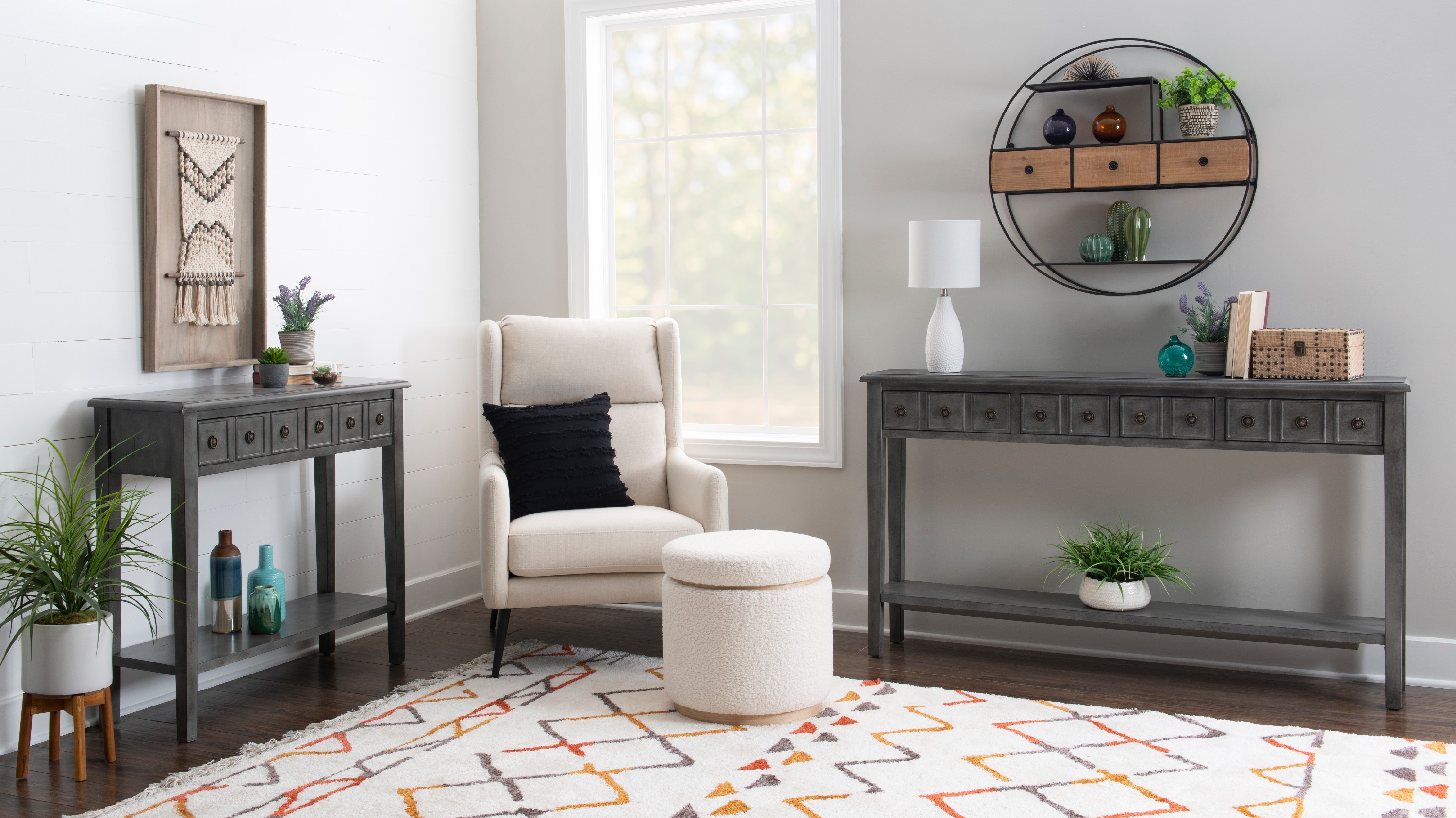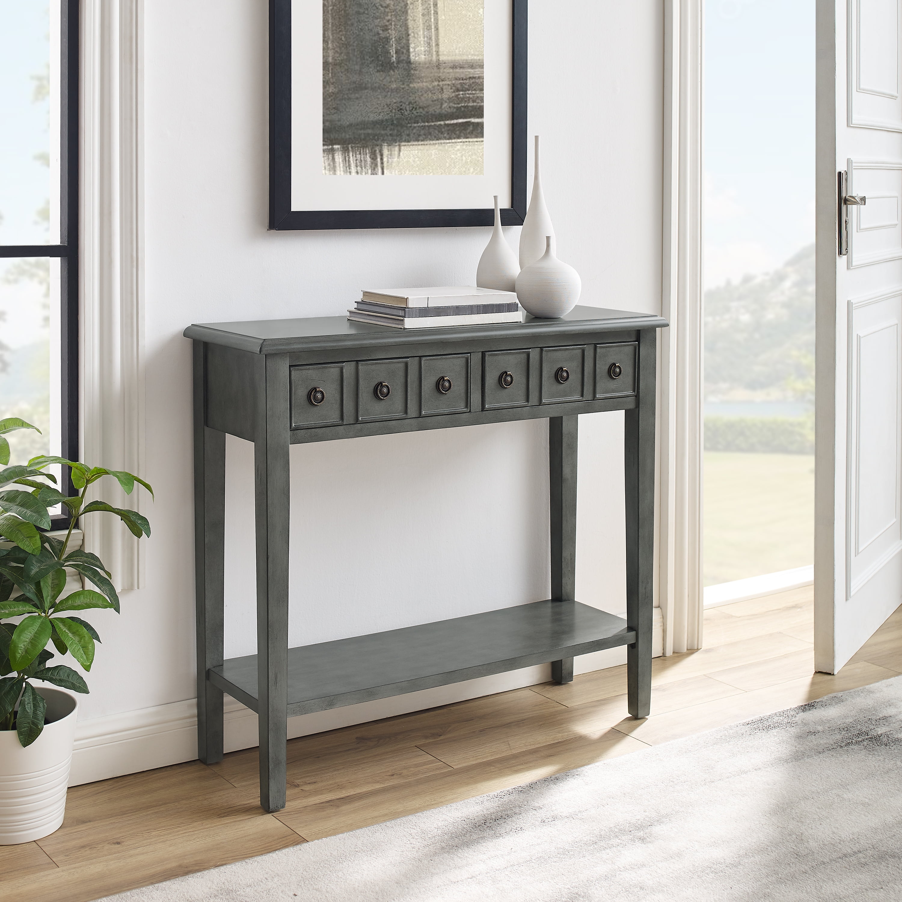 Sadie Farmhouse 2-Drawer Short Console Table with Shelf, Gray