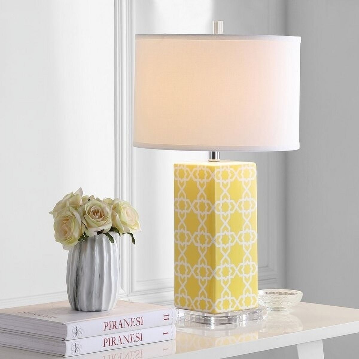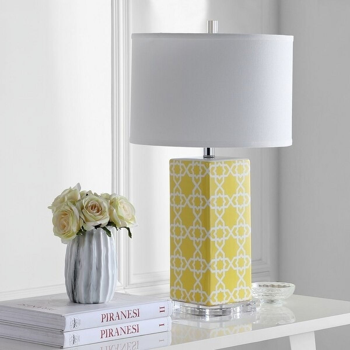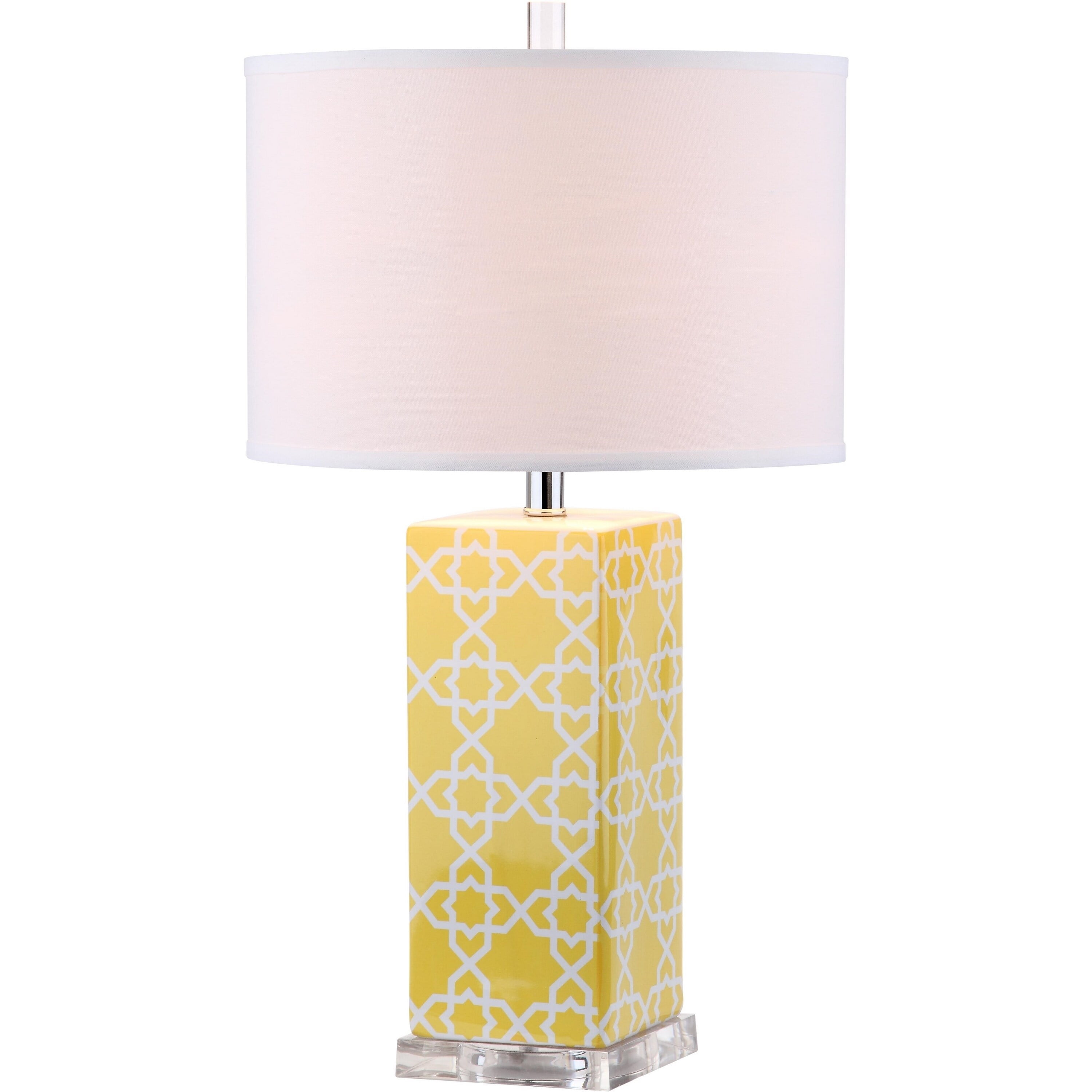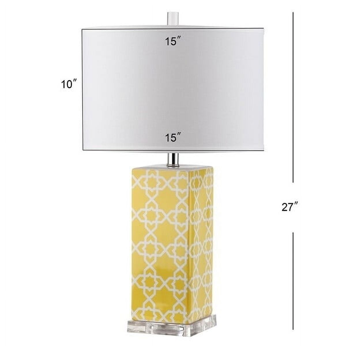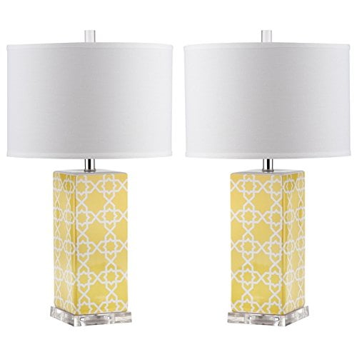SAFAVIEH Lighting Quatrefoil Table Lamp Yellow Bring a burst of color and pattern to neutrally-styled rooms with the Quatrefoil Table Lamp. Crafted of yellow and white ceramic with a silver base and neck, this Moroccan-inspired design is topped with a contemporary off-white cotton shade to easily suit any decor