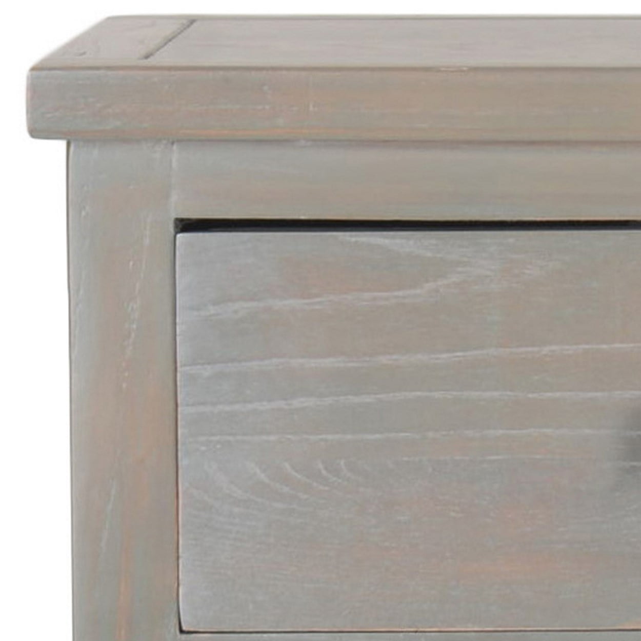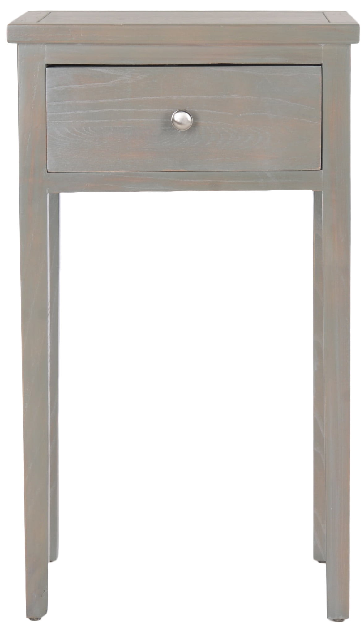 Contemporary design adds a chic look to your home Durable elm wood frame for long lasting longevity No assembly needed Color: French Grey Item Dimensions: 16.9 in. W x 19.1 in. W x 29.7 in. H Drawer Dimensions: 4.68 in. H x 12.29 in. W x 12.09 in. D Item Weight: 16.94 lbs. Weight Capacity: 20 lbs. for drawer Wood is a natural material with variations of color shade, configuration, streaks, and grain structure, each individual piece of Safavieh furniture has characteristic markings that will differ from photo and showroom samples, regular attention and maintenance of fine furniture can ensure its beauty for years to come, always use felt pads under all articles to prevent discoloration or softening of the lacquer, plastic and rubber bases on items can discolor wood Accessories in life style photo(s) not included Please note: The images and product dimensions on our website are as accurate as possible. Due to differences in computer monitors, some furniture colors may vary slightly. Lengths and widths may vary from the published dimensions. We do our best to provide you with an exact measurement, but please be advised that some variation exists. Dust regularly with a soft, dry cloth. Never use oiled or treated cloths on lacquered finishes. Some finishes can be wiped with a damp (not wet) cloth, followed at once by rubbing with a dry cloth to remove fingerprints and smudges. For persistent spots, gently clean with a soft cloth and a solution of water and mild soap, make sure to wipe dry. Use adhesive felt pads, coasters and placemats to protect your furniture.