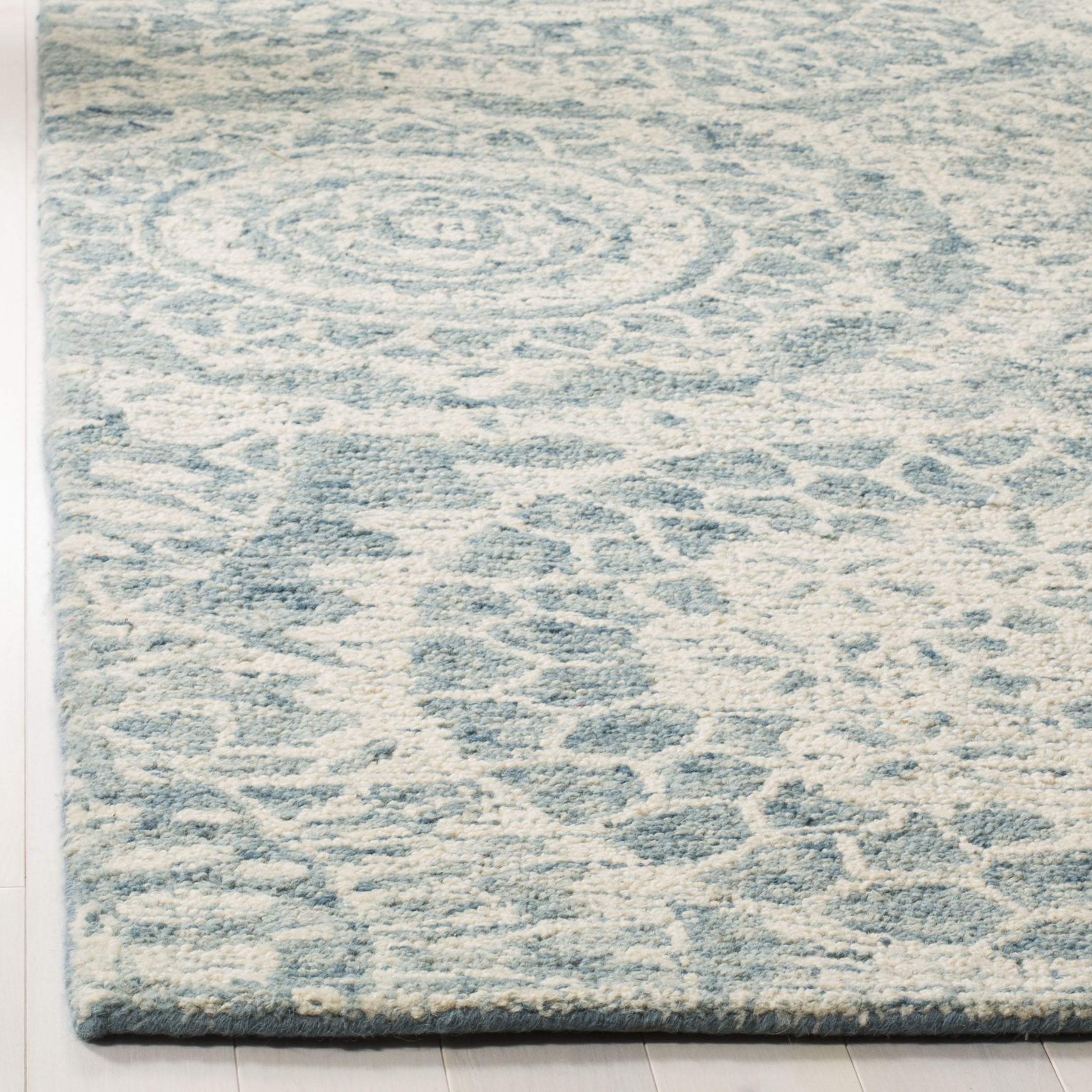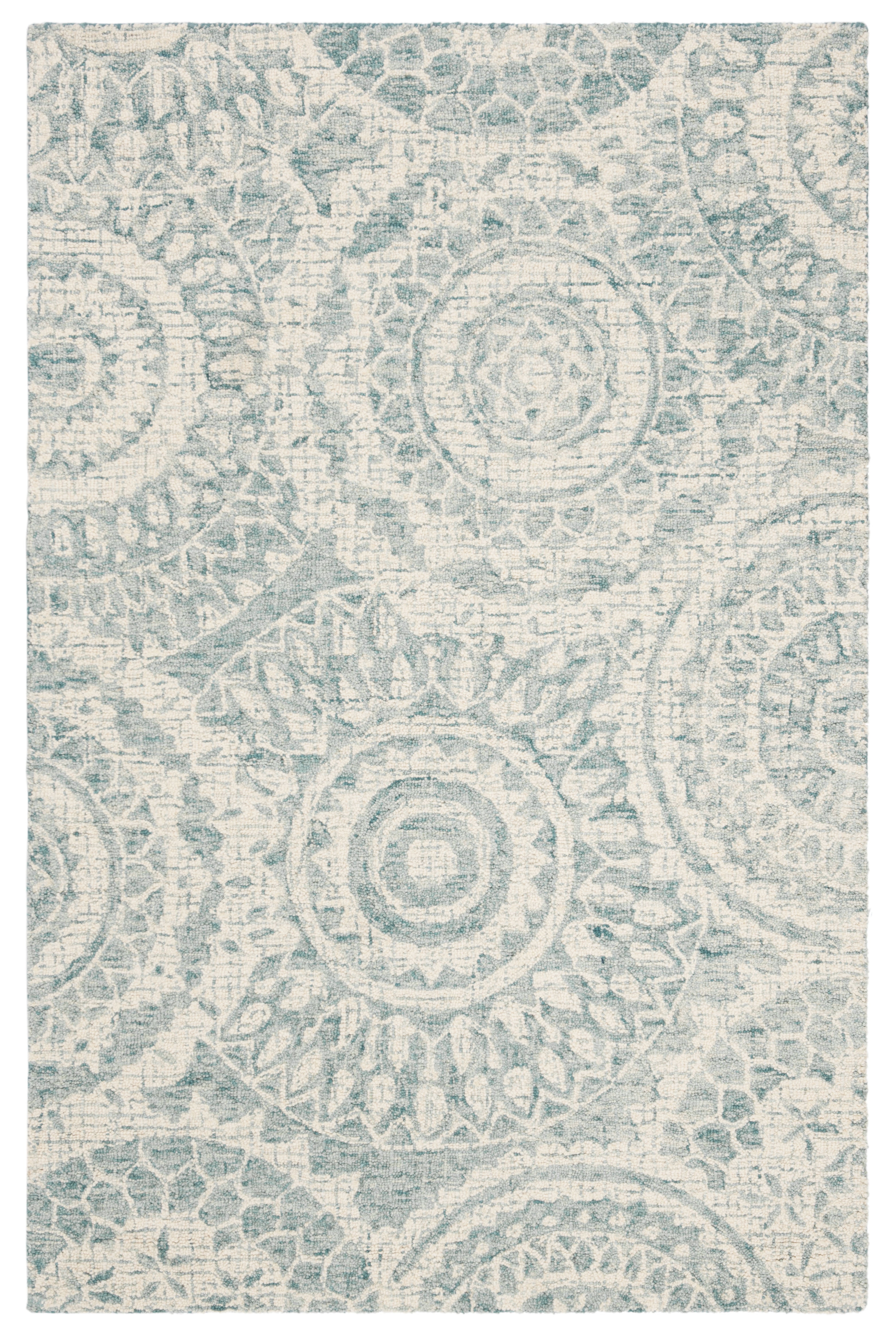 Color: Ivory/Blue Size: 5′ x 8′ Hand Tufted in India Pile Height: 0.5 in. Cotton backing, rug pad (sold separately) recommended to help prevent shifting and sliding 20% Wool, 30% Viscose, 50% Polyester Stylish addition for any room Accessories in lifestyle photos not included New wool rugs shed as a natural consequence of how they are made; vacuum a new wool rug 1-2 times a week for the first few weeks using a low pressure vacuum cleaner without beater bars; vacuum in the direction of the pile, not against it; do not pull loose ends or stray loops, clip them with scissors to remove Vacuum (preferably one without beater bars) regularly and spot clean; for hard-to-remove stains, professional rug cleaning is recommended; rotating your rugs every 3-6 months will protect against uneven wear from foot traffic and furniture weight Use rug protectors under the legs of heavy furniture to avoid flattening piles Avoid direct sunlight as it will cause the colors in your area rug to fade over time; place your area rug away from direct sunlight whenever possible For an instant decorating makeover, this area rug is one of the easiest and most fashionable ways to refresh a room with character and style. Please note: The images and product dimensions on our website are as accurate as possible. Due to differences in computer monitors, some rug colors may vary slightly. Lengths and widths may vary from the published dimensions. We do our best to provide you with an exact measurement, but please be advised that some variation exists. Patterns may vary slightly according to shape and size selected. Packing and shipping of your rug may cause temporary creases; these surface waves are not imperfections or damages and will gradually recede; back-rolling or reverse rolling is the fastest and easiest way to remove creases in your area rug; allow ample time for your rug to settle, these creases and waves will normally flatten out Available in multiple color and sizes For carpet-to-carpet use, we recommend placing a hold pad in-between for protection