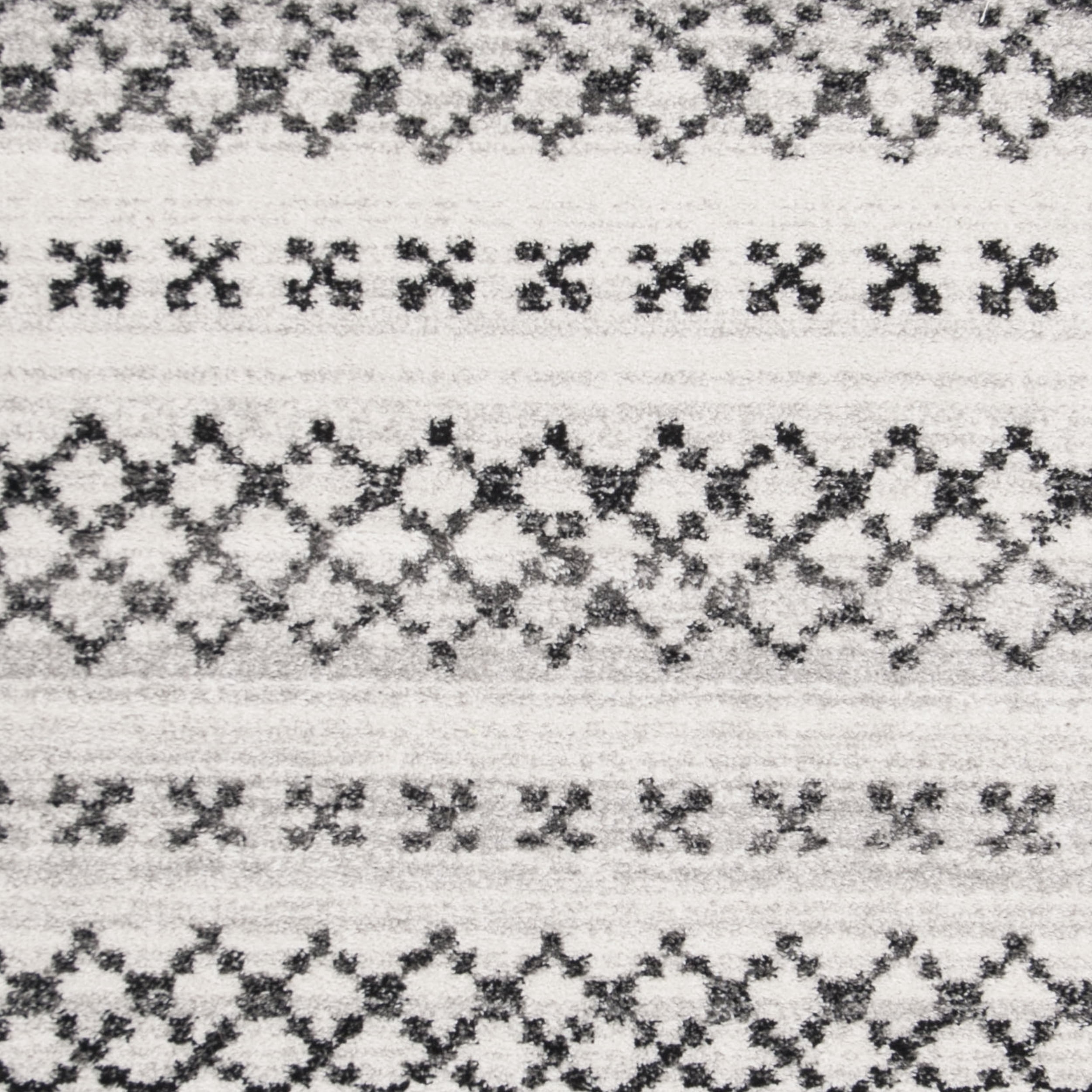 Color: Grey/Ivory Size: 5’1″ x 7’6″ Power Loomed in Turkey Pile Height: 0.5 in. Polypropylene Backing contains jute , rug pad (sold separately) recommended to help prevent shifting and sliding Indoor Use Accessories in lifestyle photos not included Vacuum regularly (preferably one without beater bars) and spot clean; for hard-to-remove stains, professional rug cleaning is recommended; rotating your rugs every 3-6 months will protect against uneven wear from foot traffic and furniture weight Use rug protectors under the legs of heavy furniture to avoid flattening piles Avoid direct sunlight as it will cause the colors in your area rug to fade over time; place your area rug away from direct sunlight whenever possible For an instant decorating makeover, this area rug is one of the easiest and most fashionable ways to refresh a room with character and style. Please note: The images and product dimensions on our website are as accurate as possible. Due to differences in computer monitors, some rug colors may vary slightly. Lengths and widths may vary from the published dimensions. We do our best to provide you with an exact measurement, but please be advised that some variation exists. Patterns may vary slightly according to shape and size selected. Packing and shipping of your rug may cause temporary creases; these surface waves are not imperfections or damages and will gradually recede; back-rolling or reverse rolling is the fastest and easiest way to remove creases in your area rug; allow ample time for your rug to settle, these creases and waves will normally flatten out Available in multiple sizes For carpet-to-carpet use, we recommend placing a hold pad in-between for protection