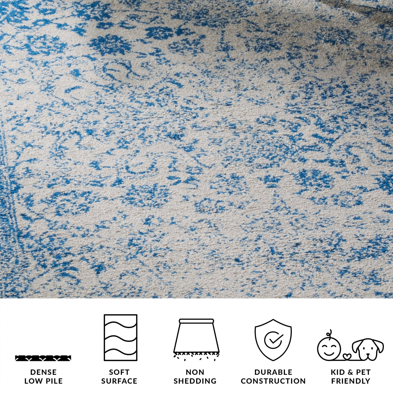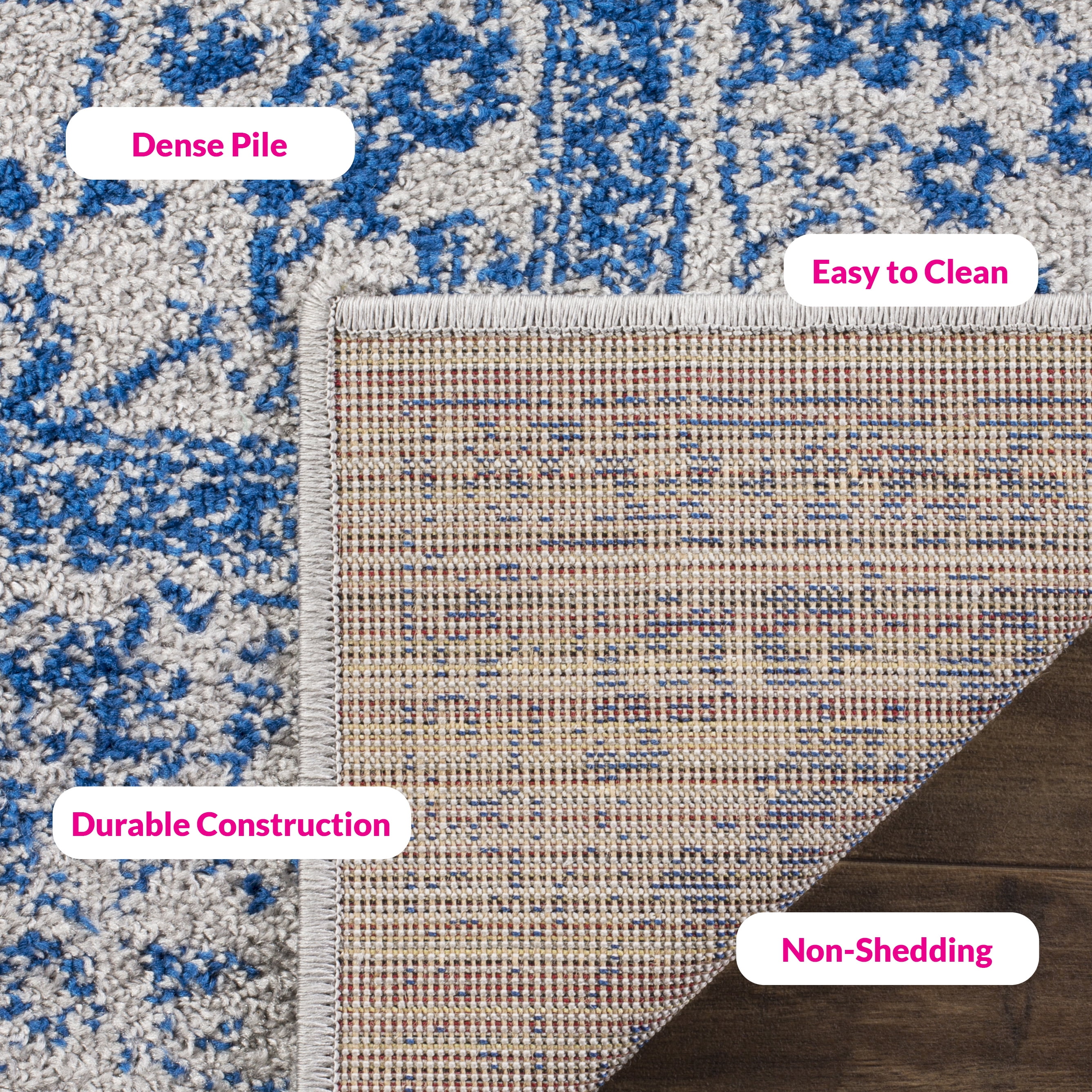 Color: Grey/Blue Size: 8′ x 10′ Power Loomed in Turkey Pile Height: 0.5 in. Polypropylene Backing contains jute , rug pad (sold separately) recommended to help prevent shifting and sliding Indoor Use Accessories in lifestyle photos not included Vacuum regularly (preferably one without beater bars) and spot clean; for hard-to-remove stains, professional rug cleaning is recommended; rotating your rugs every 3-6 months will protect against uneven wear from foot traffic and furniture weight Use rug protectors under the legs of heavy furniture to avoid flattening piles Avoid direct sunlight as it will cause the colors in your area rug to fade over time; place your area rug away from direct sunlight whenever possible For an instant decorating makeover, this area rug is one of the easiest and most fashionable ways to refresh a room with character and style. Please note: The images and product dimensions on our website are as accurate as possible. Due to differences in computer monitors, some rug colors may vary slightly. Lengths and widths may vary from the published dimensions. We do our best to provide you Packing and shipping of your rug may cause temporary creases; these surface waves are not imperfections or damages and will gradually recede; back-rolling or reverse rolling is the fastest and easiest way to remove creases in your area rug; allow ample ti Available in multiple sizes For carpet-to-carpet use, we recommend placing a hold pad in-between for protection