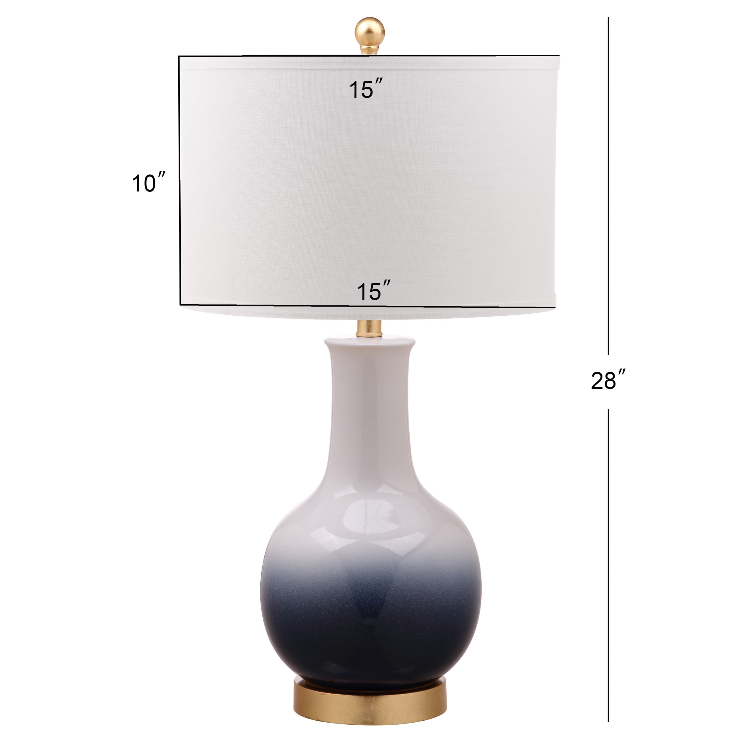 Contemporary design adds a chic look to your home Durable frame for long lasting longevity Easy to clean and maintain Minor assembly needed Color: Navy/White Shade Color: Off-White Item Dimensions: 15 in. W x 15 in. D x 28 in. H Crafted with Ceramic Shade Material: 100% Cotton Shade Height: 10 in. H Shade Bottom Dimensions: 15 in. L x 15 in. W Shade Top Dimensions: 15 in. W x 15 in. L Traditional Harp Style Harp Color: Gold Harp Height: 8 in. H Cord Color: Light Grey Cord Length: 60 in. Lamp Body Dimensions: 9 in. W x 9 in. D x 14.25 in. H Bottom Base Dimension: 6.25 in. W x 6. 25 in. D x 1.25 in. H Pendant Dimension: 60 in. Lamp Certification: UL Light Bulb Base Type: E26 Switch Mechanism: Rotary Switch Type of Bulb Included: LED 9W Max Wattage: Type “A” 100W or CFL 23W or LED 12W Lumen: 800 Quantity of Bulbs: 1 Accessories in life style photo(s) not included Please note: The images and product dimensions on our website are as accurate as possible. Due to differences in computer monitors, some item’s color may vary slightly. Before cleaning any lamp shade or fixture, disconnect the power source. Wipe with a soft, dry cloth. Avoid the use of chemicals and household cleaners as they may damage the finish.