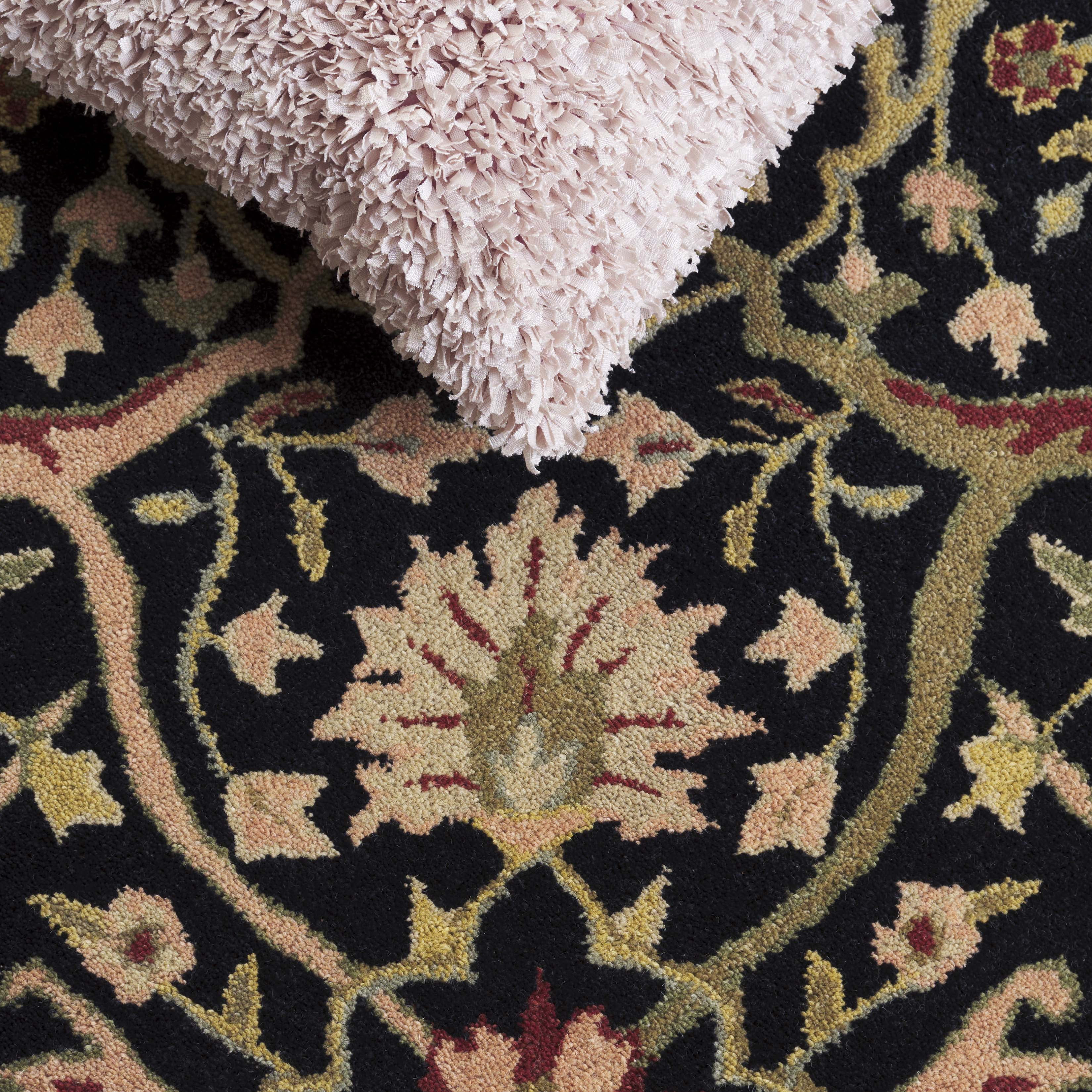 Color: Black Size: 4′ x 6′ Hand Tufted in India Pile Height: 0.5 in. Cotton backing, rug pad (sold separately) recommended to help prevent shifting and sliding 100% Wool Pile Stylish addition for any room Accessories in lifestyle photos not included New wool rugs shed as a natural consequence of how they are made; vacuum a new wool rug 1-2 times a week for the first few weeks using a low pressure vacuum cleaner without beater bars; vacuum in the direction of the pile, not against it; do not pull loose ends or stray loops, clip them with scissors to remove Vacuum (preferably one without beater bars) regularly and spot clean; for hard-to-remove stains, professional rug cleaning is recommended; rotating your rugs every 3-6 months will protect against uneven wear from foot traffic and furniture weight Use rug protectors under the legs of heavy furniture to avoid flattening piles Avoid direct sunlight as it will cause the colors in your area rug to fade over time; place your area rug away from direct sunlight whenever possible For an instant decorating makeover, this area rug is one of the easiest and most fashionable ways to refresh a room with character and style. Please note: The images and product dimensions on our website are as accurate as possible. Due to differences in computer monitors, some rug colors may vary slightly. Lengths and widths may vary from the published dimensions. We do our best to provide you with an exact measurement, but please be advised that some variation exists. Patterns may vary slightly according to shape and size selected. Packing and shipping of your rug may cause temporary creases; these surface waves are not imperfections or damages and will gradually recede; back-rolling or reverse rolling is the fastest and easiest way to remove creases in your area rug; allow ample time for your rug to settle, these creases and waves will normally flatten out Available in multiple color and sizes For carpet-to-carpet use, we recommend placing a hold pad in-between for protection