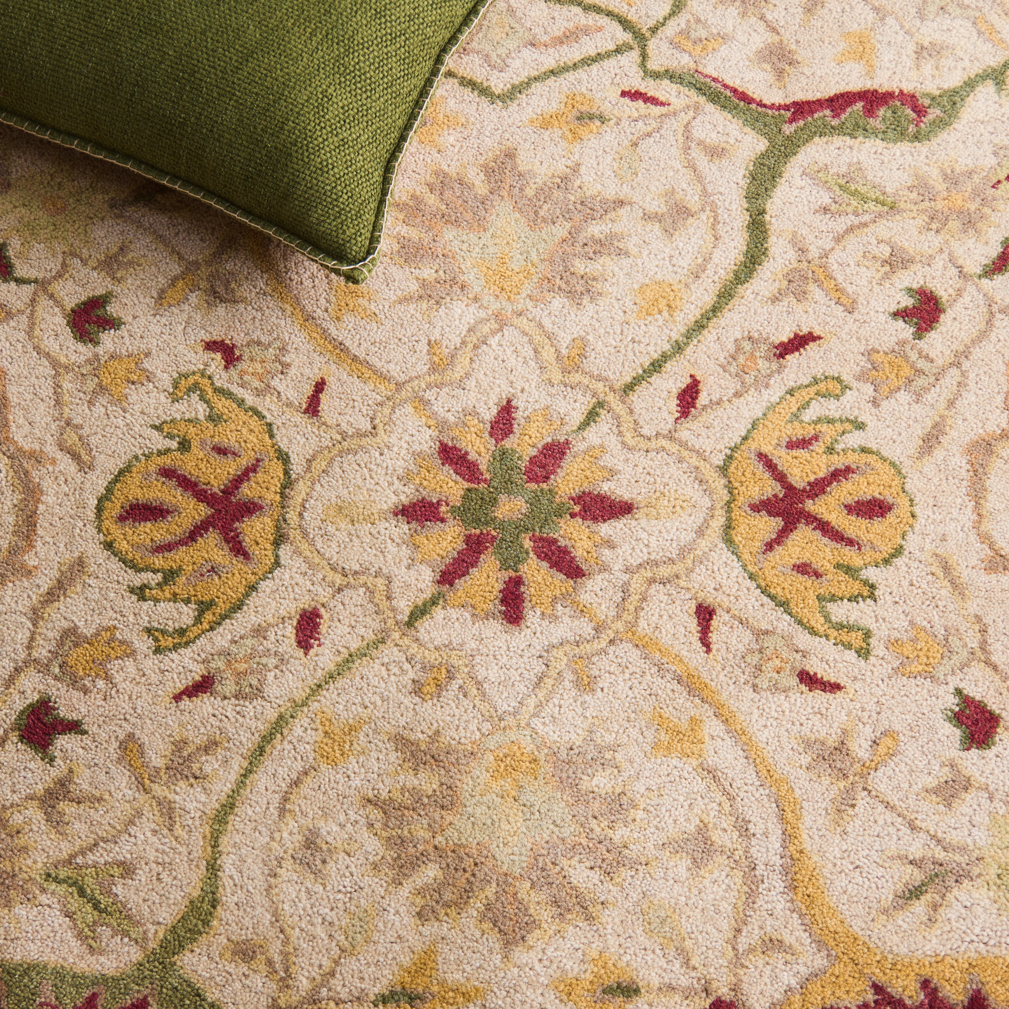 Color: Ivory Size: 5′ x 8′ Hand Tufted in India Pile Height: 0.5 in. Cotton backing, rug pad (sold separately) recommended to help prevent shifting and sliding 100% Wool Pile Stylish addition for any room Accessories in lifestyle photos not included New wool rugs shed as a natural consequence of how they are made; vacuum a new wool rug 1-2 times a week for the first few weeks using a low pressure vacuum cleaner without beater bars; vacuum in the direction of the pile, not against it; do not pull loose ends or stray loops, clip them with scissors to remove Vacuum (preferably one without beater bars) regularly and spot clean; for hard-to-remove stains, professional rug cleaning is recommended; rotating your rugs every 3-6 months will protect against uneven wear from foot traffic and furniture weight Use rug protectors under the legs of heavy furniture to avoid flattening piles Avoid direct sunlight as it will cause the colors in your area rug to fade over time; place your area rug away from direct sunlight whenever possible For an instant decorating makeover, this area rug is one of the easiest and most fashionable ways to refresh a room with character and style. Please note: The images and product dimensions on our website are as accurate as possible. Due to differences in computer monitors, some rug colors may vary slightly. Lengths and widths may vary from the published dimensions. We do our best to provide you with an exact measurement, but please be advised that some variation exists. Patterns may vary slightly according to shape and size selected. Packing and shipping of your rug may cause temporary creases; these surface waves are not imperfections or damages and will gradually recede; back-rolling or reverse rolling is the fastest and easiest way to remove creases in your area rug; allow ample time for your rug to settle, these creases and waves will normally flatten out Available in multiple color and sizes For carpet-to-carpet use, we recommend placing a hold pad in-between for protection