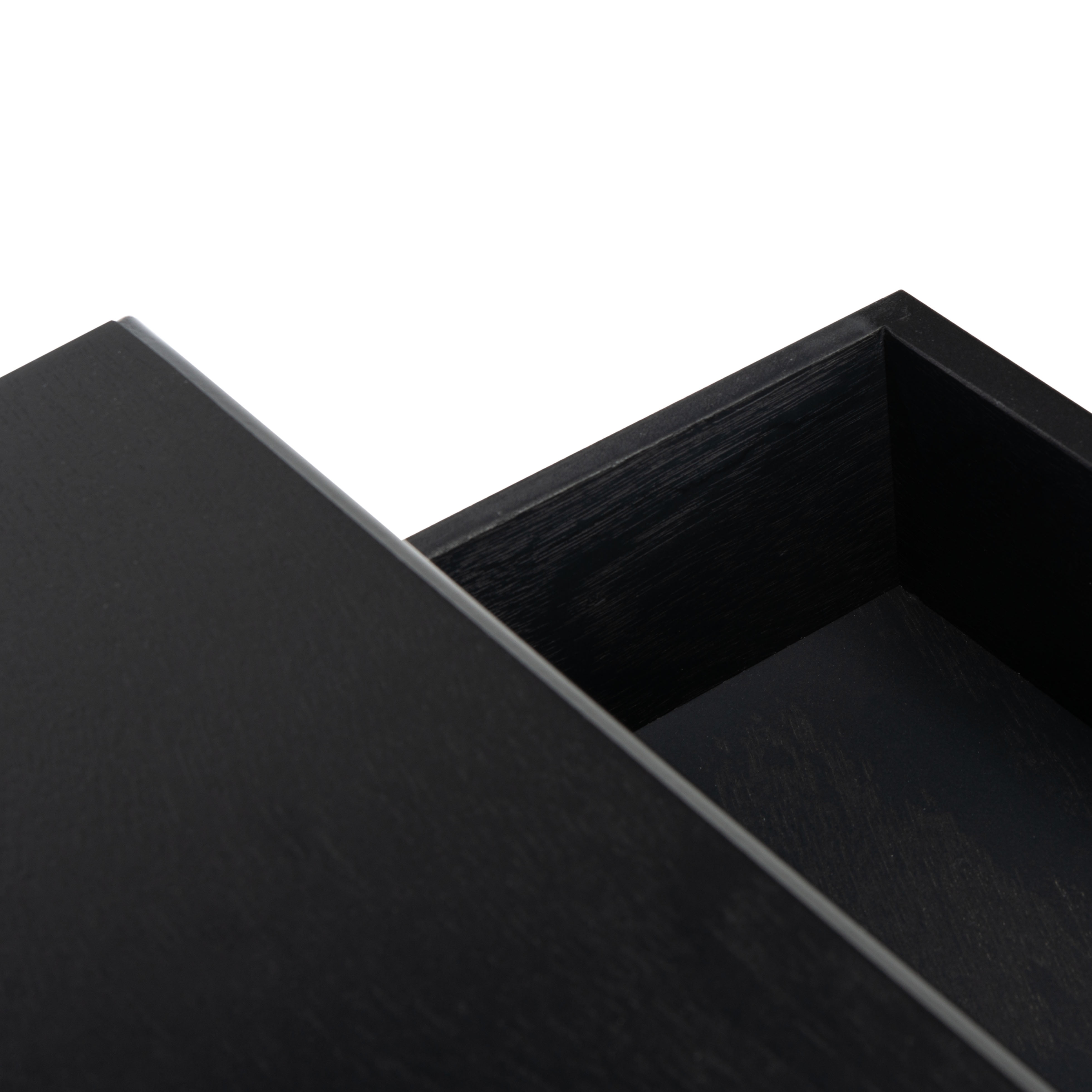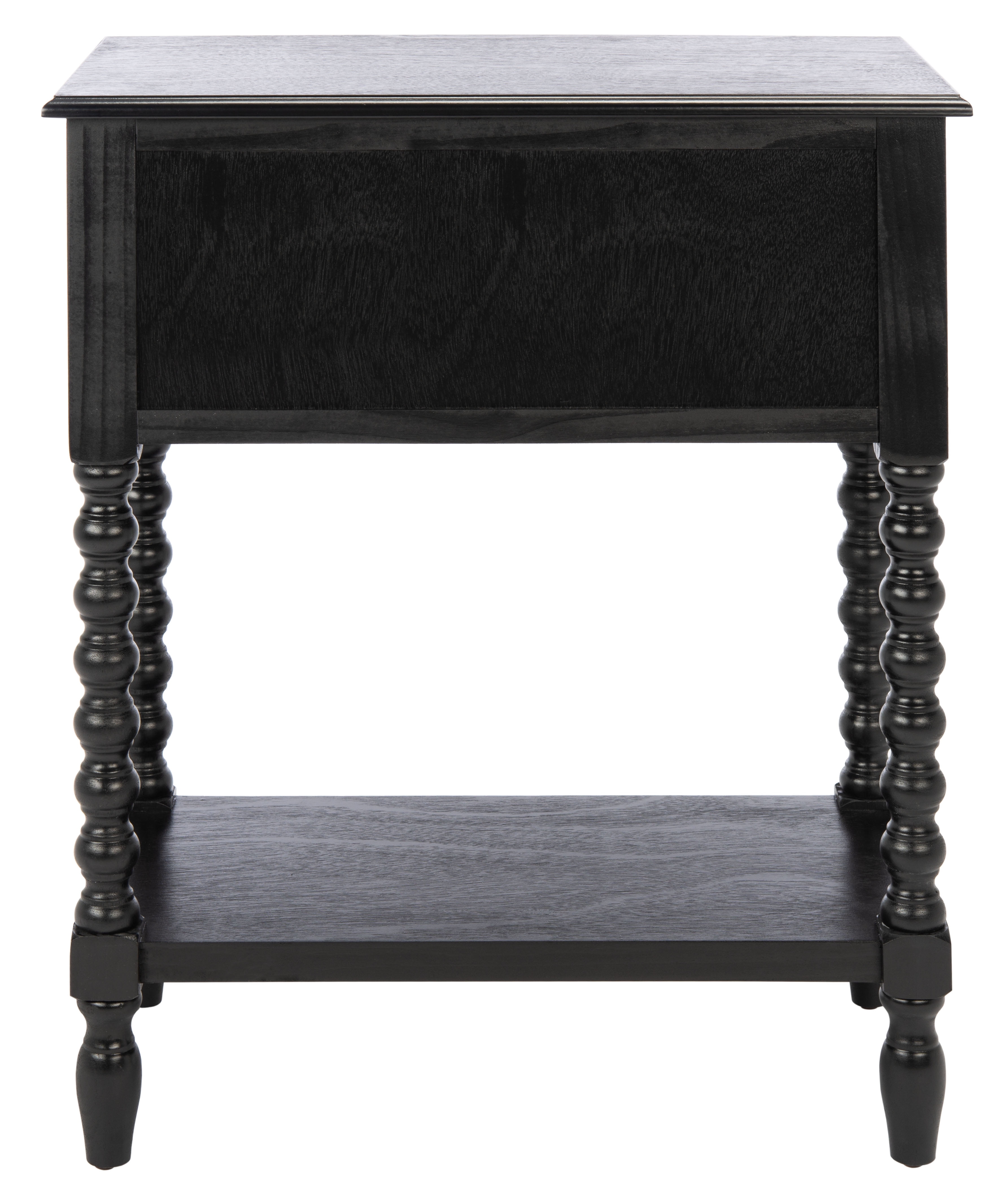 Durable wood frame for long lasting longevity Minor assembly needed Color: Black Overall Dimension: 23.5 in. W x 13 in. D x 29.5 in. H Item Weight: 24.2 lbs. Weight Capacity: 40 lbs. Finish Surface Treatment: Water Based Paint Dust regularly with a soft, dry cloth. Never use oiled or treated cloths on lacquered finishes. Some finishes can be wiped with a damp (not wet) cloth, followed at once by rubbing with a dry cloth to remove fingerprints and smudges. For persistent spots, gently clean with a soft cloth and a solution of water and mild soap, make sure to wipe dry. Use adhesive felt pads, coasters and placemats to protect your furniture. Drawer Dimensions (in.): Small Drawers: 7.9 x 9.8 x 2.8; 1 Lower Drawer: 17.9 x 9.8 x 2.8 Quantity of Drawers: 3 Shelf Dimensions: 19.1 in. W x 8.4 in. D x 12.7 in. H Frame Type: Wood Wood Content: Pine/Mdf Metal Type (Hardware Material)/Embellishment Material: Zinc Alloy