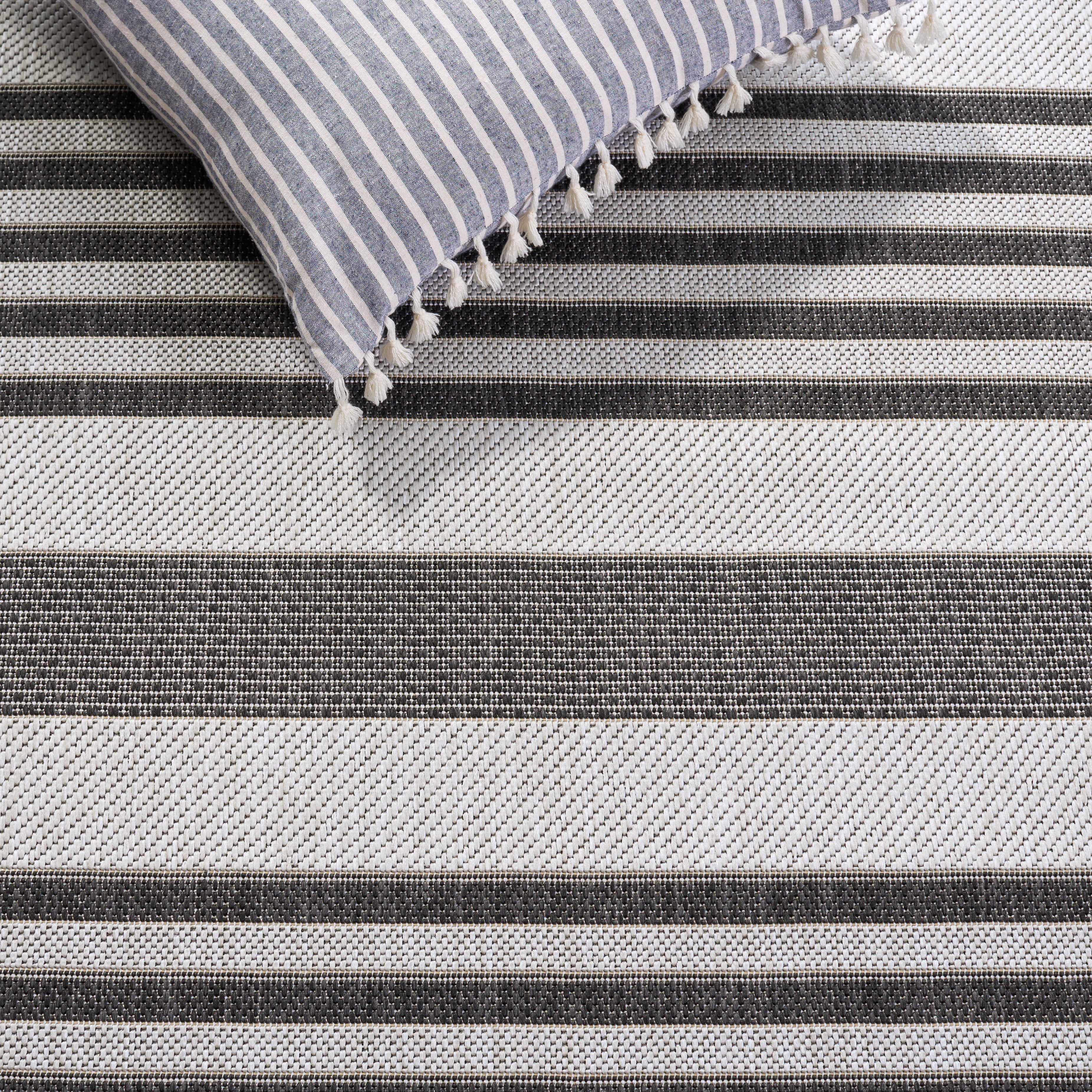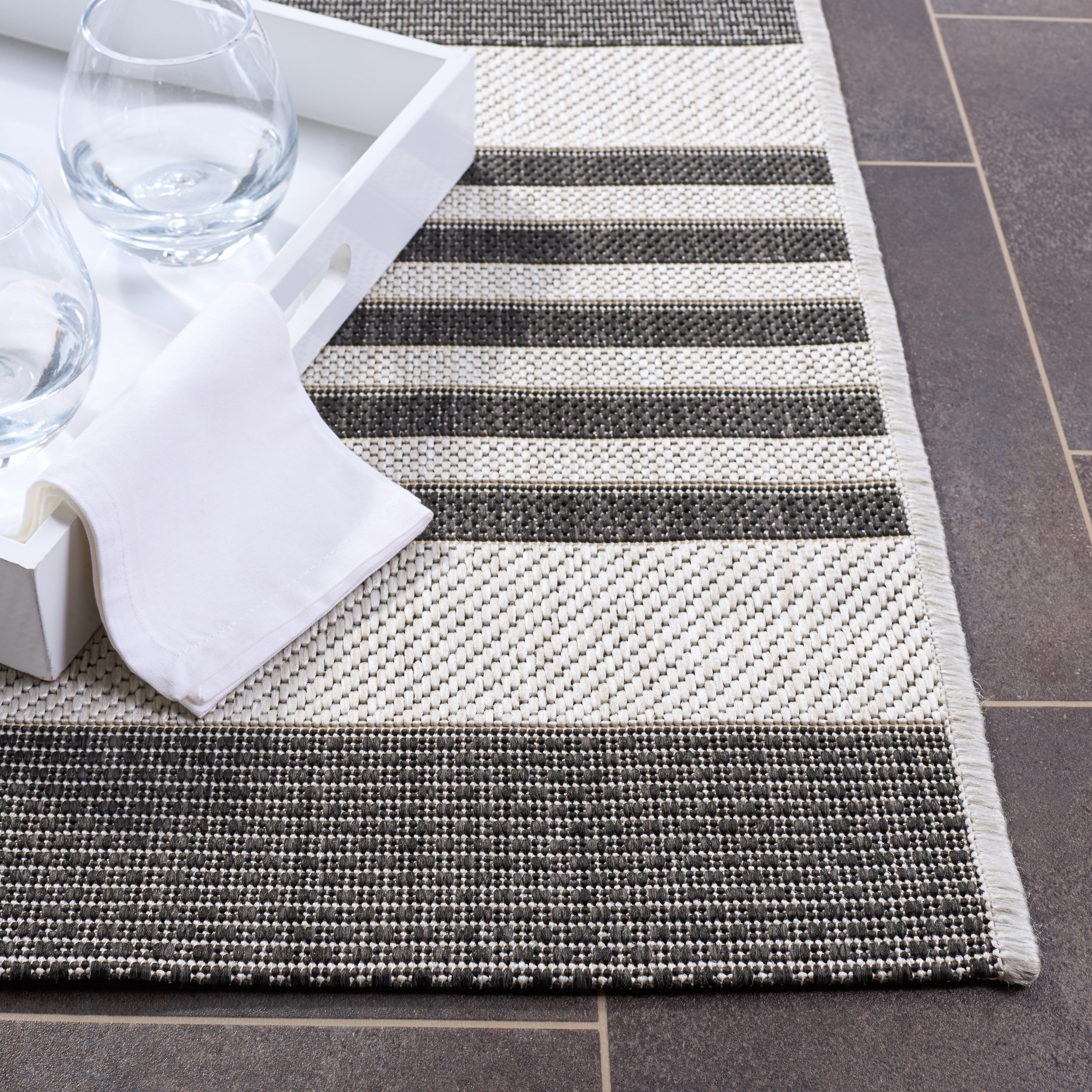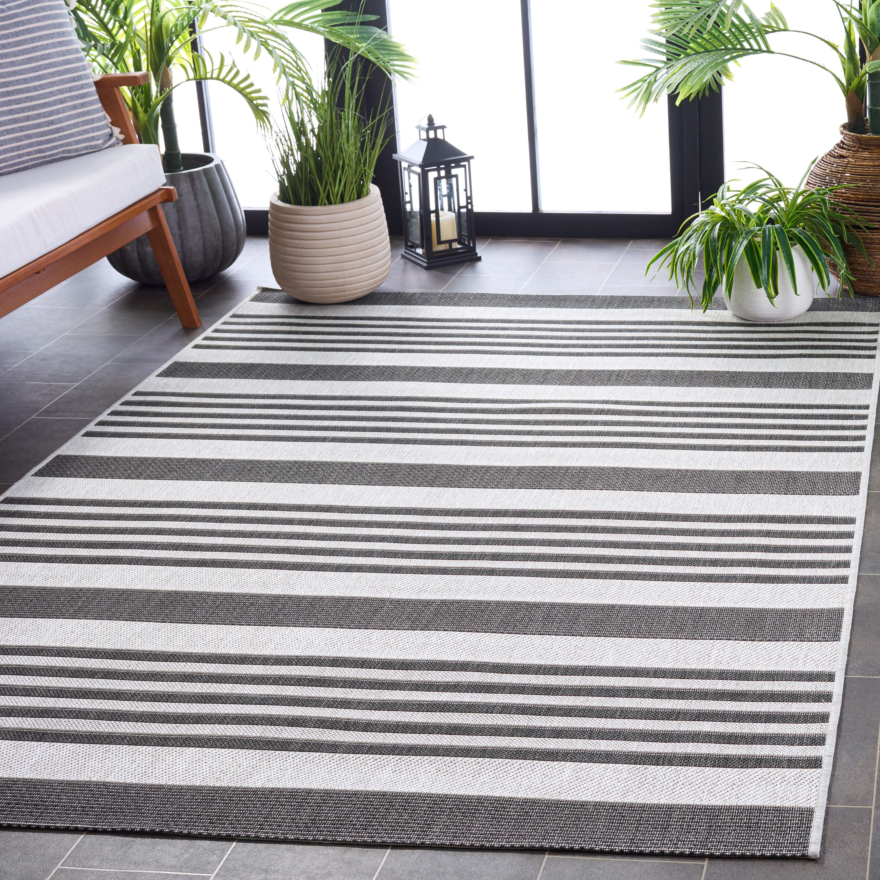 Shop more SAFAVIEH Outdoor Rugs at . SAFAVIEH Beach House Rug Collection SAFAVIEH Beach House Henry Striped Indoor/Outdoor Area Rug, Light Grey/Charcoal, 8′ x 10′ Beach House outdoor rugs blend interior design elegance with practical functionality, making them ideal for leisure living spaces and high-traffic areas. Crafted from durable synthetic yarns, these rugs resist stains, mold, mildew, and fading. Whether indoors or on your outdoor deck, Beach House rugs maintain their allure and durability throughout every season. Their timeless motifs and classic-contemporary styling complement any decor, while easy-care cleaning ensures they remain a practical and stylish investment for your home.