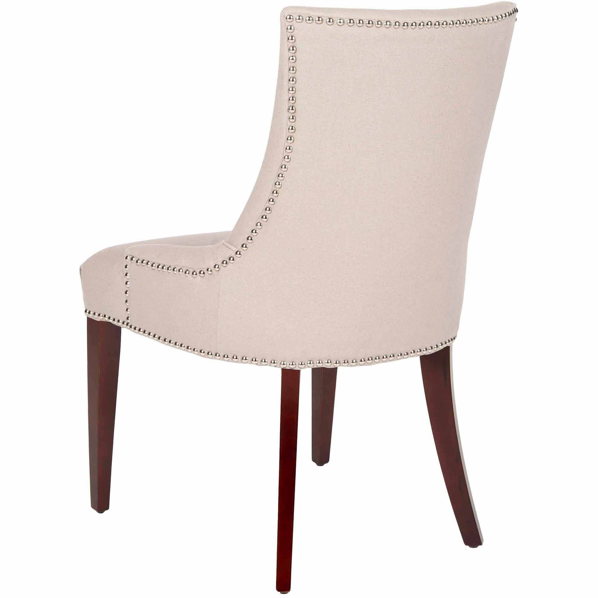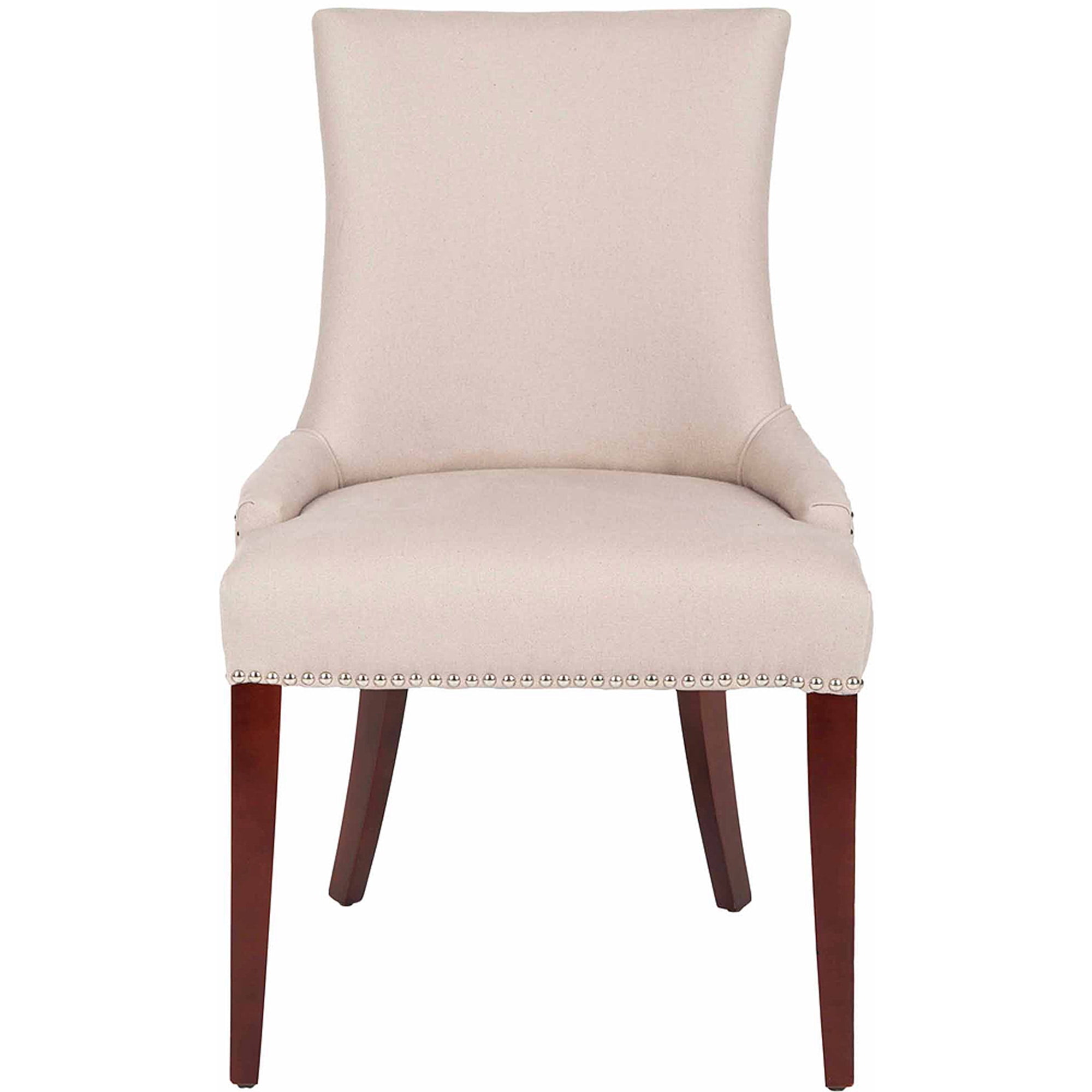 Contemporary design adds a chic look to your home Durable birch wood frame for long lasting longevity No assembly needed Color: Taupe Frame Color: Cherry Mahogany Item Dimension: 22 in. W x 24.8 in. D x 36.4 in. H Seat Dimension: 18.1 in. W x 18.1 in. D x 19.5 in. H Upholstered with Linen Contains Ca Foam/Polyester Fiber Leg Height: 14.17 in. Contains silver nailheads Item Weight: 17.6 lbs. Weight Capacity: 275 lbs. Accessories in life style photo(s) not included Please note: The images and product dimensions on our website are as accurate as possible. Due to differences in computer monitors, some furniture colors may vary slightly. Lengths and widths may vary from the published dimensions. We do our best to provide you with an exact measurement, but please be advised that some variation exists. To prevent overall soiling, frequent vacuuming or light brushing is recommended. Cushions and pillows should be turned on a weekly basis. Down-filled cushions should be brushed rather than vacuumed. Spot clean, using a mild water-free solvent or dry cleaning product. Only a professional cleaner should undertake a complete overall cleaning. The use of steam or water-based cleaners may cause excessive shrinking or staining.