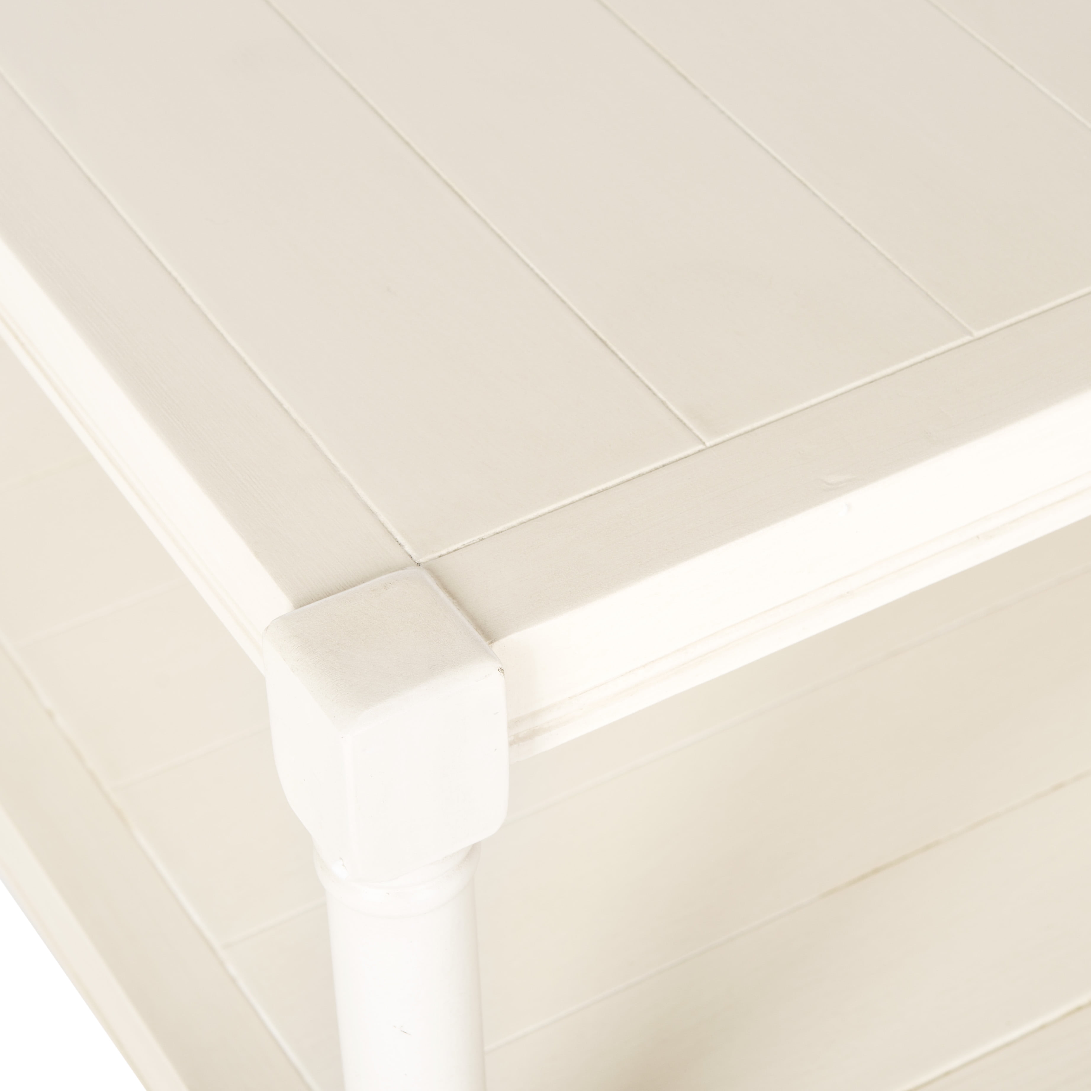 Contemporary design adds a chic look to your home Durable pine wood frame for long lasting longevity Minor assembly needed Color: White Item Weight: 33.1 lbs. Weight Capacity: 30 lbs. each tier Assembled dimensions: 47.2 in. W x 23.6 in. D x 18.9 in. H Shelf Dimension: 50.25 in. W x 26.5 in. D x 9.4 in. H Wood is a natural material with variations of color shade, configuration, streaks, and grain structure. Each individual piece of Safavieh furniture has characteristic markings that will differ from photo and showroom samples. Regular attention and maintenance of fine furniture can ensure its beauty for years to come. Always use felt pads under all articles to prevent discoloration or softening of the lacquer. Plastic and rubber bases on items can discolor wood. Accessories in life style photo(s) not included Please note: The images and product dimensions on our website are as accurate as possible. Due to differences in computer monitors, some furniture colors may vary slightly. Lengths and widths may vary from the published dimensions. We do our best to provide you with an exact measurement, but please be advised that some variation exists. Wood is a natural material with variations of color shade, configuration, streaks, and grain structure. Each individual piece of Safavieh furniture has characteristic markings that will differ from photo and showroom samples. Regular attention and maintenance of fine furniture can ensure its beauty for years to come. Always use felt pads under all articles to prevent discoloration or softening of the lacquer. Plastic and rubber bases on items can discolor wood.