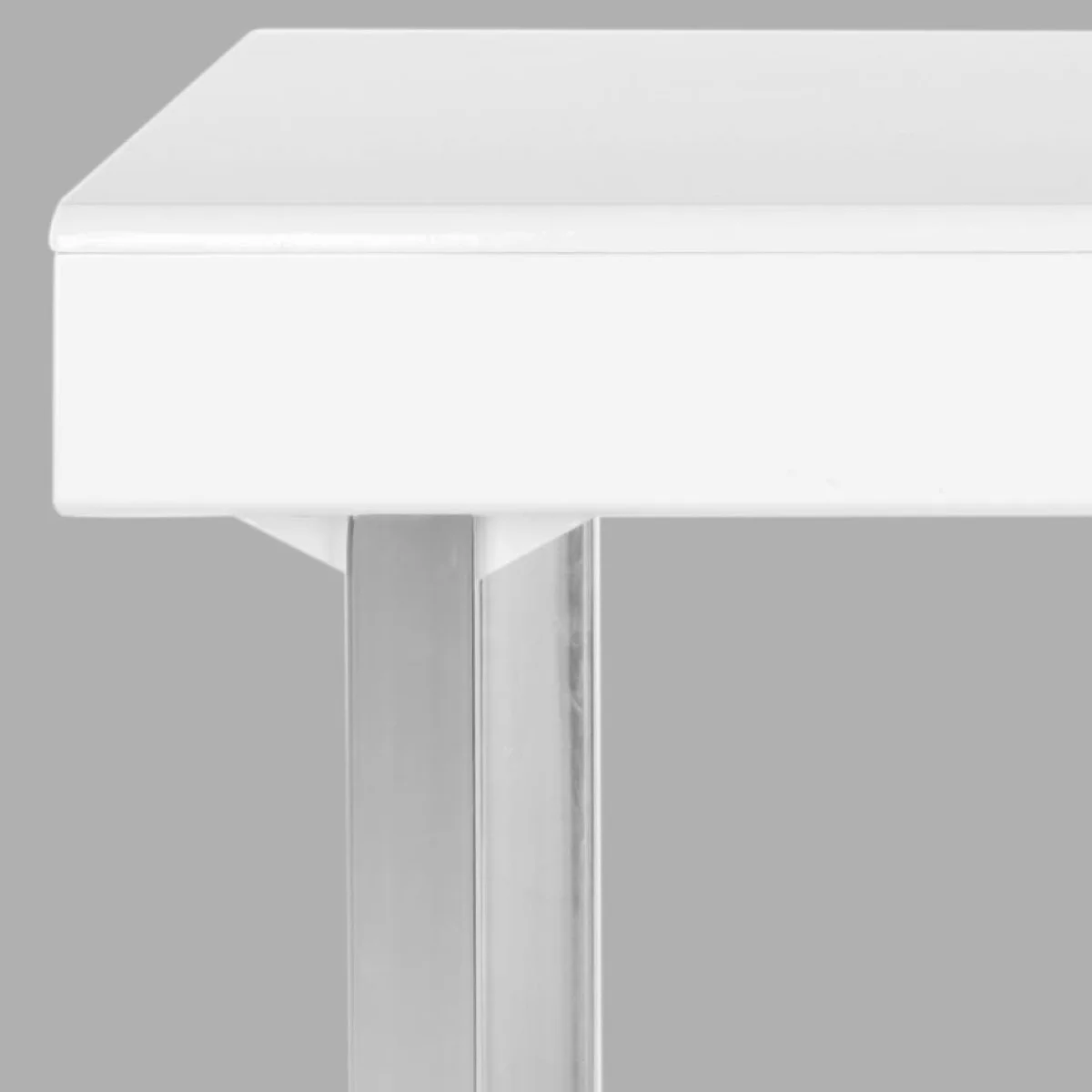 Contemporary design adds a chic look to your home Durable solid wood and iron frame for long-lasting longevity Minor assembly needed Color: White/Chrome Item Dimension: 43.3 in. W x 21.6 in. D x 29.5 in. H Pull-Out Dimension: 53.9 in. W x 21.6 in. D x 29.5 in. H Leg Height: 25 in. Pull-Out contains storage space Item Weight: 8.4 lbs. Weight Capacity: 55 lbs. Accessories in lifestyle photos not included Please note: The images and product dimensions on our website are as accurate as possible. Due to differences in computer monitors, some furniture colors may vary slightly. Lengths and widths may vary from the published dimensions. We do our best to provide you with an exact measurement, but please be advised that some variation exists. Dust regularly with a soft, dry cloth. Never use oiled or treated cloths on lacquered finishes. Some finishes can be wiped with a damp (not wet) cloth, followed at once by rubbing with a dry cloth to remove fingerprints and smudges. For persistent spots, gently clean with a soft cloth and a solution of water and mild soap, make sure to wipe dry. Use adhesive felt pads, coasters and placemats to protect your furniture.