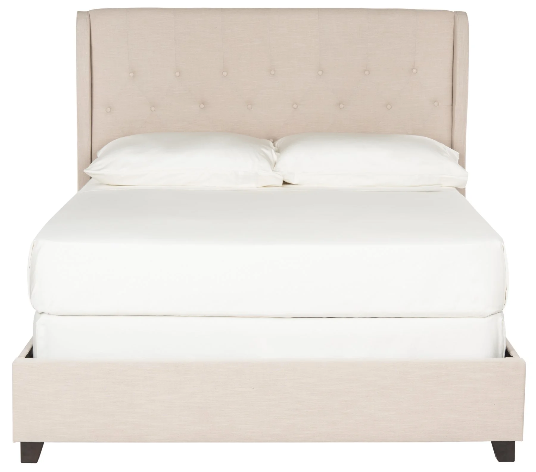 Indulge in the luxury of a fully upholstered bed with all the elegant touches of a custom design. Light beige pure linen covers everything from a button-tufted headboard with enveloping wing arms to its footboard with espresso rubberwood legs.