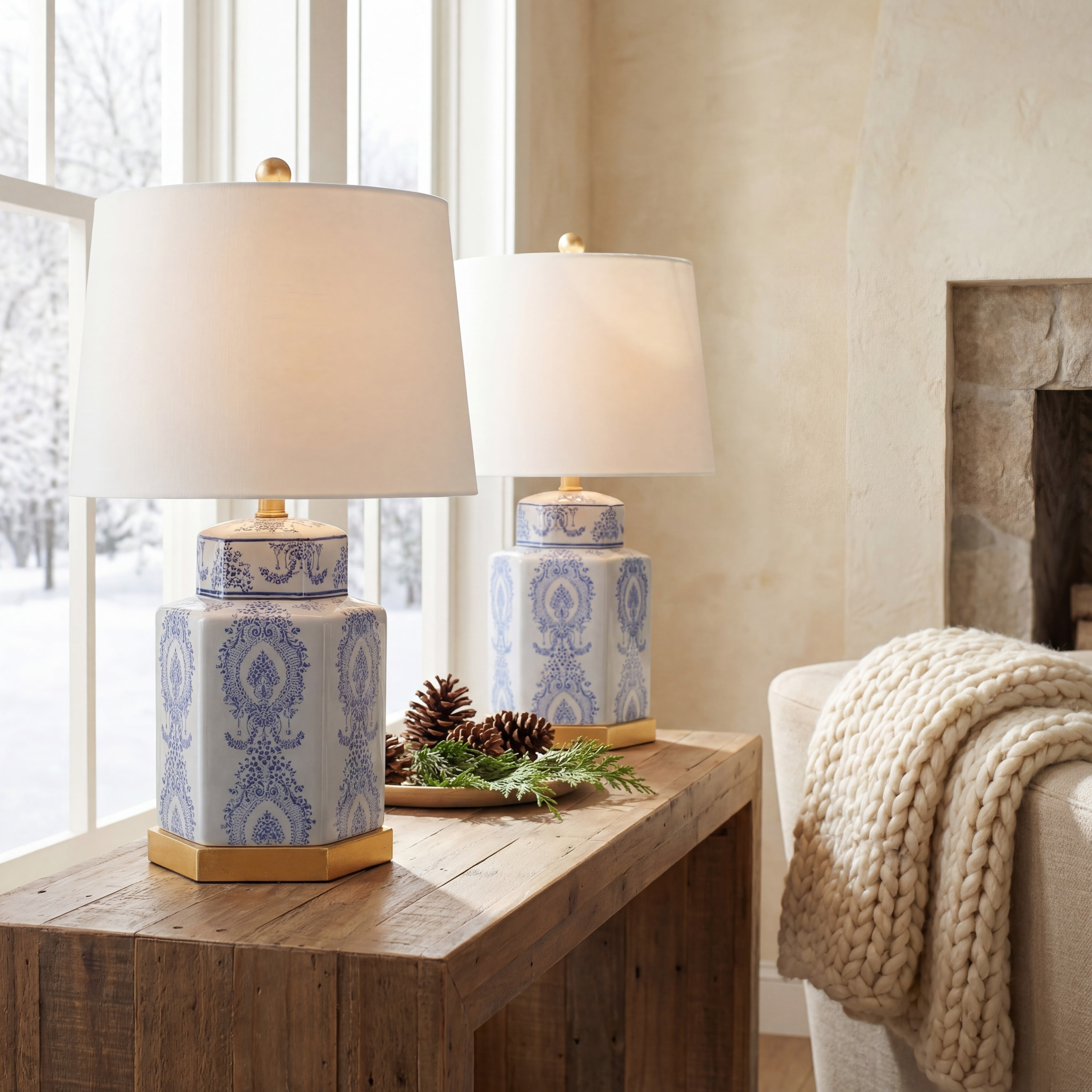Contemporary design adds a chic look to your home Durable frame for long lasting longevity Easy to clean and maintain Minor assembly needed Color: Blue/White Shade Color: Off-White Item Dimensions: 14 in. W x 14 in. D x 23 in. H Crafted with Ceramic Shade Material: 100% Cotton Shade Height: 10 in. H Shade Bottom Dimensions: 14 in. L x 14 in. W Shade Top Dimensions: 12 in. W x 12 in. L Traditional Harp Style Harp Color: Gold Harp Height: 8 in. H Cord Color: Light Grey Cord Length: 60 in. Lamp Body Dimensions: 7.6 in. W x 7.6 in. D x 10.3 in. H Bottom Base Dimension: 8 in. W x 8 in. D x 1 in. H Pendant Dimension: 60 in. Lamp Certification: UL Light Bulb Base Type: E26 Switch Mechanism: Rotary Switch Type of Bulb Included: LED A19 9W Max Wattage: Type “A” 100W or CFL 23W or LED 12W Lumen: 800 Quantity of Bulbs: 1 Accessories in life style photo(s) not included Please note: The images and product dimensions on our website are as accurate as possible. Due to differences in computer monitors, some item’s color may vary slightly. Before cleaning any lamp shade or fixture, disconnect the power source. Wipe with a soft, dry cloth. Avoid the use of chemicals and household cleaners as they may damage the finish.