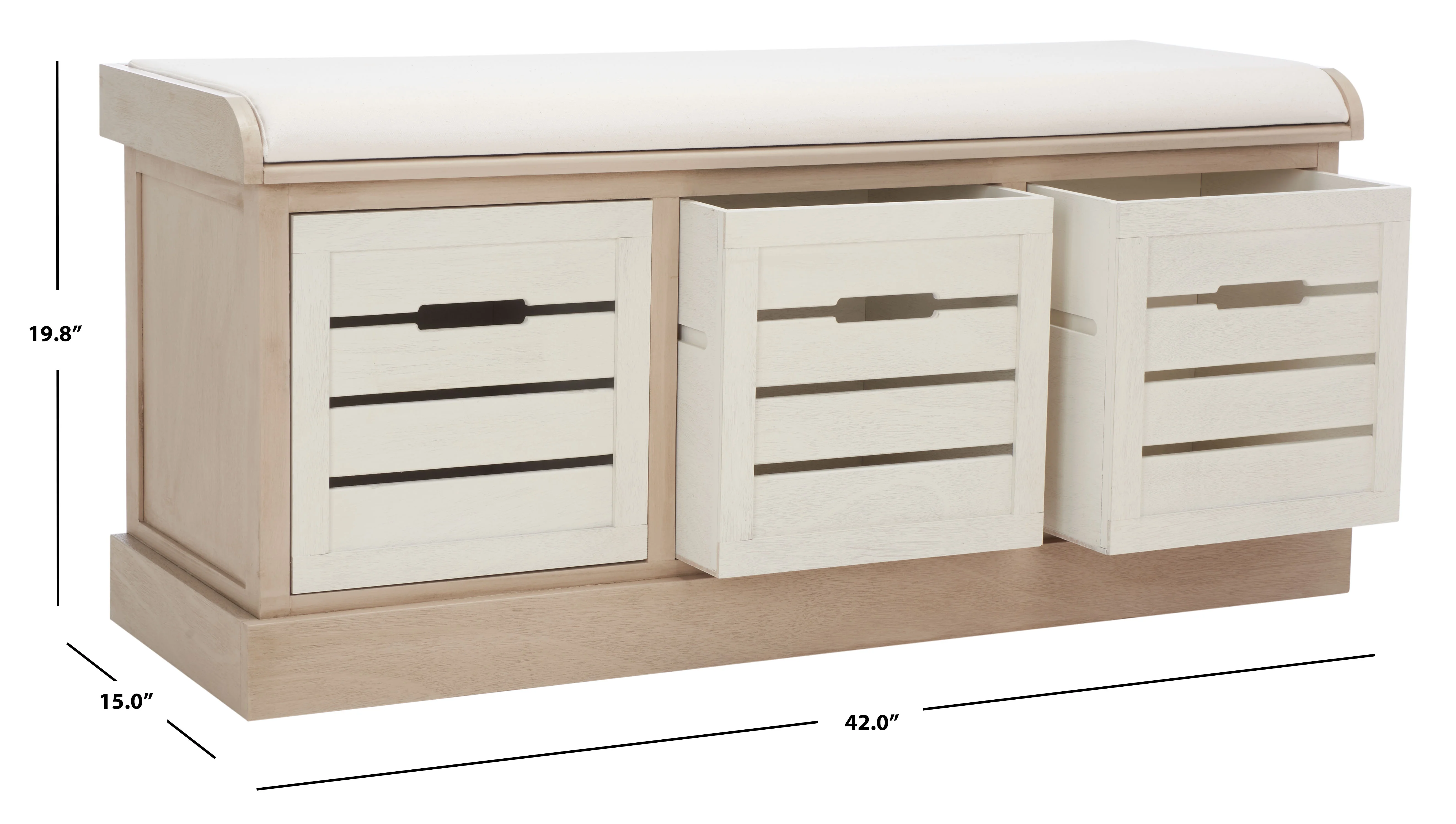 Durable wood frame for long lasting longevity No assembly needed Color: Sand Frame/Distressed White Drawers Overall Dimension: 42 in. W x 15 in. D x 19.8 in. H Item Weight: 52.8 lbs. Weight Capacity: 175 lbs. Finish Surface Treatement: Water Based Paint To prevent overall soiling, frequent vacuuming or light brushing is recommended. Cushions and pillows should be turned on a weekly basis. Down filled cushions should be brushed rather than vacuumed. Spot clean, using a mild water free solvent or dry cleaning product. Only a professional cleaner should undertake a complete overall cleaning. The use of steam or water based cleaners may cause excessive shrinking or staining.