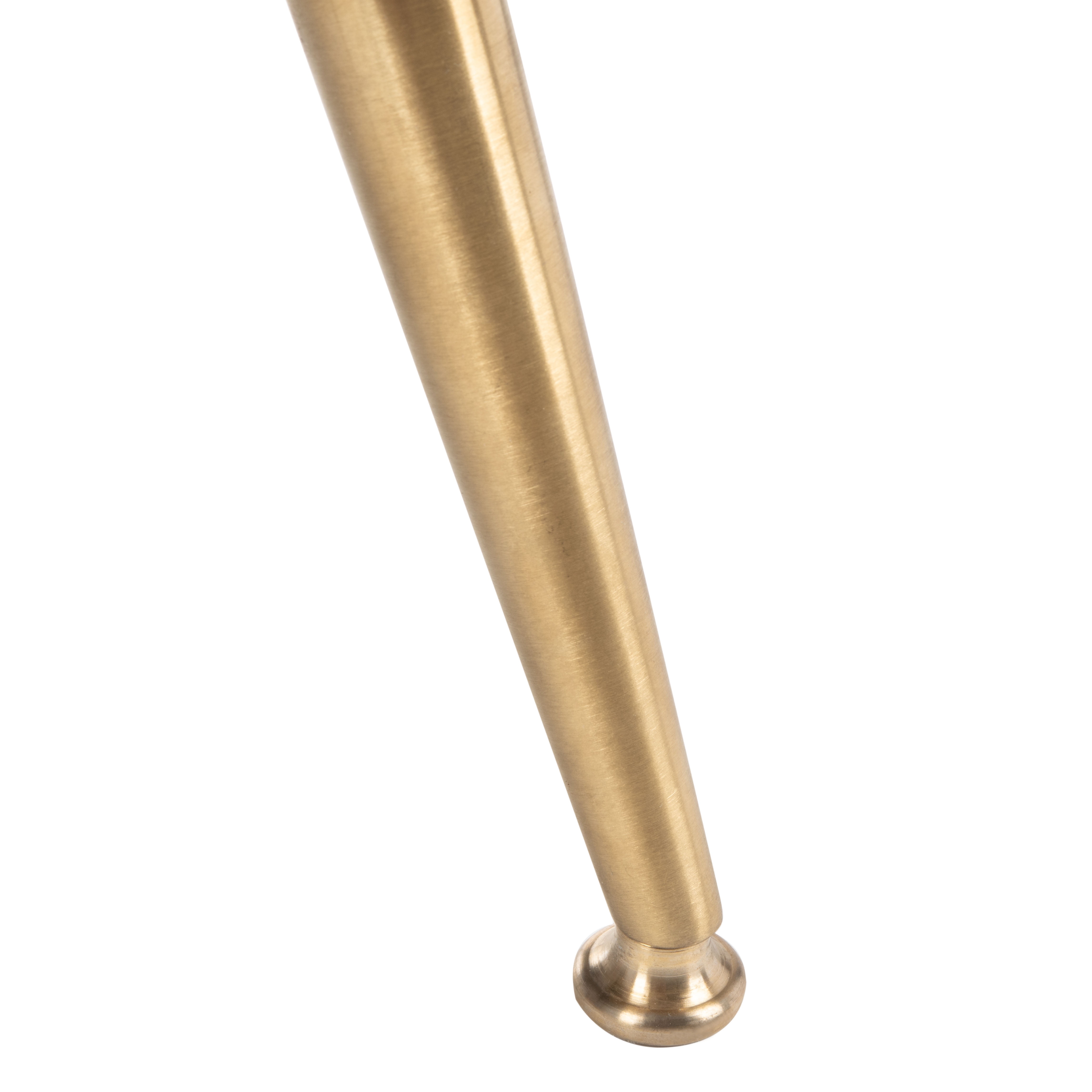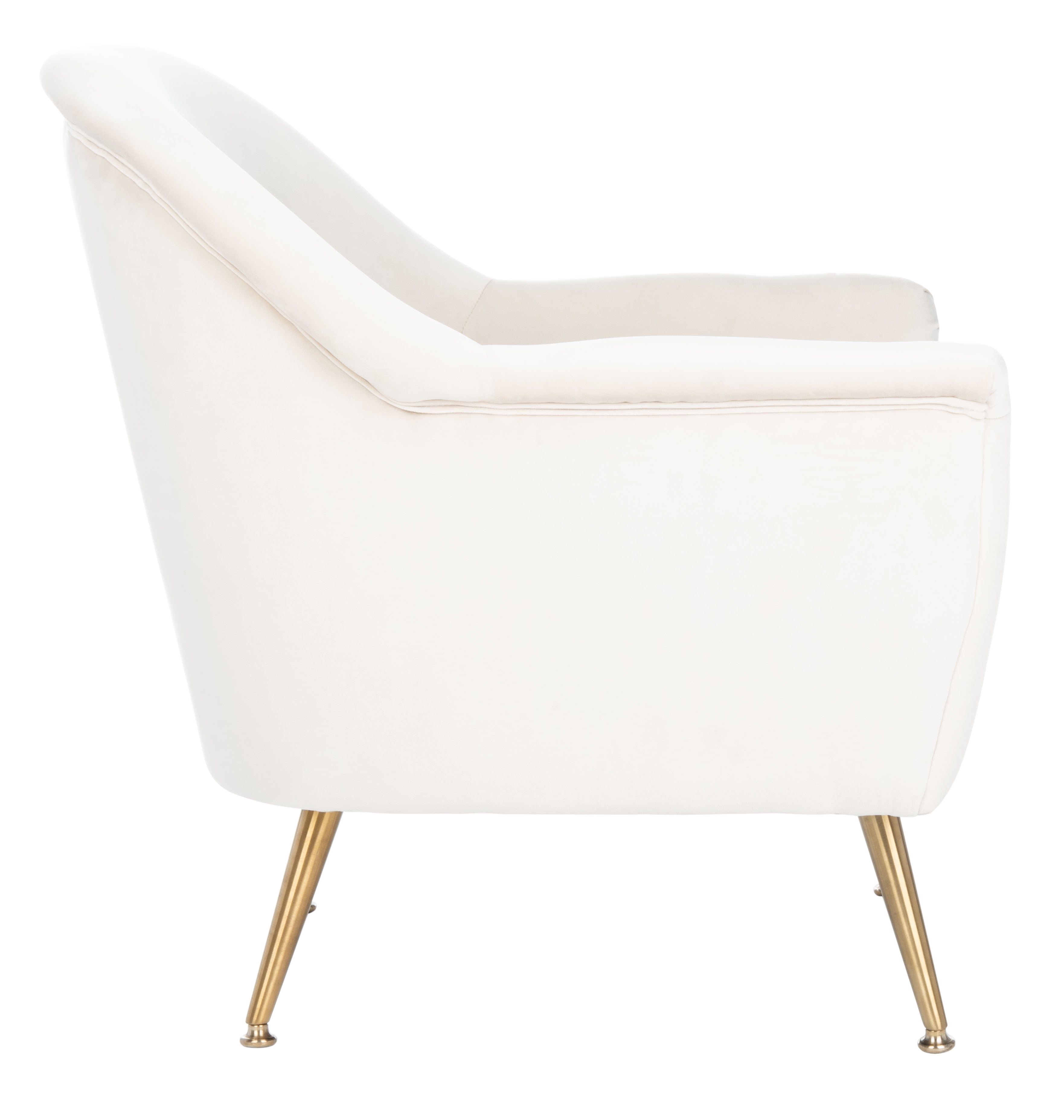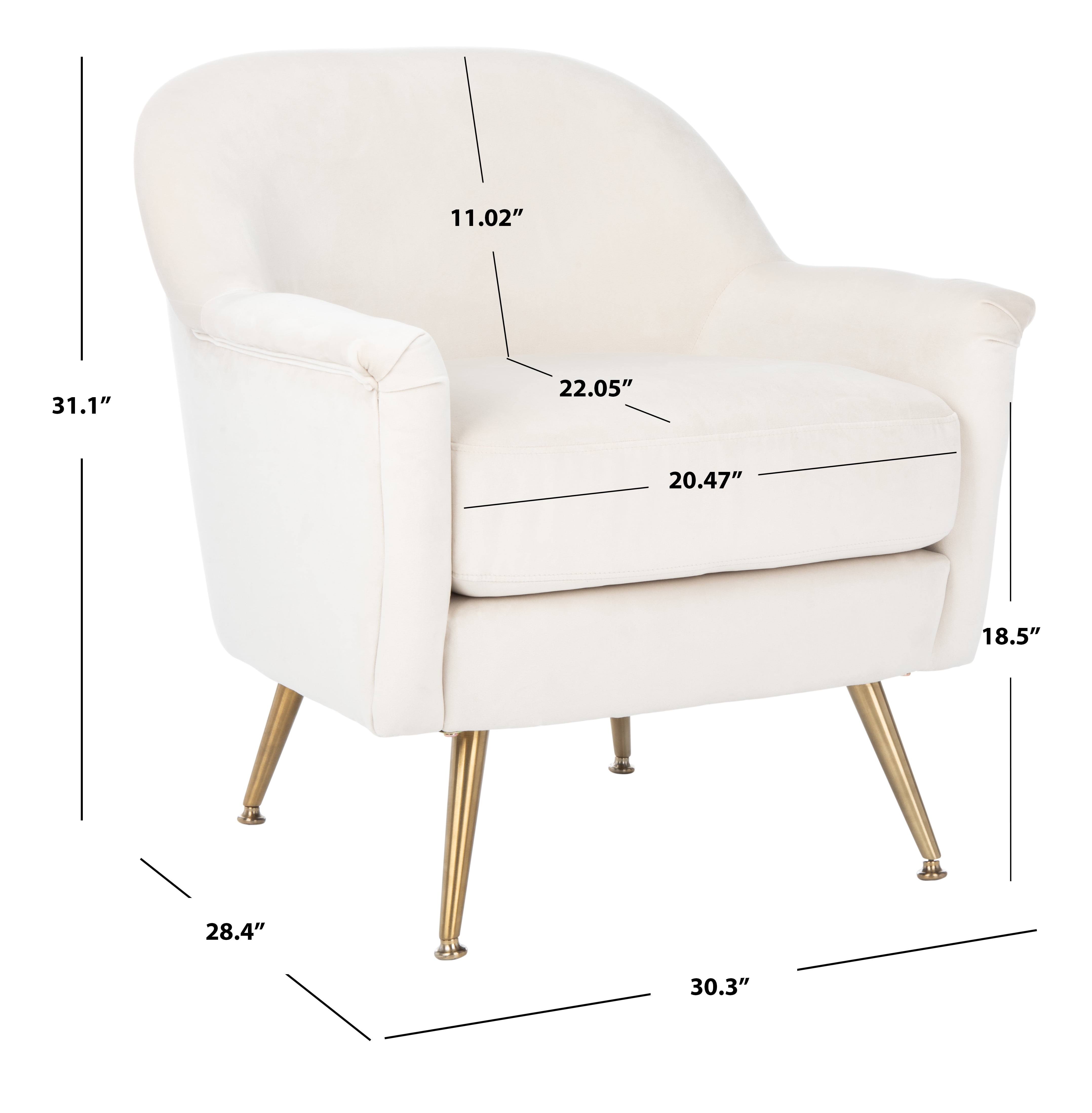 Durable solid frame for long lasting longevity Minor assembly needed Color: Ivory Velvet/Brass Overall Dimension: 28.7 in. W x 22.4 in. D x 30.5 in. H Item Weight: 29.76 lbs. Weight Capacity: 275 lbs. Finish Surface Treatement: Brushed To prevent overall soiling, frequent vacuuming or light brushing is recommended. Cushions and pillows should be turned on a weekly basis. Down-filled cushions should be brushed rather than vacuumed. Spot clean, using a mild water-free solvent or dry cleaning product. Only a professional cleaner should undertake a complete overall cleaning. The use of steam or water-based cleaners may cause excessive shrinking or staining. Leg Height: 7.5 in. Upholstery with Polyester Velvet Armrest Height: 21.2 in. Armrest Length: 16 in. Seat Dimensions: Seat Cushion: 19.5 x 22 x 12; Back Cushion: 25.5 x 3.5 x 14.5 in. Backrest Height: 14.5 in.