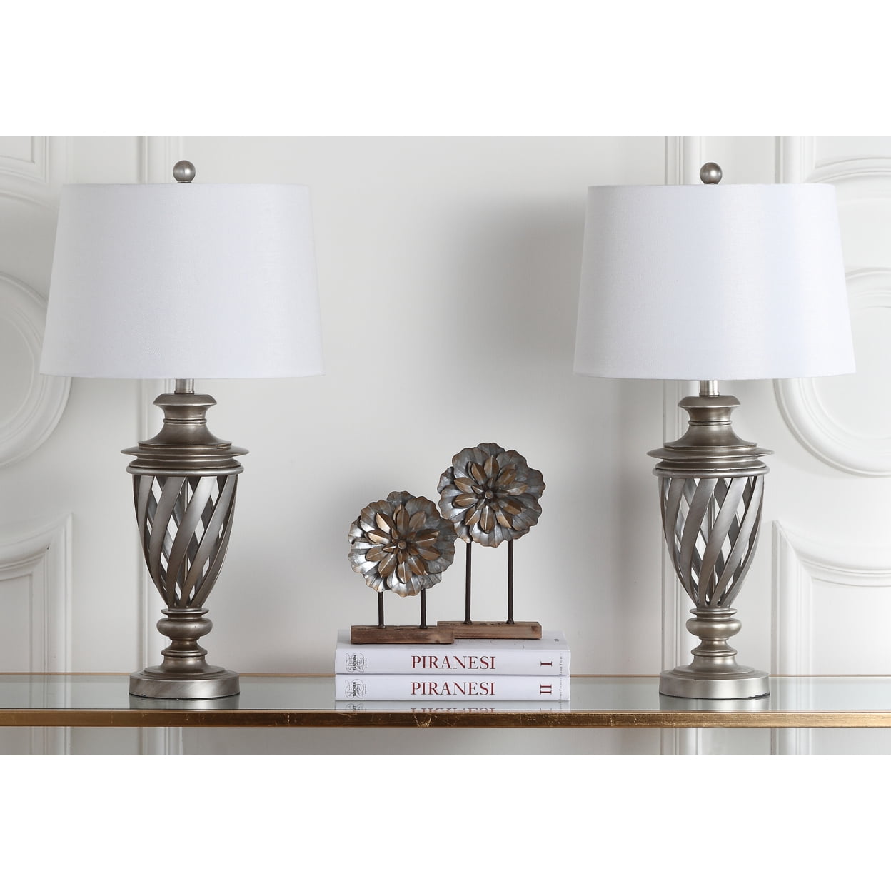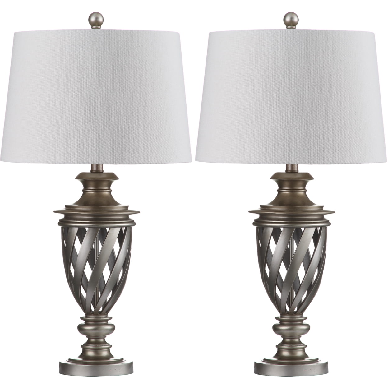 Named for the famous poet, the Safavieh Byron LIT4322A Table Lamp – Set of 2 shows off an artistic take on the classic urn body. The openwork metal urns reflect modern aesthetics but are finished in aged silver for a touch of timeworn appeal. Tapered white cotton shades guide the eye down to the base and focus illumination from the included CFL bulbs onto your tabletop.