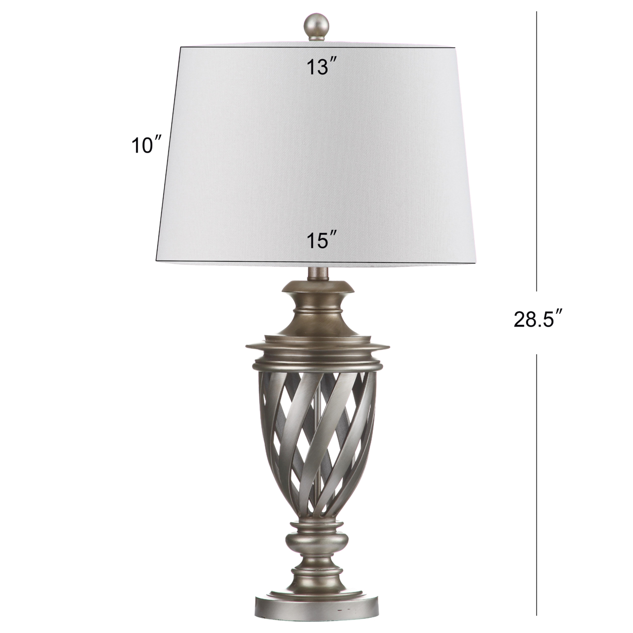 Contemporary design adds a chic look to your home Durable frame for long lasting longevity Easy to clean and maintain Minor assembly needed Color: Antique Silver Shade Color: Off-White Item Dimensions: 15 in. W x 15 in. D x 28.5 in. H Crafted with Iron Shade Material: 100% Cotton Shade Height: 10 in. H Shade Bottom Dimensions: 15 in. L x 15 in. W Shade Top Dimensions: 13 in. W x 13 in. L Traditional Harp Style Harp Color: Silver Harp Height: 8 in. H Cord Color: Light Grey Cord Length: 60 in. Lamp Body Dimensions: 7 in. W x 7 in. D x 4 in. H Bottom Base Dimension: 5.875 in. W x 5.875 in. D x 2 in. H Pendant Dimension: 60 in. Lamp Certification: UL Light Bulb Base Type: E26 Switch Mechanism: Rotary Switch Type of Bulb Included: CFL Max Wattage: 13W Lumen: 830 Quantity of Bulbs: 2 Accessories in life style photo(s) not included Please note: The images and product dimensions on our website are as accurate as possible. Due to differences in computer monitors, some item’s color may vary slightly. Before cleaning any lamp shade or fixture, disconnect the power source. Wipe with a soft, dry cloth. Avoid the use of chemicals and household cleaners as they may damage the finish.
