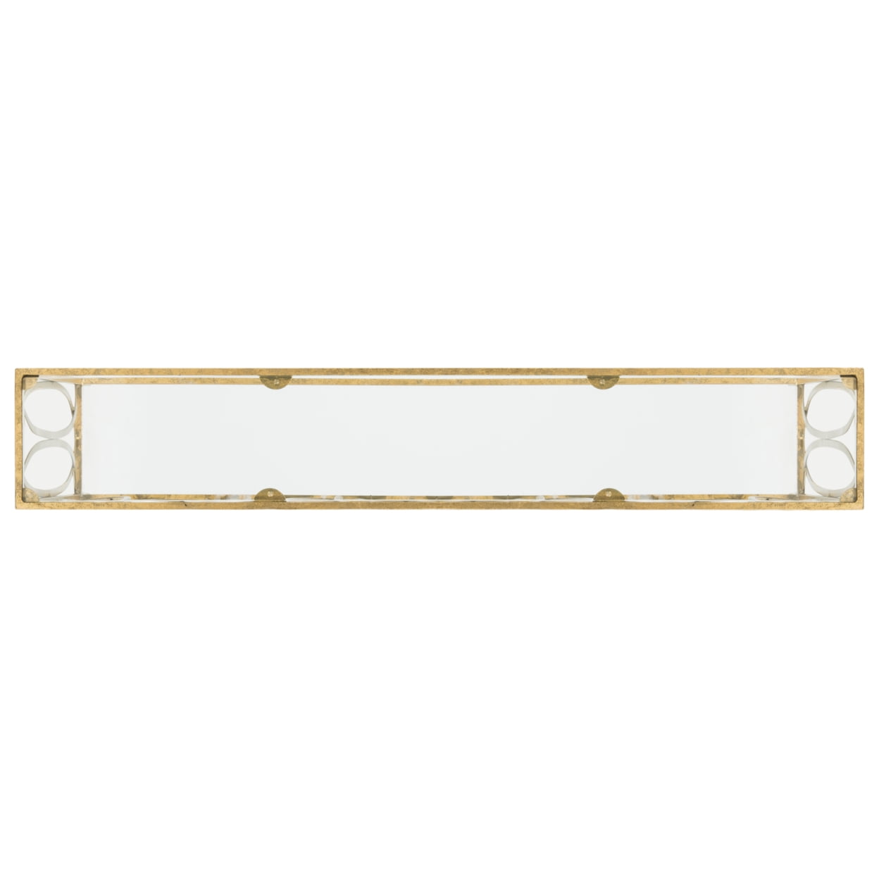 Dimensions: 48W x 8D x 30H in. Crafted of iron Gold foil finish Linked oval motif Polished glass top No assembly required