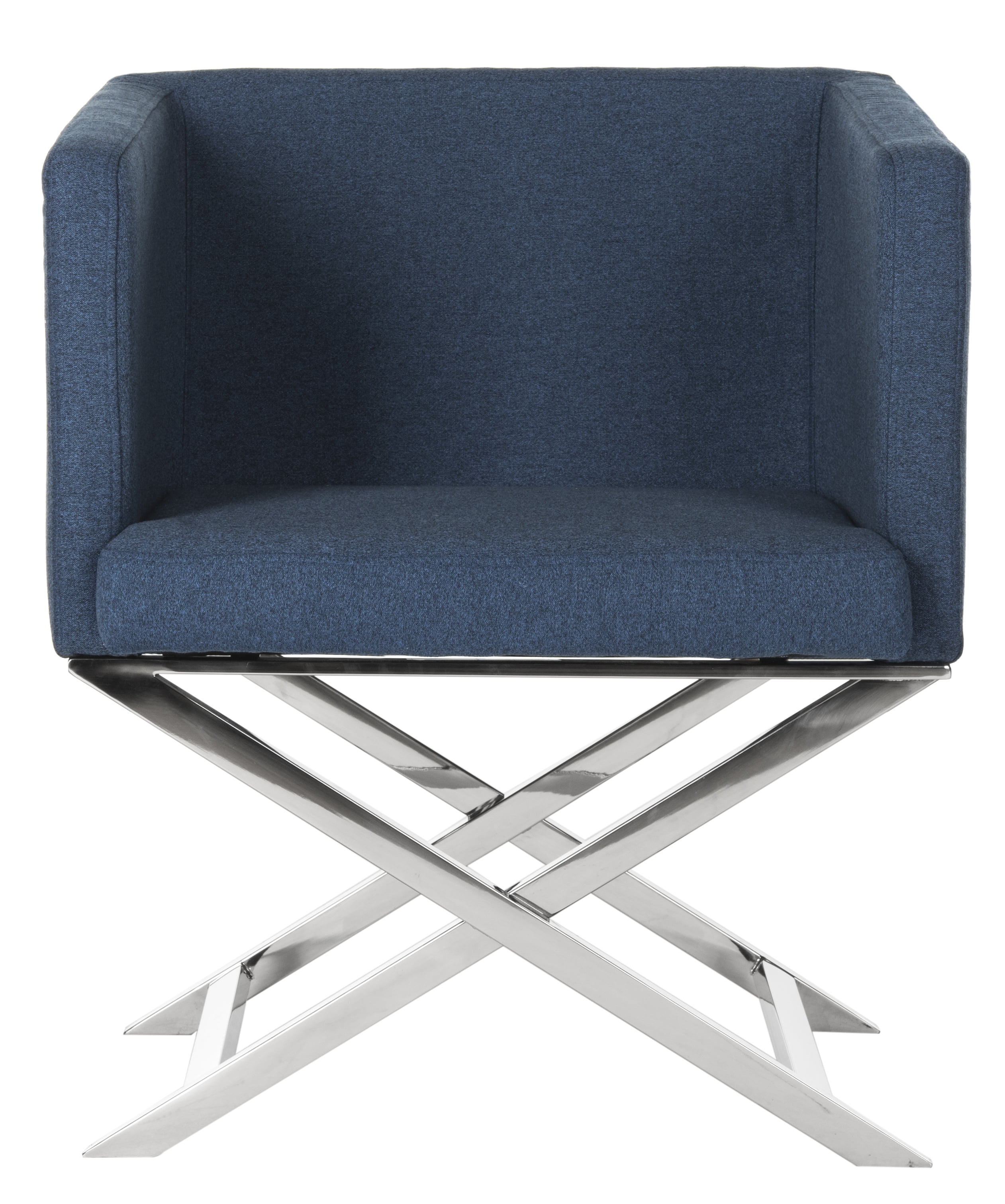 Shop Safavieh at . Save Money. Live Better. Safavieh Celine Modern Glam Chrome Upholstered Cross Leg Chair Create a dramatic scene in any space with this contemporary spin on the classic director?s chair. A designer favorite, its plush, welcoming seat is upholstered in a modern navy hue that complements the metallic shine of its polished chrome finish.