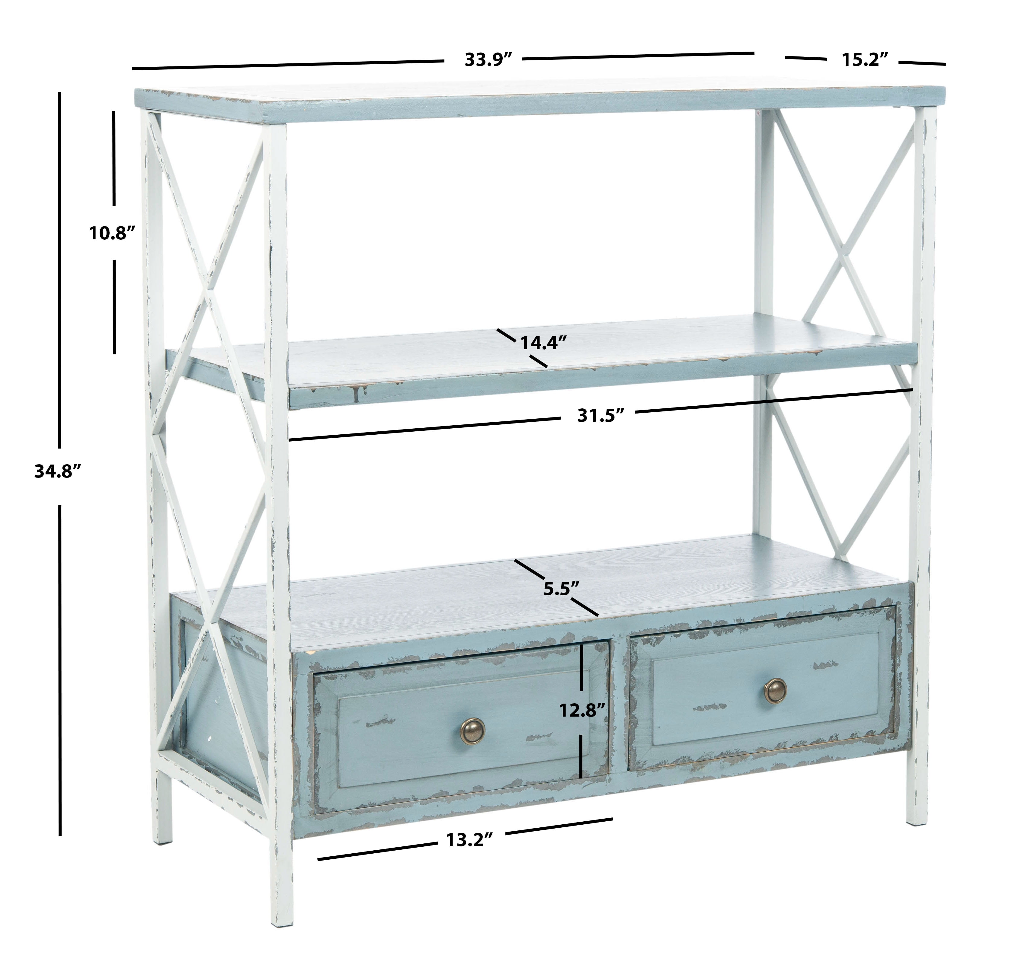 Contemporary design adds a chic look to your home Durable frame for long lasting longevity Minor assembly needed Color: Pale Blue/White Smoke Item Dimensions: 33.9 in. W x 15.2 in. D x 34.8 in. H Drawer 13.19 in. W x 12.8 in. D x 5.5 in. H Middle To Top Height: 12 in. Bottom To Mid Height: 11 in Shelf: 31.50 in. W x 10.83 in in. D x 14.37 in. H Item Weight: 33.1 lbs Weight Capacity: 50 lbs. Wood is a natural material with variations of color shade, configuration, streaks, and grain structure. Each individual piece of Safavieh furniture has characteristic markings that will differ from photo and showroom samples. Regular attention and maintenance of fine furniture can ensure its beauty for years to come. Always use felt pads under all articles to prevent discoloration or softening of the lacquer. Plastic and rubber bases on items can discolor wood. Accessories in life style photo(s) not included Please note: The images and product dimensions on our website are as accurate as possible. Due to differences in computer monitors, some furniture colors may vary slightly. Lengths and widths may vary from the published dimensions. We do our best to provide you with an exact measurement, but please be advised that some variation exists. Dust regularly with a soft, dry cloth. Never use oiled or treated cloths on lacquered finishes. Some finishes can be wiped with a damp (not wet) cloth, followed at once by rubbing with a dry cloth to remove fingerprints and smudges. For persistent spots, gently clean with a soft cloth and a solution of water and mild soap, make sure to wipe dry. Use adhesive felt pads, coasters and placemats to protect your furniture.