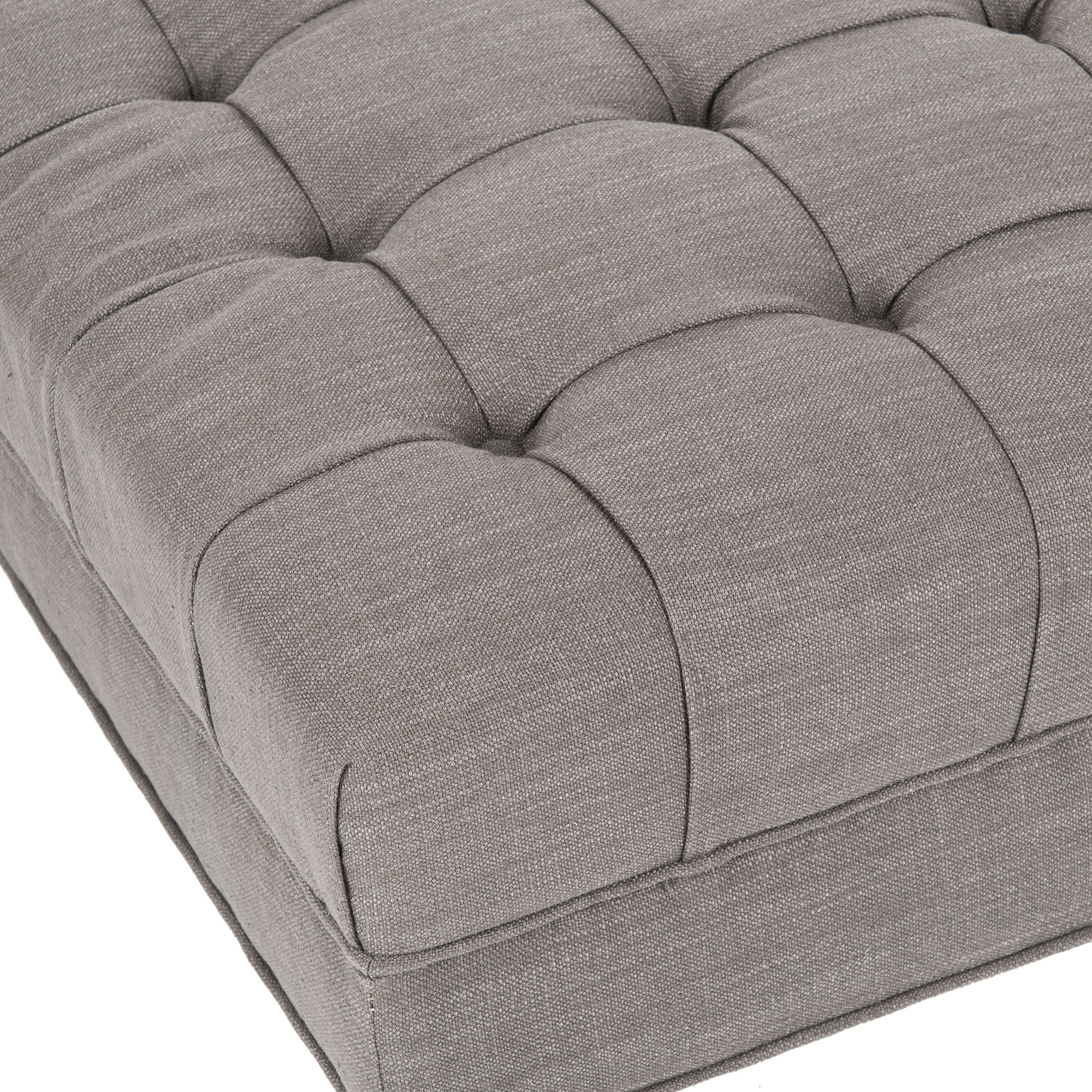 Contemporary design adds a chic look to your home Birch wood frame for long lasting longevity Minor assembly needed Color: Charcoal Brown Wood Color: Espresso Assembled dimensions: 16.5 in. H x 34.8 in. W x 34.8 in. D Upholstered with 60% linen/40% polyester Fill Material: CA Foam Tufted buttons for a chic design Casters for easy mobility Item Weight: 31.2 lbs. Weight Capacity: 450 lbs. Accessories in life style photo(s) not included Please note: The images and product dimensions on our website are as accurate as possible. Due to differences in computer monitors, some furniture colors may vary slightly. Lengths and widths may vary from the published dimensions. We do our best to provide you with an exact measurement, but please be advised that some variation exists. To prevent overall soiling, frequent vacuuming or light brushing is recommended. Cushions and pillows should be turned on a weekly basis. Down-filled cushions should be brushed rather than vacuumed. Spot clean, using a mild water-free solvent or dry cleaning product. Only a professional cleaner should undertake a complete overall cleaning. The use of steam or water-based cleaners may cause excessive shrinking or staining.