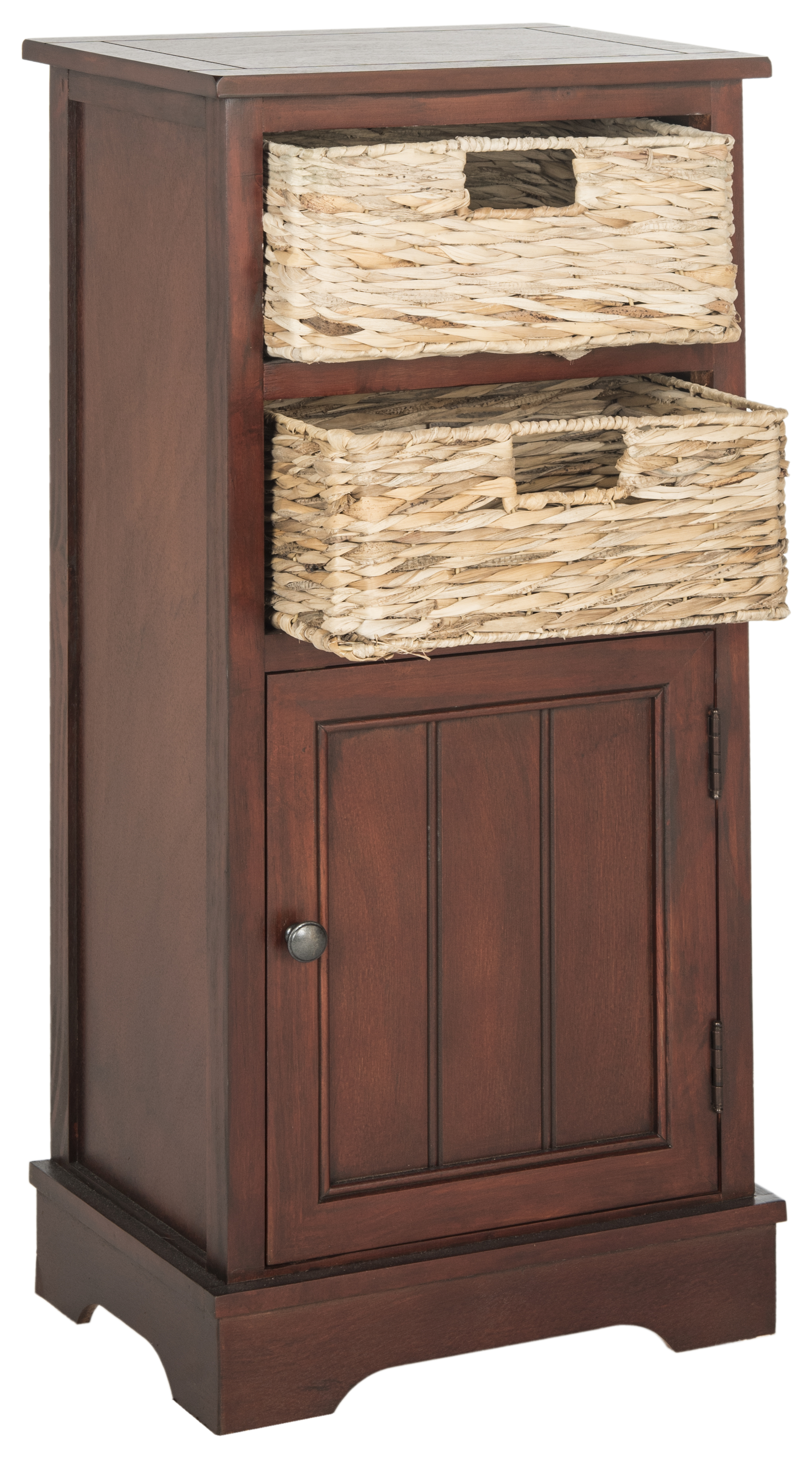 Contemporary design adds a chic look to your home Durable pine wood frame for long lasting longevity No Assembly Required Color: Cherry Item Dimensions: 15.9 in. W x 11.8 in. D x 35 in. H Basket Dimensions: 12.5 in. W x 10 in. D x 5.7 in. H Features 2 wicker baskets & a closed-door cabinet for your storage use Item Weight: 22 lbs. Weight Capacity: 200 lbs Wood is a natural material with variations of color shade, configuration, streaks, and grain structure. Each individual piece of Safavieh furniture has characteristic markings that will differ from photo and showroom samples. Regular attention and maintenance of fine furniture can ensure its beauty for years to come. Always use felt pads under all articles to prevent discoloration or softening of the lacquer. Plastic and rubber bases on items can discolor wood. Accessories in life style photo(s) not included Please note: The images and product dimensions on our website are as accurate as possible. Due to differences in computer monitors, some furniture colors may vary slightly. Lengths and widths may vary from the published dimensions. We do our best to provide you with an exact measurement, but please be advised that some variation exists. Dust regularly with a soft, dry cloth. Never use oiled or treated cloths on lacquered finishes. Some finishes can be wiped with a damp (not wet) cloth, followed at once by rubbing with a dry cloth to remove fingerprints and smudges. For persistent spots, gently clean with a soft cloth and a solution of water and mild soap, make sure to wipe dry. Use adhesive felt pads, coasters and placemats to protect your furniture.