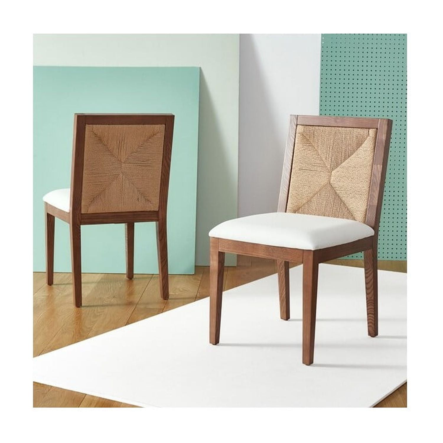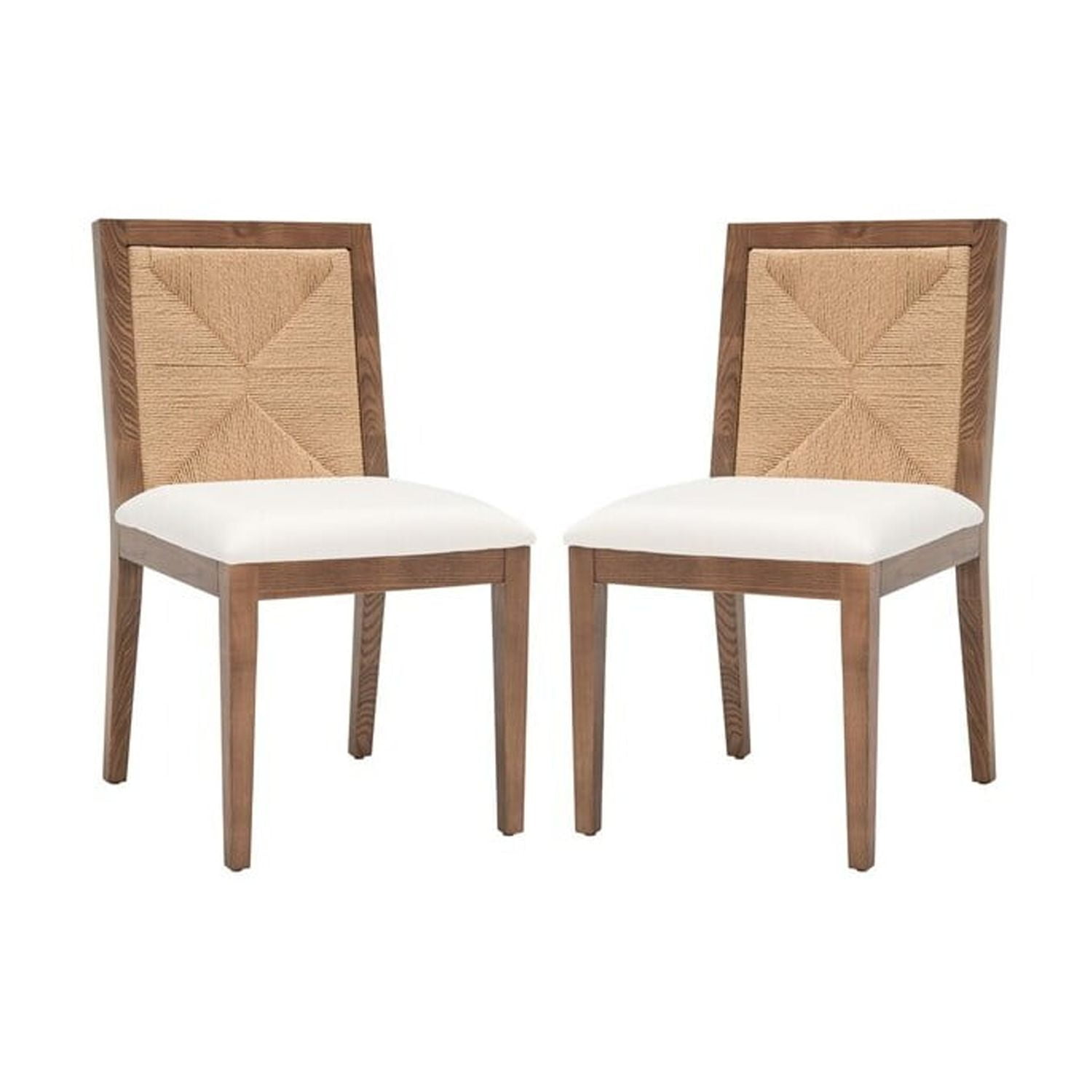 Shop Safavieh at . Save Money. Live Better. SAFAVIEH Couture Emilio Modern Linen Solid Dining Chair, Walnut/Natural (Set of 2) Create a modern and inviting setting with our Emilio dining chair. Our modern and neatly proportioned chair is updated with a beautiful woven back. It showcases a rush weave pattern to attain simple yet striking graphics. The natural textures are framed with a walnut ash wood framework. Our dining chair effortlessly combines modern elegance with the beauty of organic textures. It includes a slim yet comfy white cushion to elevate your dining experience.