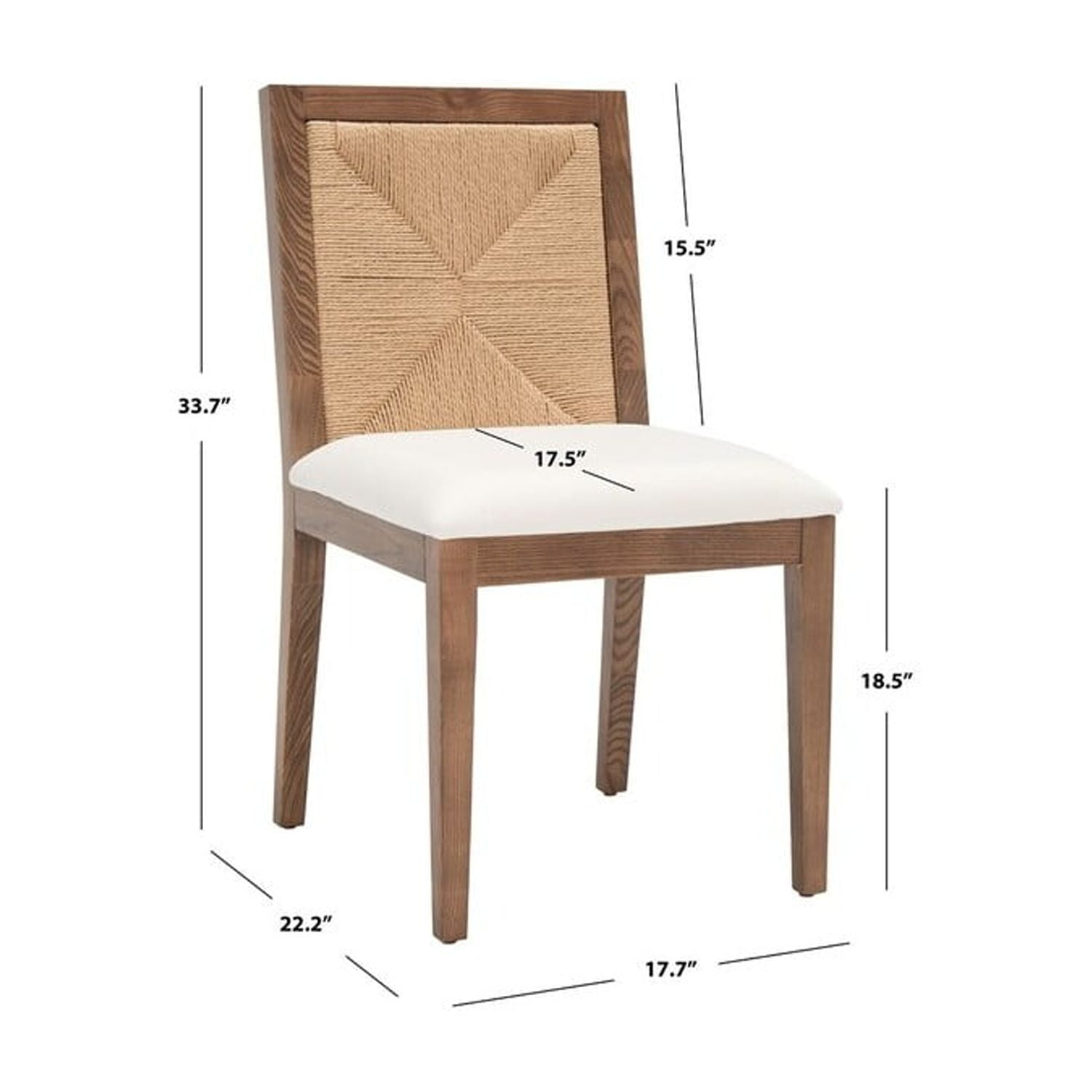 Durable wood frame for long lasting longevity. No assembly required Color: Walnut/Natural Product Dimensions: 17.7 in. W x 22.2 in. D x 33.7 in. H Weight Capacity: 275 lbs Wood Content: Oak Solid Wood/Woven Paper Wood Color: Walnut Fabric Content: Linen Body Material: Oak Seat Construction: Foam Underneath Clearance: 16.1 in. Cushion Thickness: 2.4 in. Seat Dimensions: 17.7 in. W x 17.5 in. D x 18.5 in. H Leg Dimensions: 2 in. W x 2 in. D x 16.1 in. H