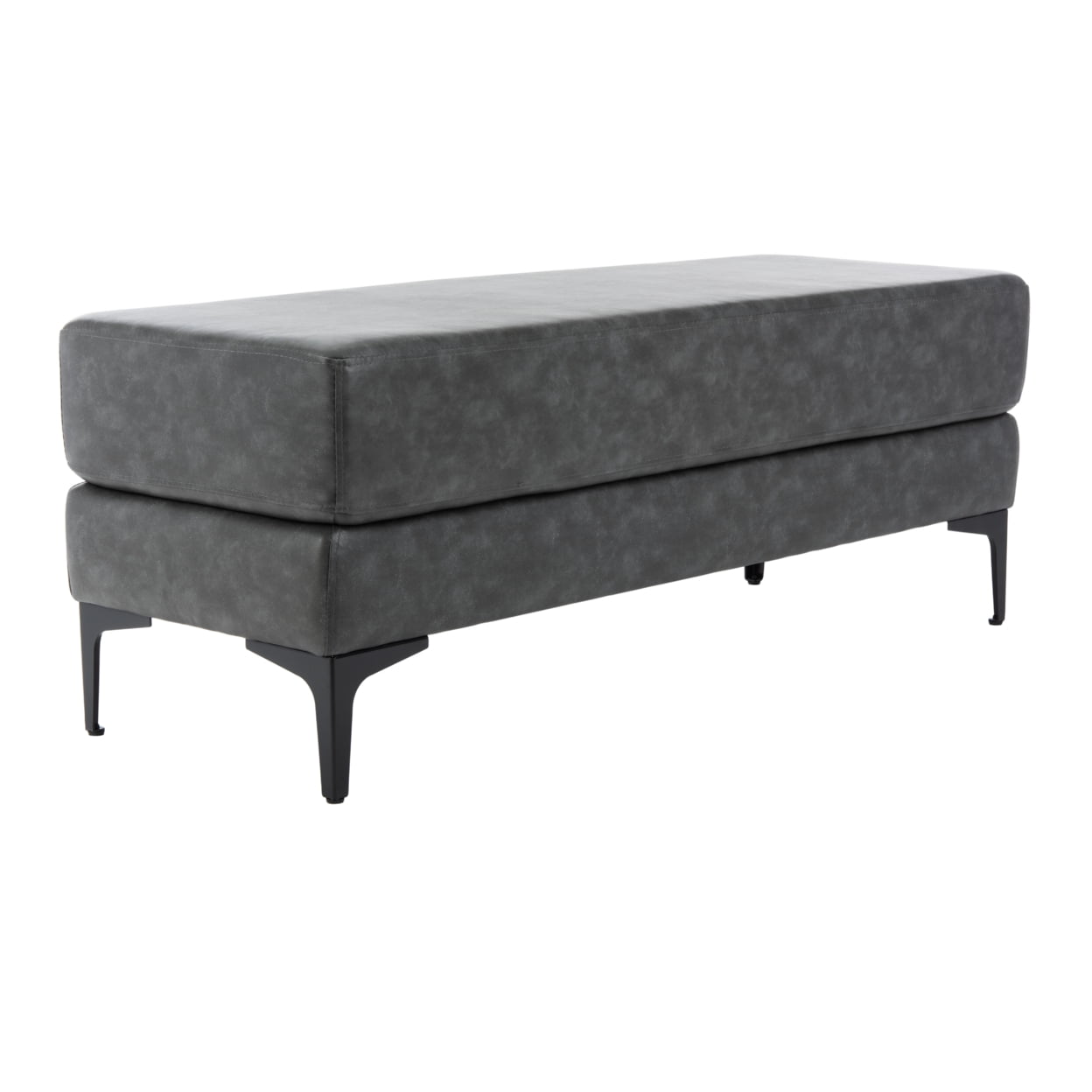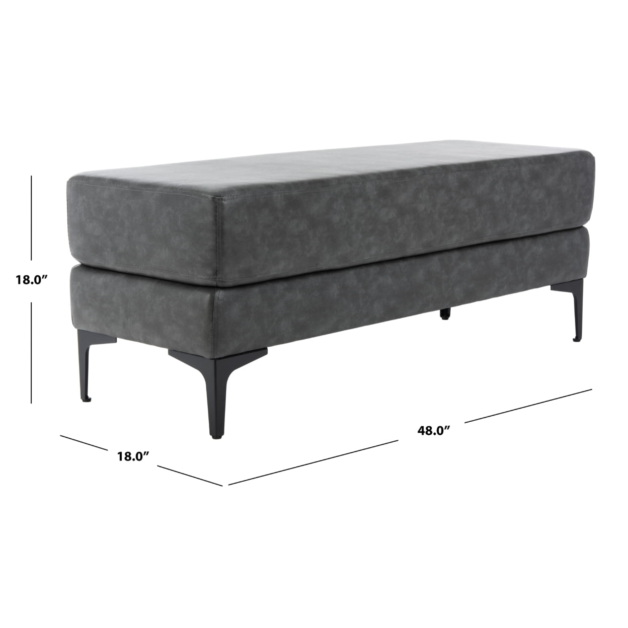 Contemporary design adds a chic look to your home Durable solid wood frame for long lasting longevity Minor assembly needed Color: Grey/Black Frame Color: Black Item Dimension: 48 in. W x 18 in. D x 18 in. H Upholstered with 100% Bicast Leather Item contains foam Item Weight: 26.4 lbs Weight capacity: 350 lbs. Accessories in life style photo(s) not included Please note: The images and product dimensions on our website are as accurate as possible. Due to differences in computer monitors, some furniture colors may vary slightly. Lengths and widths may vary from the published dimensions. We do our best to provide you with an exact measurement, but please be advised that some variation exists. To prevent overall soiling, frequent vacuuming or light brushing is recommended. Cushions and pillows should be turned on a weekly basis. Down-filled cushions should be brushed rather than vacuumed. Spot clean, using a mild water-free solvent or dry cleaning product. Only a professional cleaner should undertake a complete overall cleaning. The use of steam or water-based cleaners may cause excessive shrinking or staining.