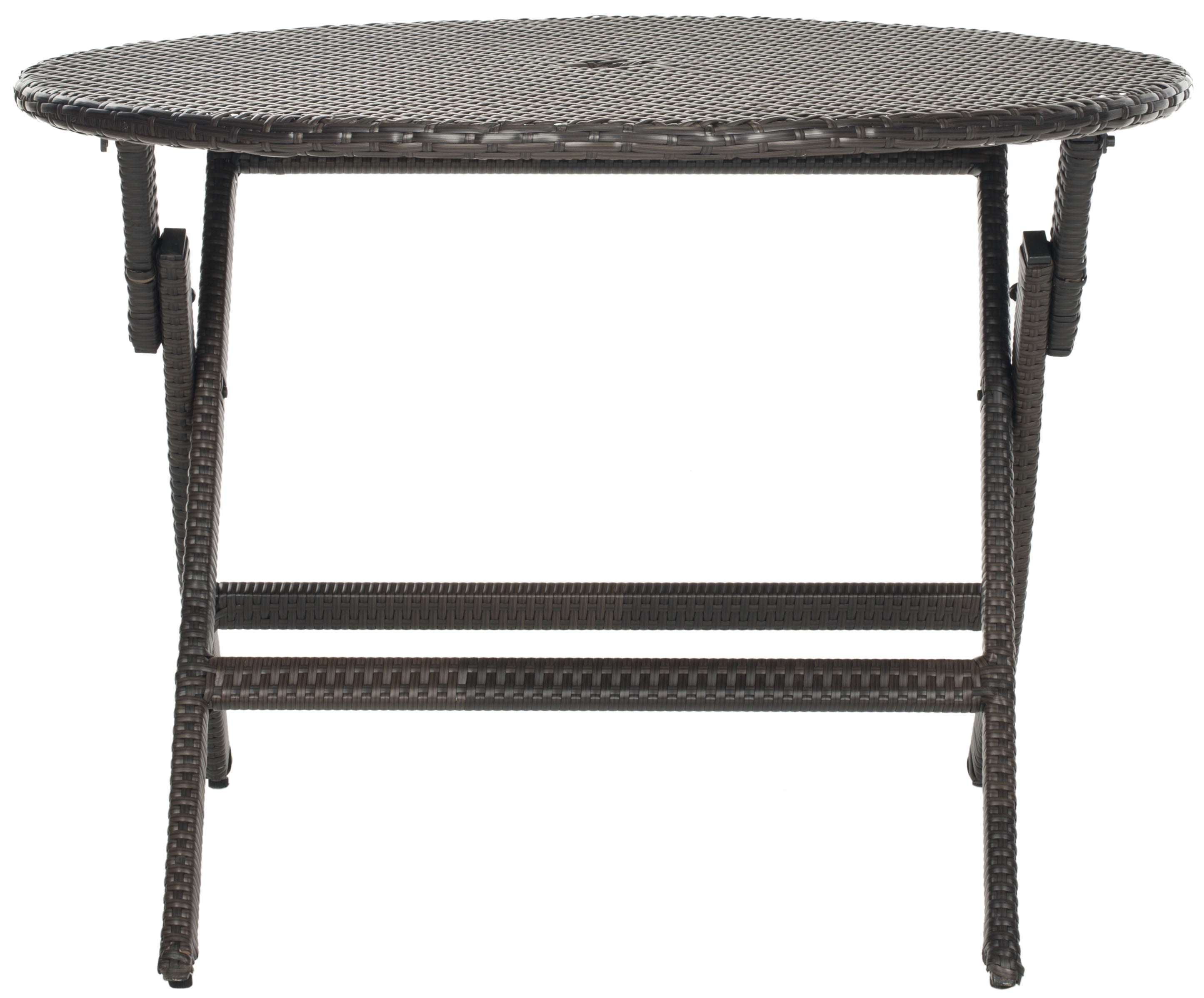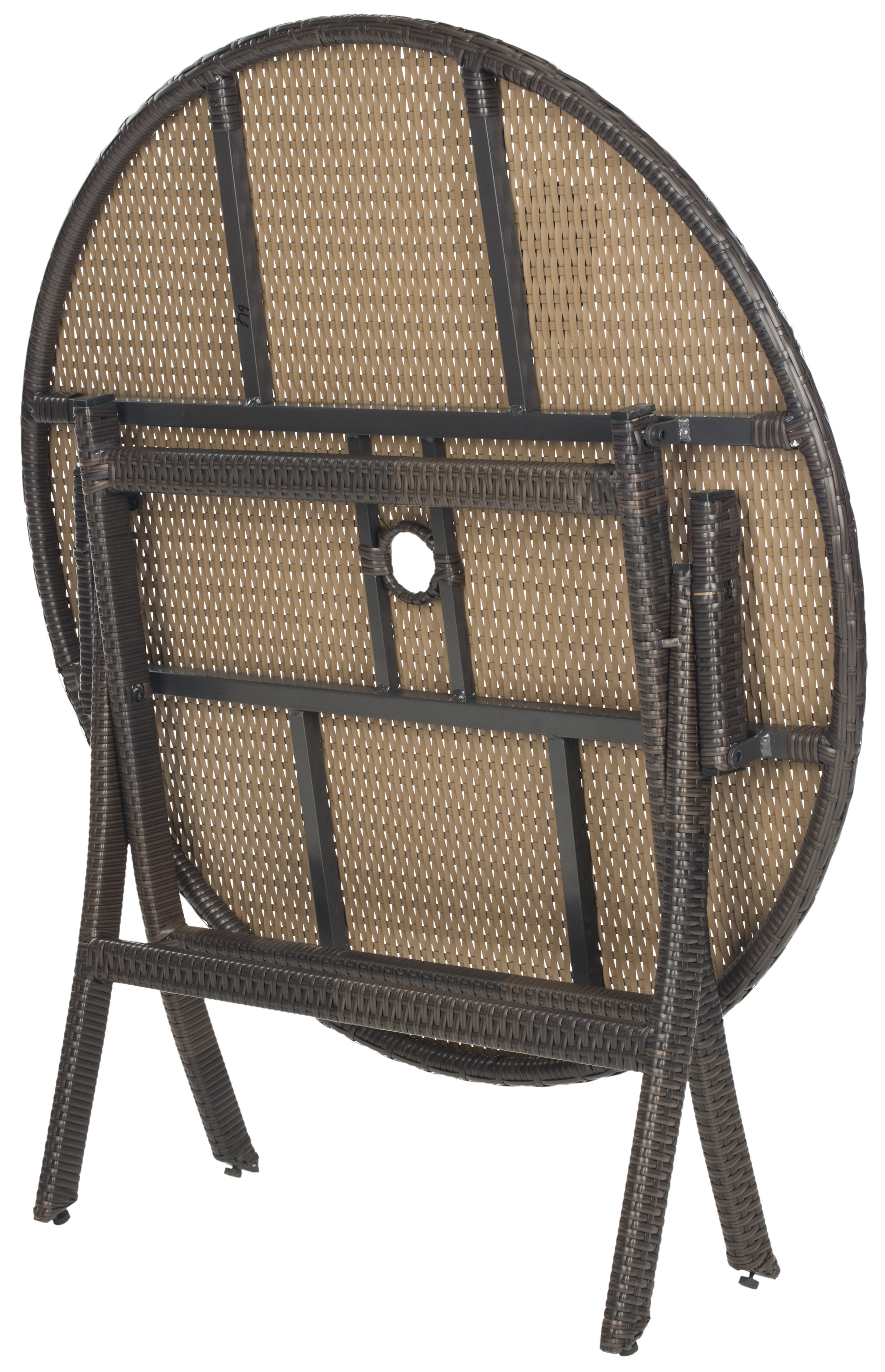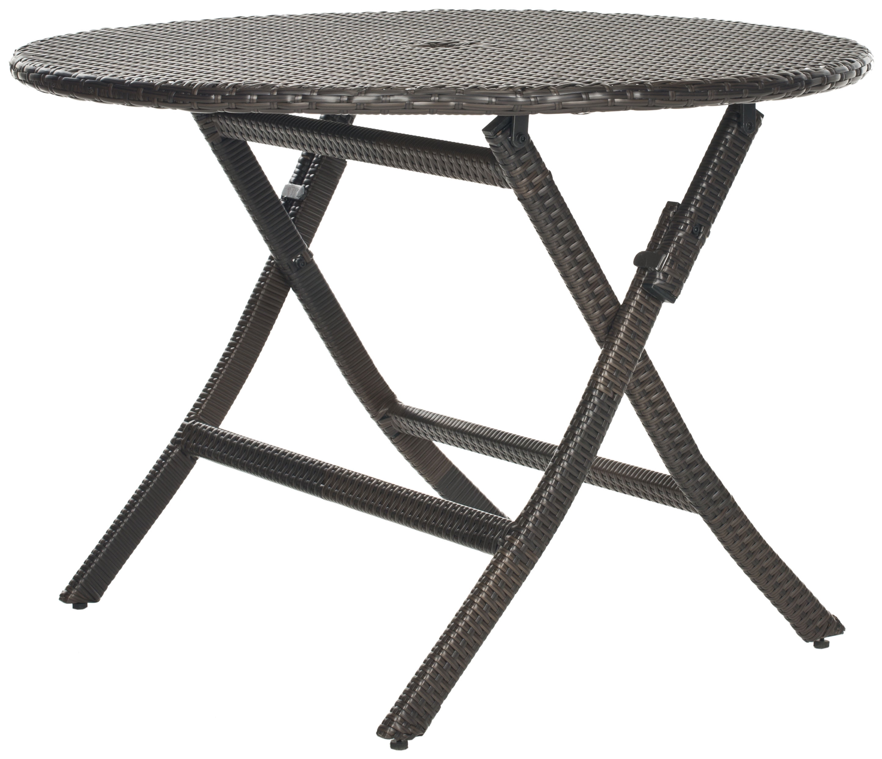 Shop Safavieh at . Save Money. Live Better. Safavieh Ellis Outdoor Patio Round Folding Table – Brown Made in the shade. The Ellis Round Folding Table brings the picnic home with its stylish tabletop, complete with a pre-made hole for an outdoor umbrella. Crafted with rattan in a brown finish, this sturdy piece is the foundation for outdoor fun.