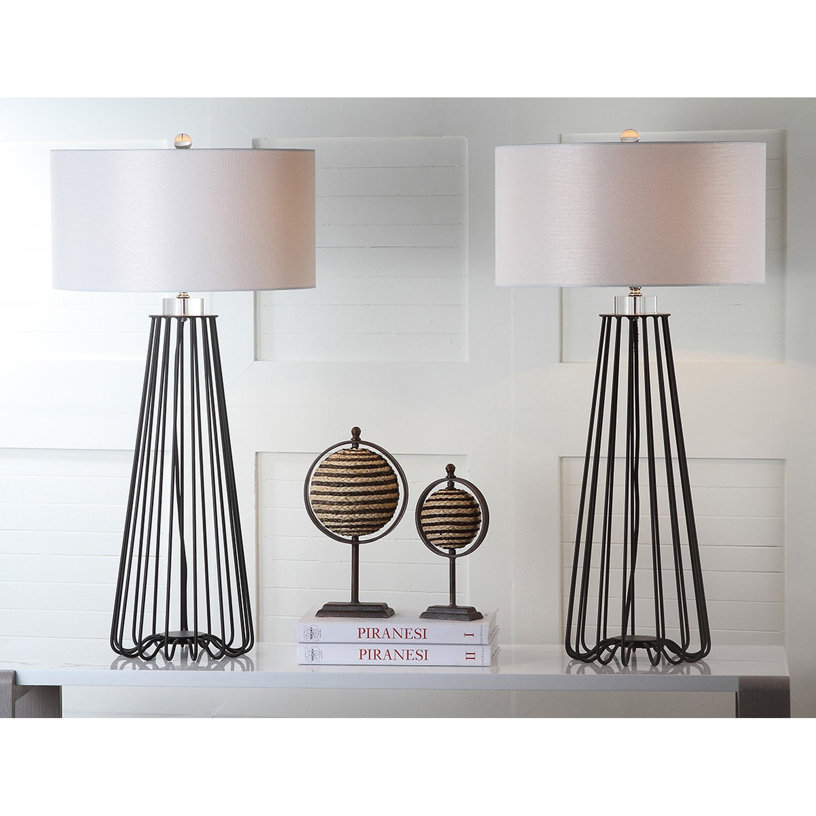 SAFAVIEH Estill Table Lamp (Set of 2) Industrial chic style at its finest, the Estill table lamp is crafted of strips of black metal artfully tapering up from its base. Topped with a white cotton drum shade and acrylic finial, this see through design lends a contemporary vibe to any space. Begin your rug, furniture, lighting, outdoor, and home decor search and discover over 100,000 SAFAVIEH products today.