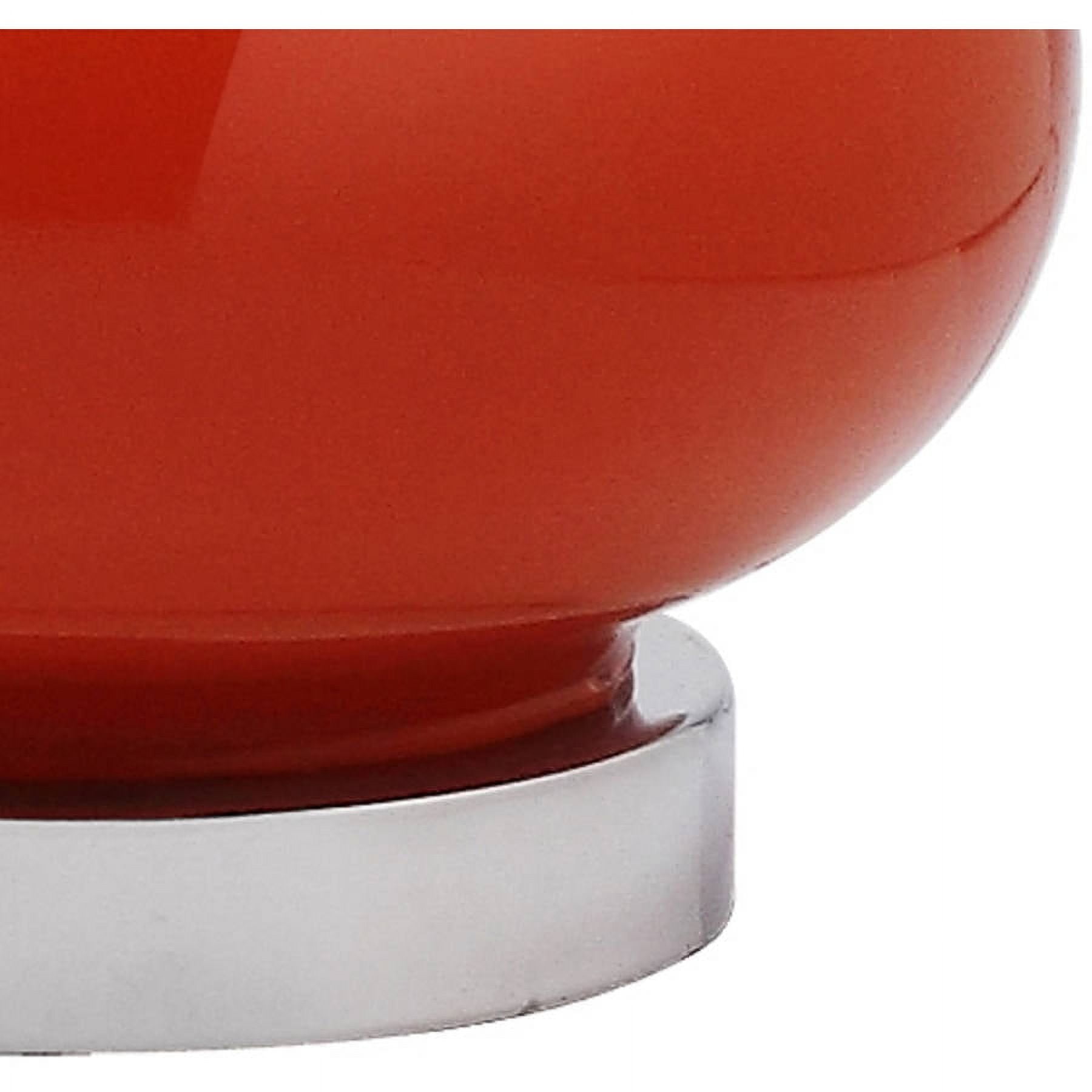 Contemporary design adds a chic look to your home Durable frame for long lasting longevity Easy to clean and maintain Minor assembly needed Color: Blood Orange Shade Color: Off-White Item Dimensions: 14 in. W x 14 in. D x 24 in. H Crafted with Glass Shade Material: 100% Cotton Shade Height: 10 in. H Shade Bottom Dimensions: 14 in. L x 14 in. W Shade Top Dimensions: 11 in. W x 11 in. L Traditional Harp Style Harp Color: Silver Harp Height: 7.5 in. H Cord Color: Light Grey Cord Length: 60 in. Lamp Body Dimensions: 8 in. W x 8 in. D x 11 in. H Bottom Base Dimension: 5.5 in. W x 5.5 in. D x 1 in. H Pendant Dimension: 60 in. Lamp Certification: UL Light Bulb Base Type: E26 Switch Mechanism: Rotary Switch Type of Bulb Included: CFL Max Wattage: 13W Lumen: 830 Quantity of Bulbs: 1 Accessories in life style photo(s) not included Please note: The images and product dimensions on our website are as accurate as possible. Due to differences in computer monitors, some item’s color may vary slightly. Before cleaning any lamp shade or fixture, disconnect the power source. Wipe with a soft, dry cloth. Avoid the use of chemicals and household cleaners as they may damage the finish.